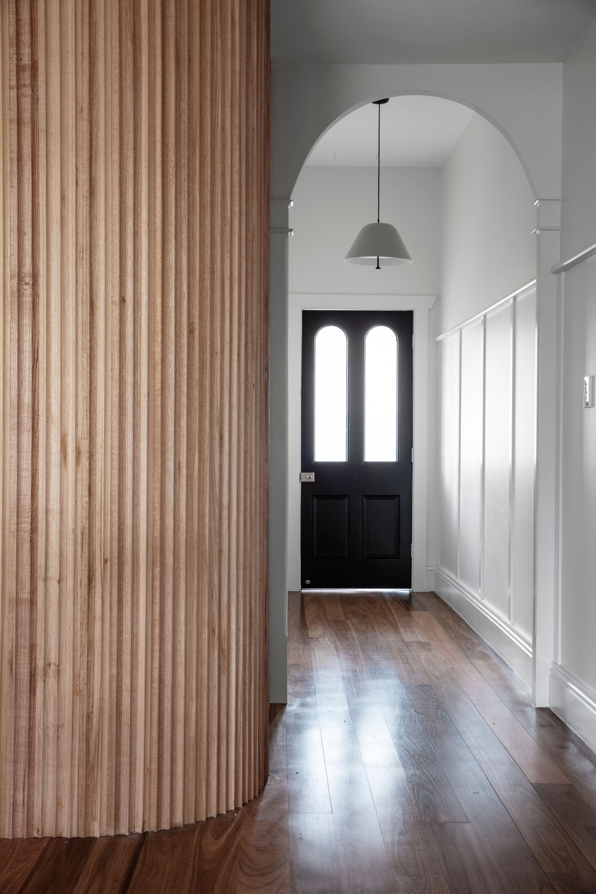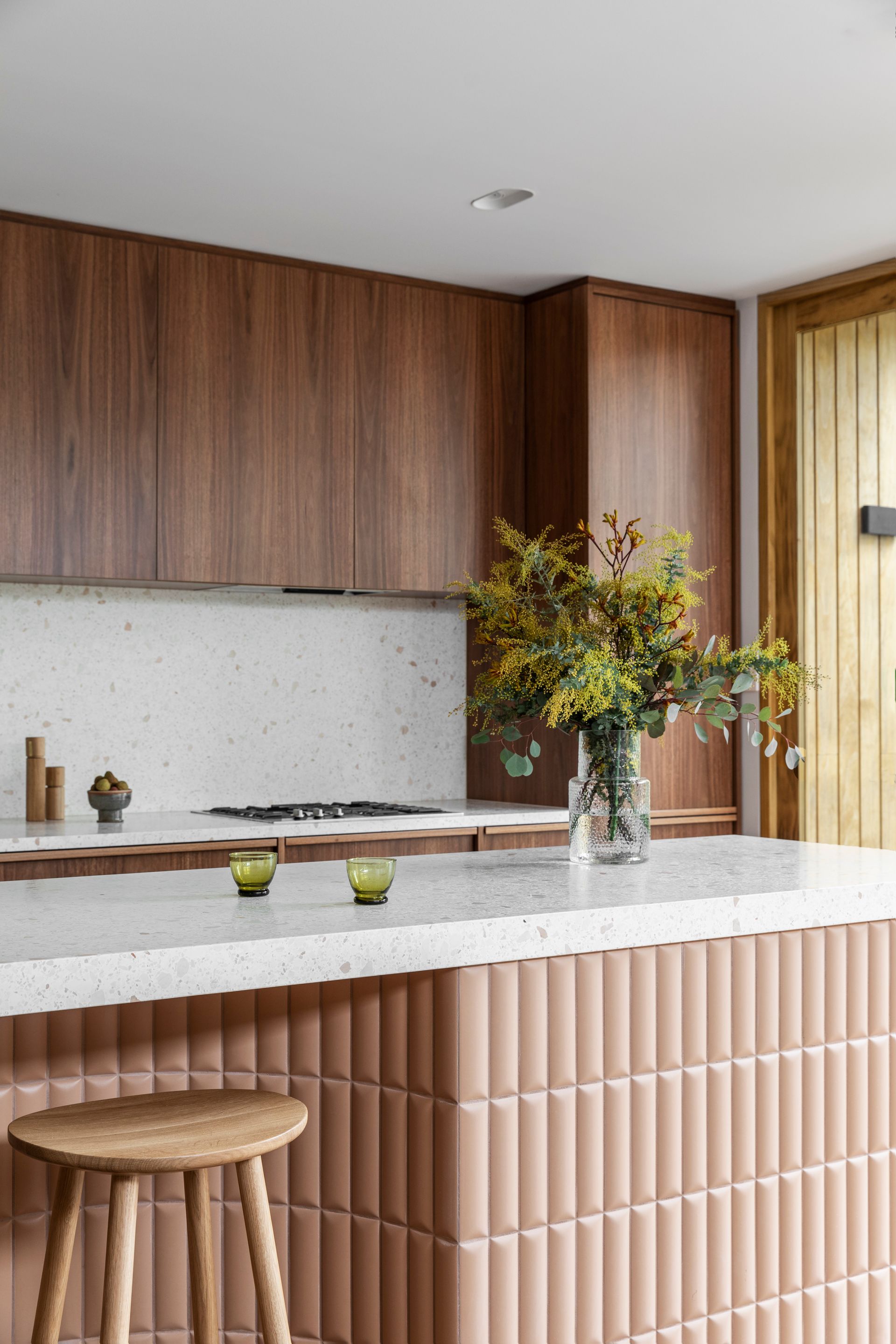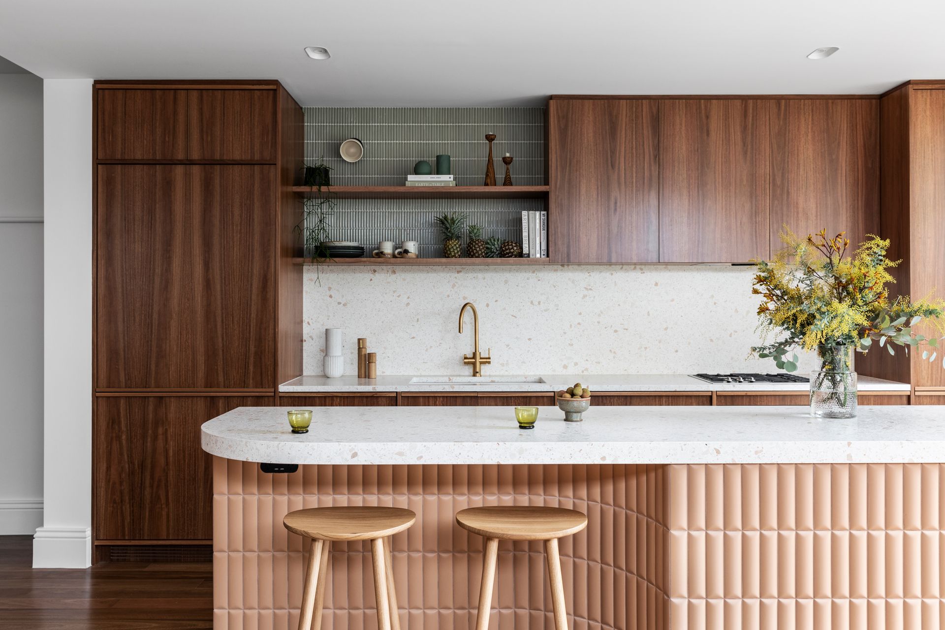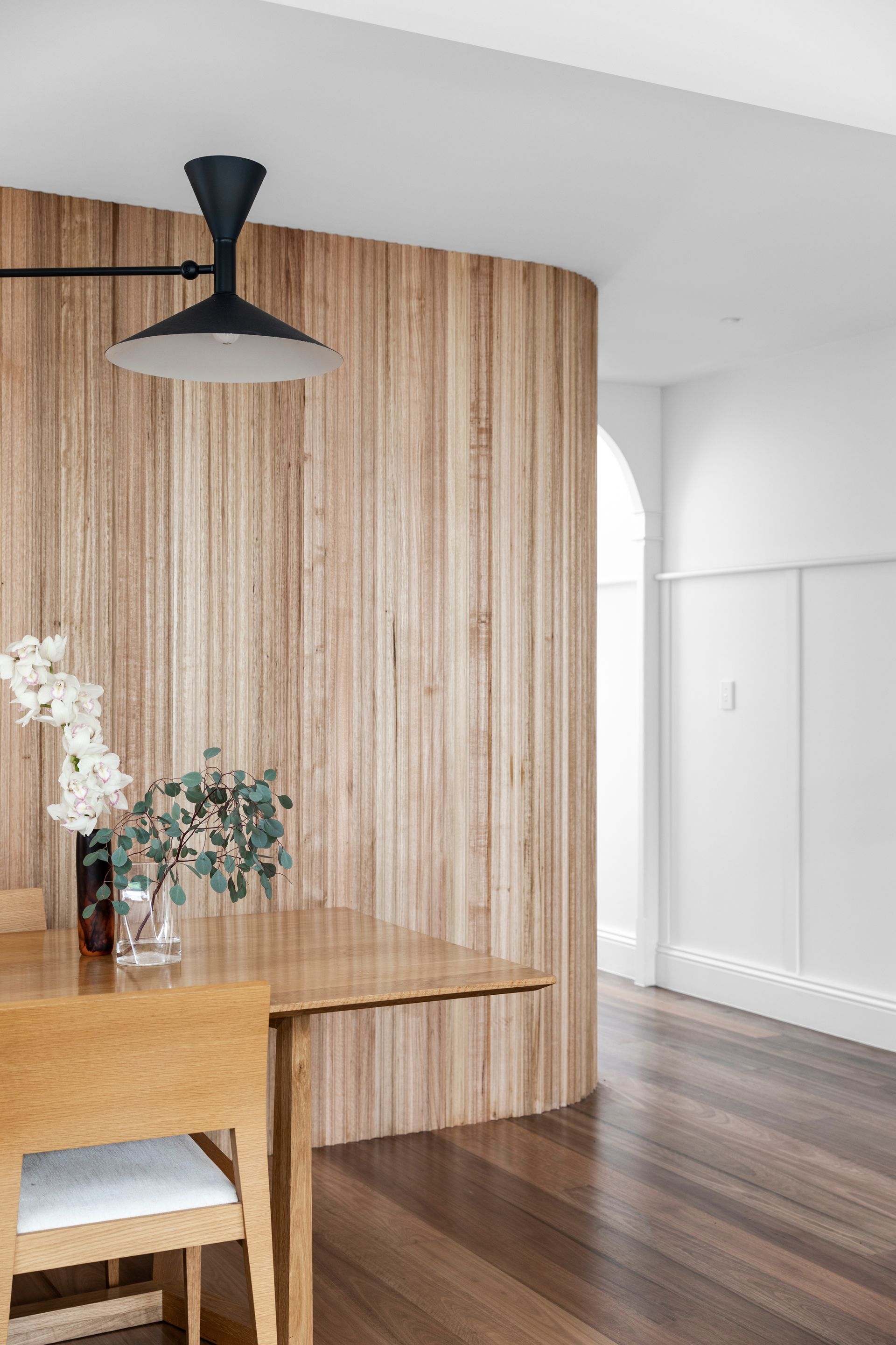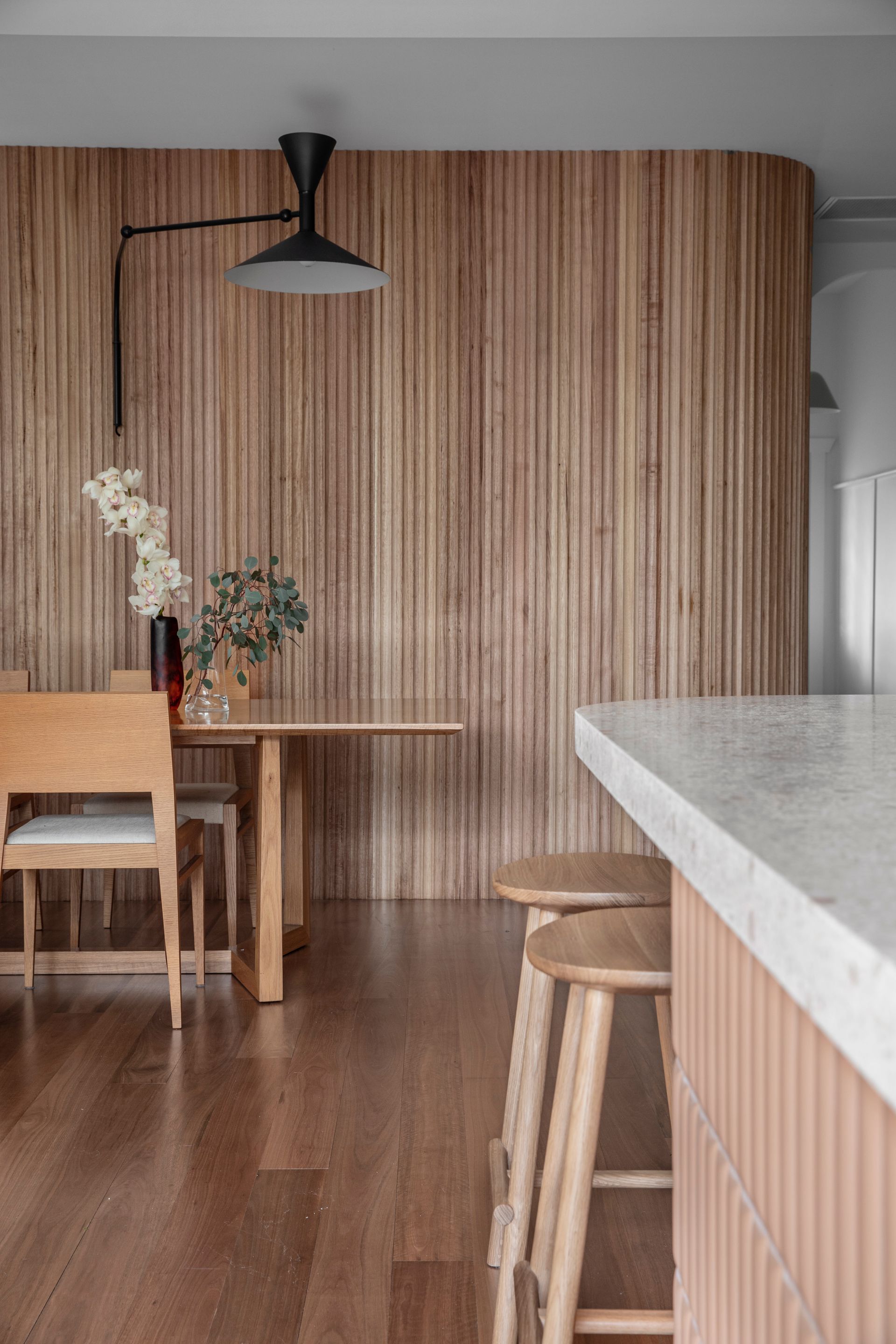 The kitchen centres on function wrapped in form. An electric built-in oven and dishwasher integrate into walnut cabinetry that prioritises clean surfaces over visible clutter. The curved timber wall becomes the room's signature, its vertical fluting catching light as the day shifts. Dining unfolds at a timber table positioned between kitchen and lounge, where the open plan naturally draws people together. Overhead lighting is architectural and minimal, keeping focus on the materials and spatial flow.