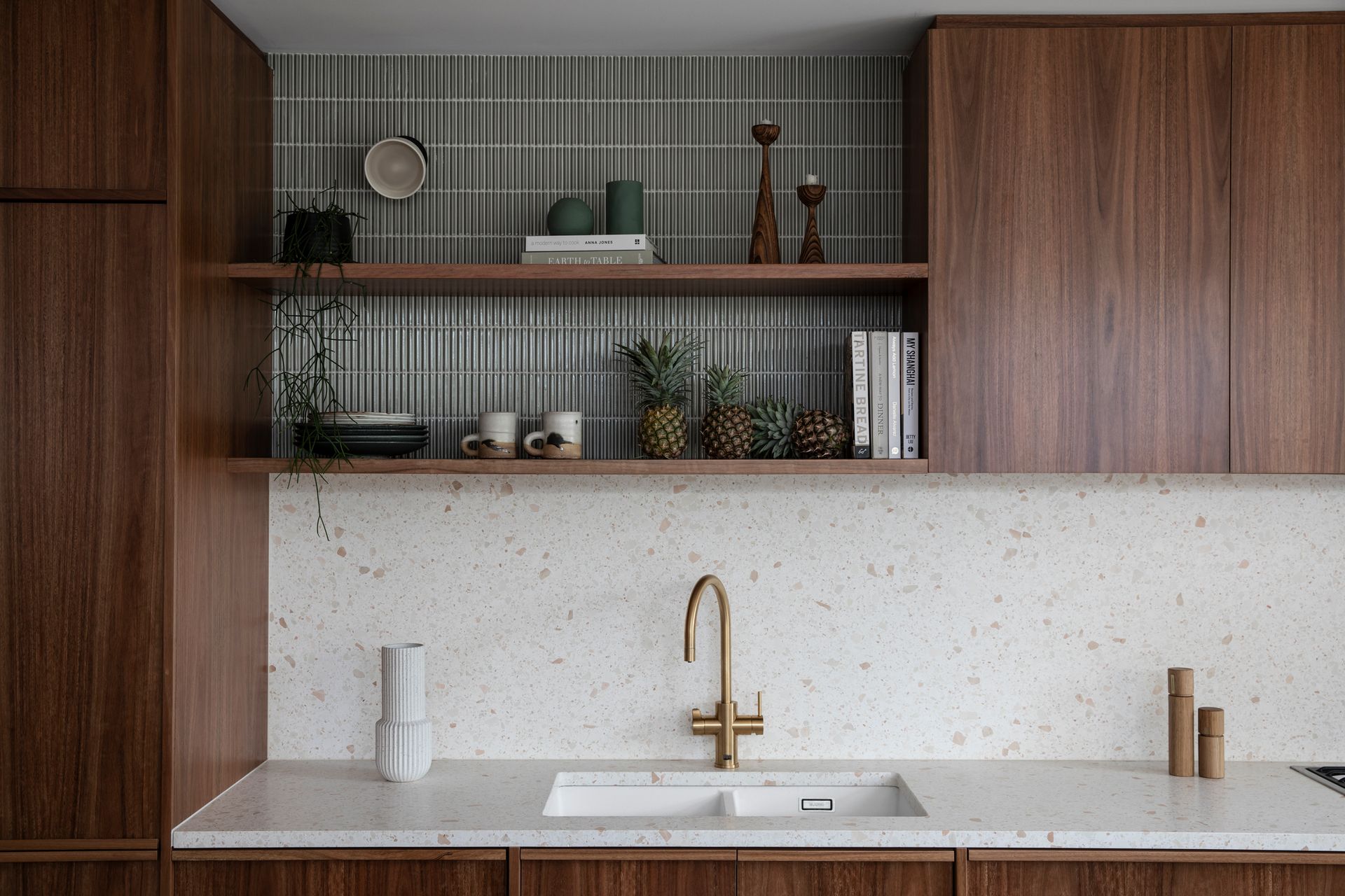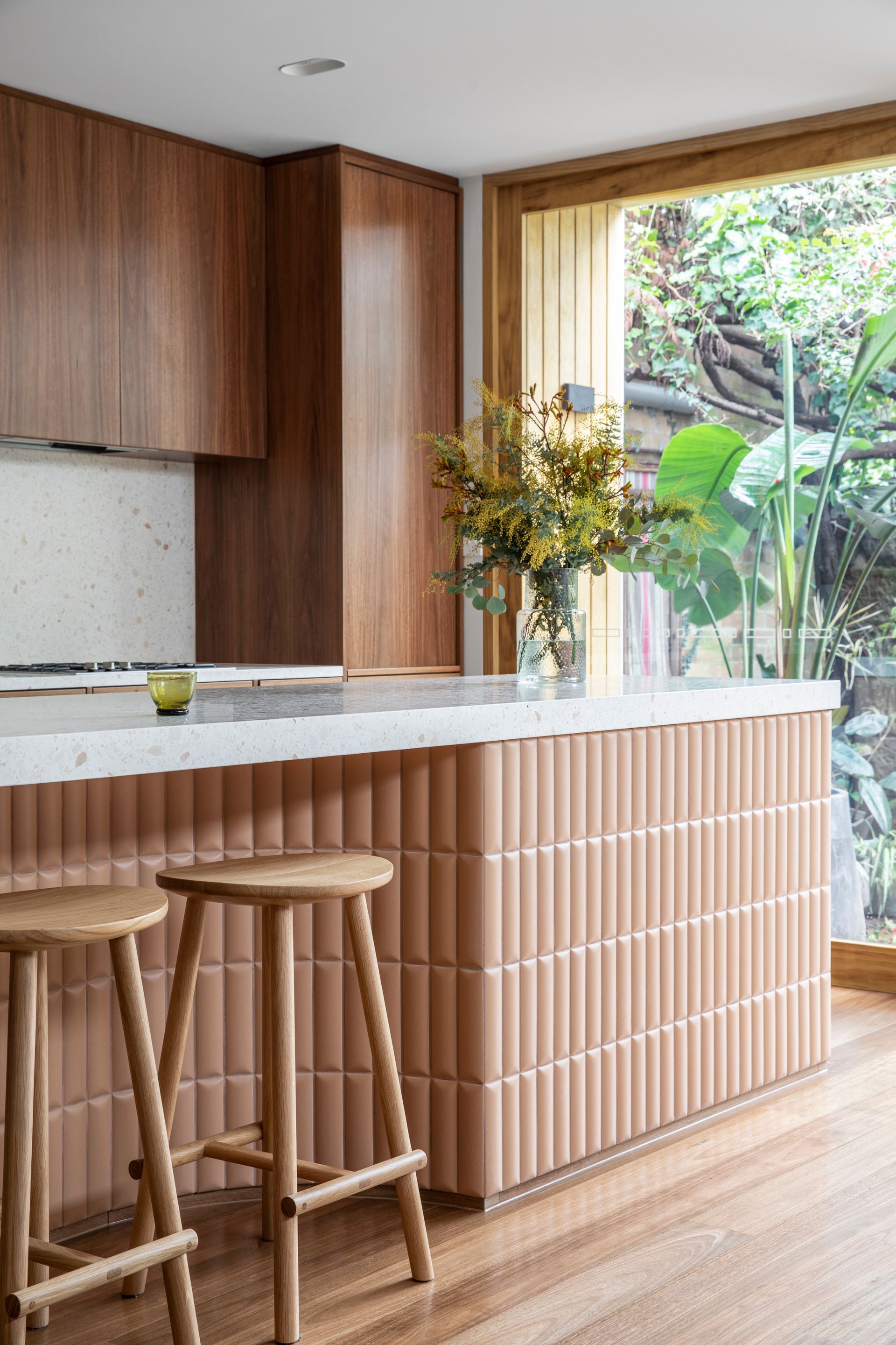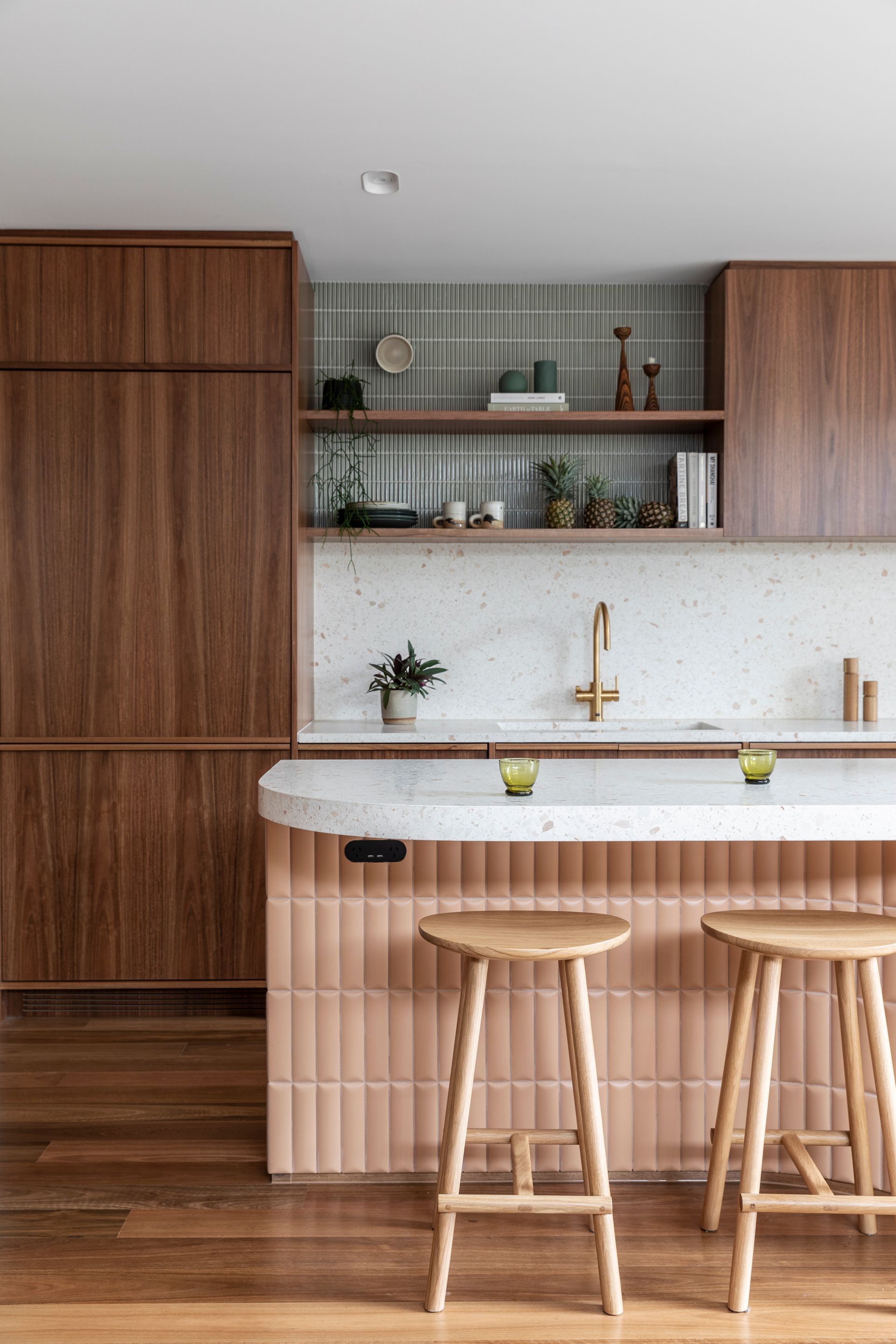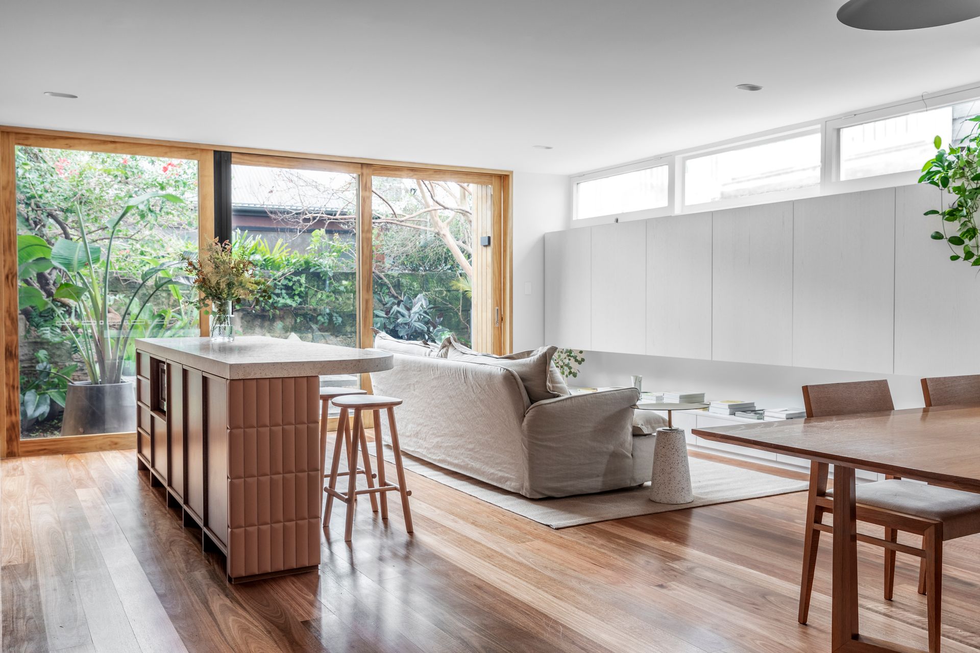 Light pours through timber framed windows into an open plan ground floor that connects without compromise. The kitchen anchors the space with its curved timber feature wall, a sculptural element that softens the room while providing subtle separation between cooking and lounging. Pale terrazzo benchtops sit against walnut cabinetry, while fluted detailing on the island brings texture without fuss. The space flows seamlessly to a rear courtyard garden, where established greenery provides privacy and shade. Upstairs, a private balcony extends the queen bedroom into open air. The outdoor zones work year round, equipped with BBQ facilities for spontaneous meals and built-in lounging that turns evenings into lingering occasions.