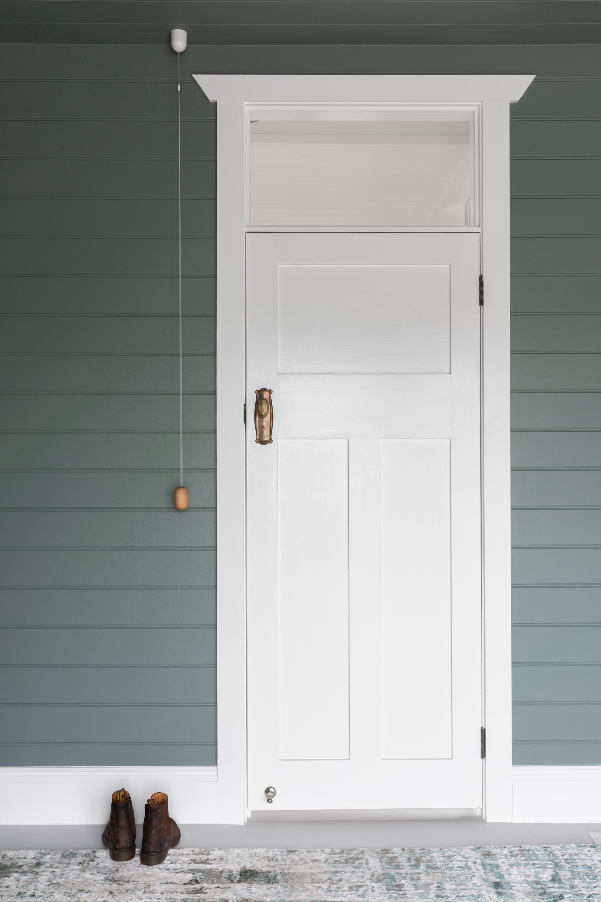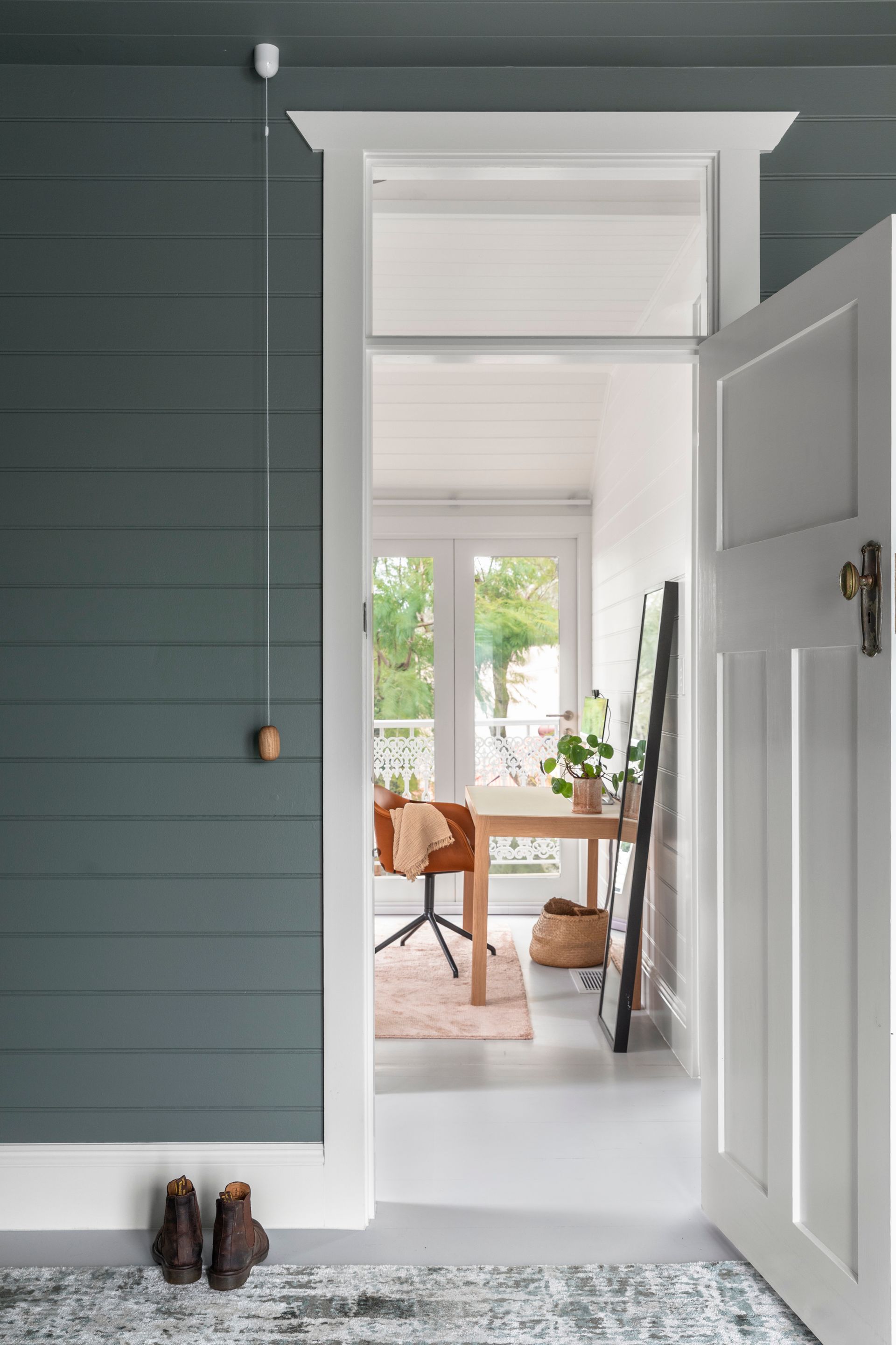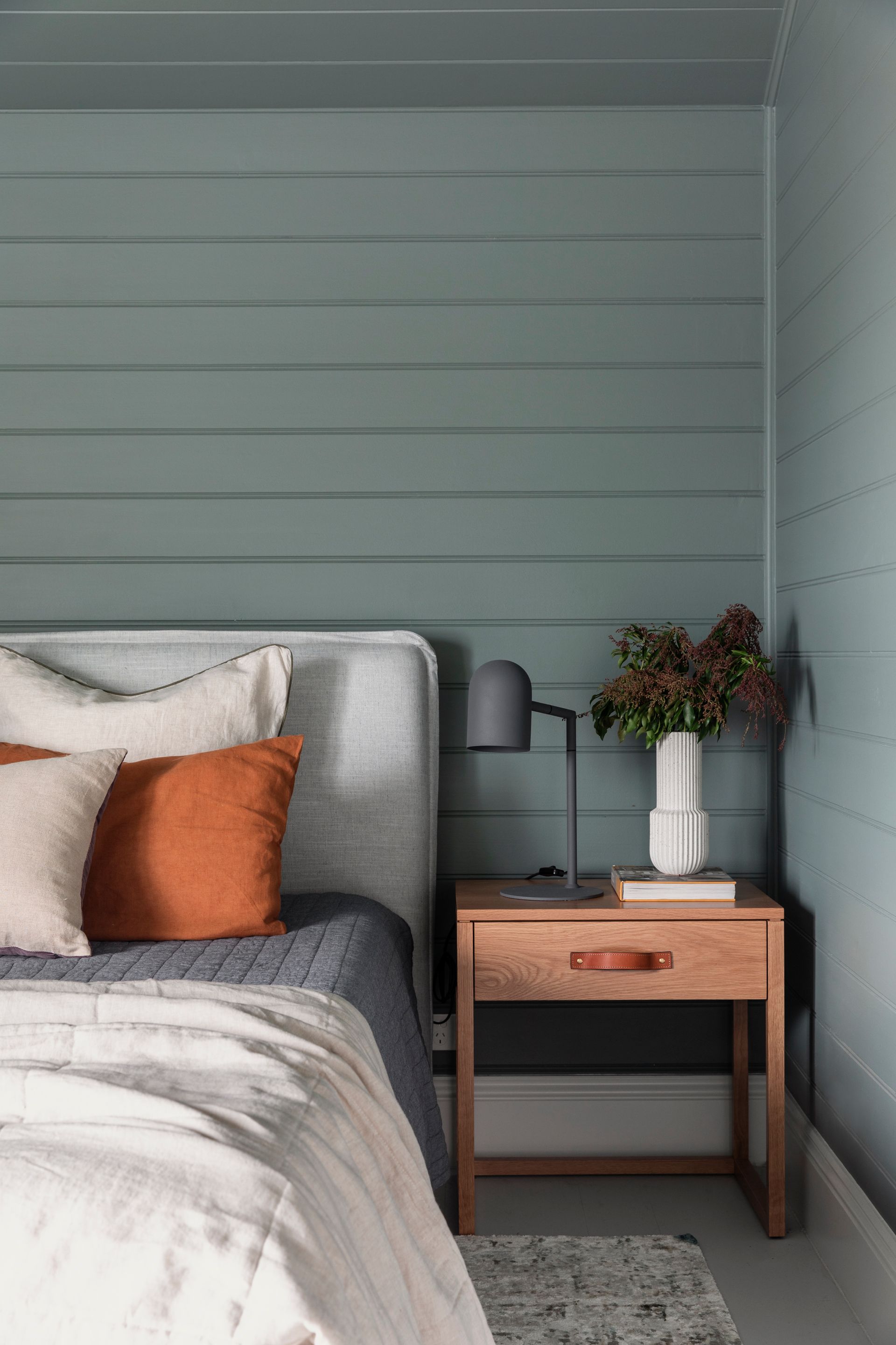 The upper level queen bedroom opens directly onto its private balcony, where mornings start with coffee above the treetops and glimpses of neighbouring heritage rooflines. Horizontal timber cladding in soft sage wraps the room in calm, while natural light filters through sheer curtains. On the ground floor, the king bedroom offers a quiet retreat that’s perfect for guests or a family member seeking a little extra privacy.