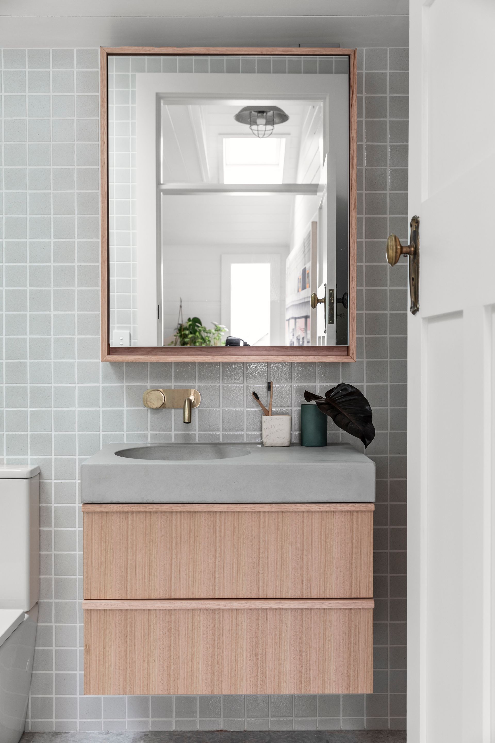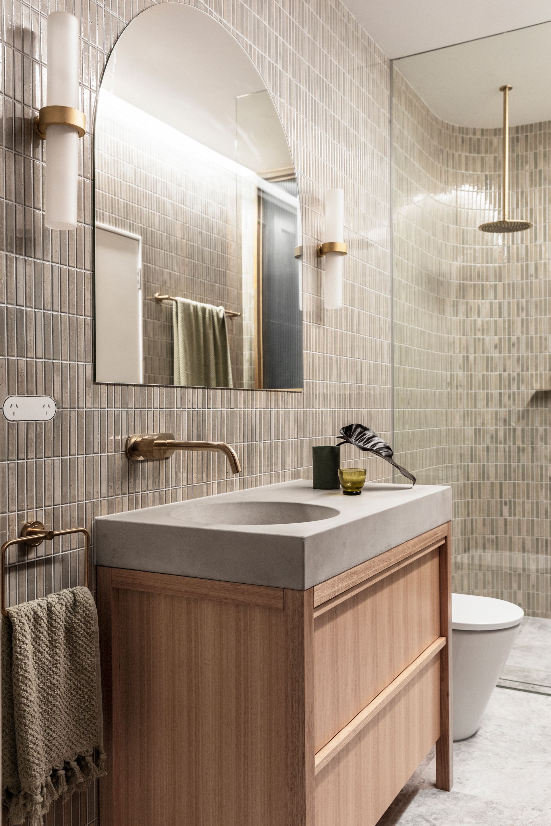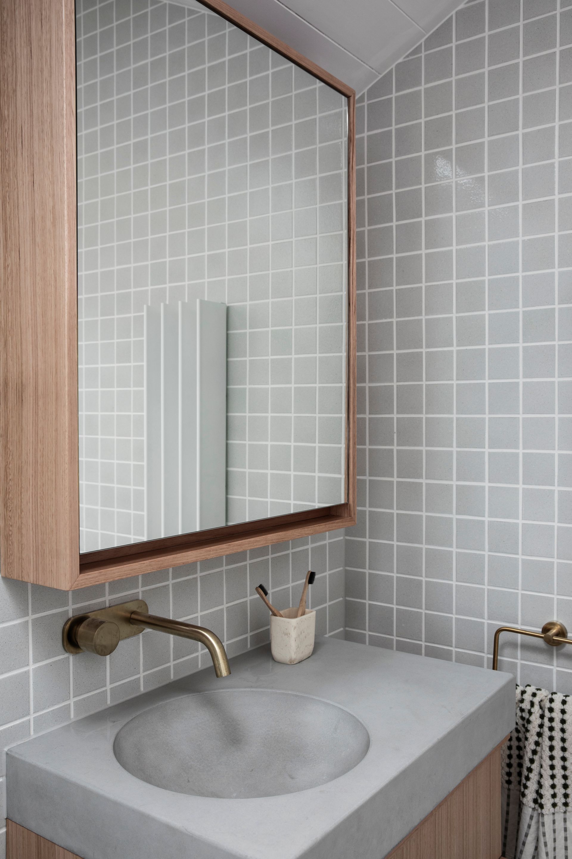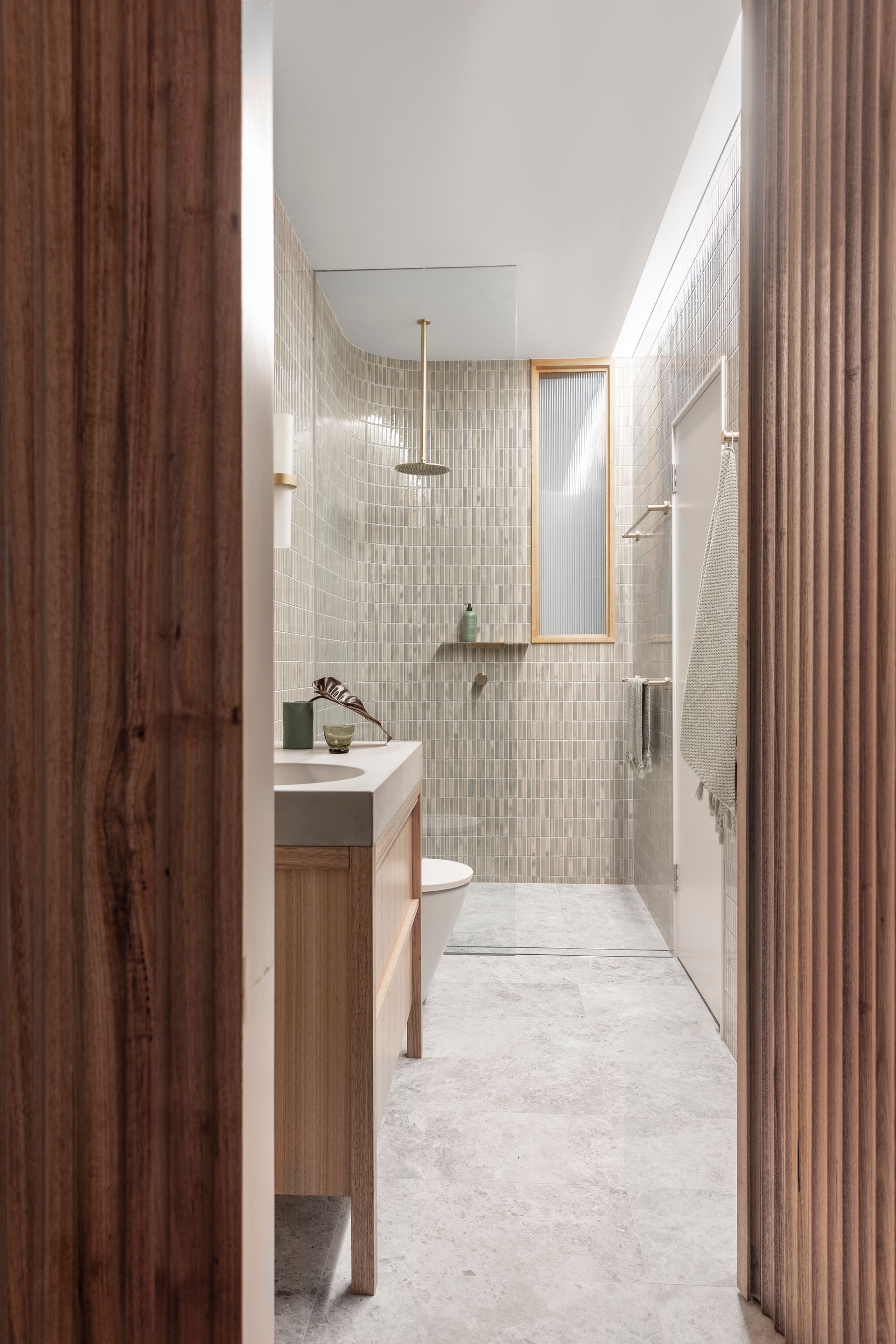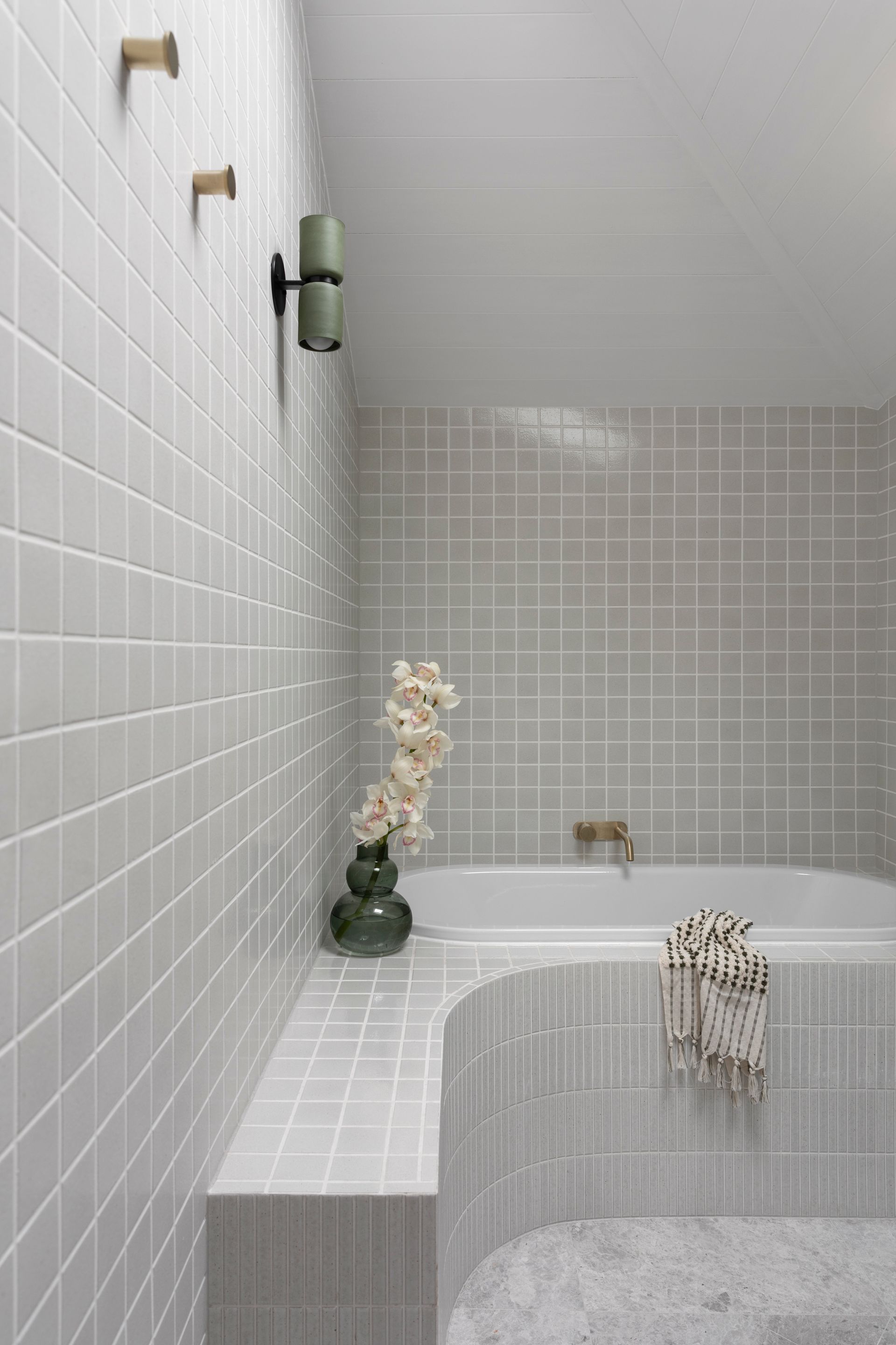 The main bathroom features pale mosaic tiling floor to ceiling, creating a cohesive shell around a built-in bath beneath a skylight. Brass fixtures add warmth, while a separate shower handles daily needs. The ground floor shower room continues the mosaic treatment with the same palette. The washer and dryer sit within the bathroom. Ducted air conditioning runs throughout both levels.