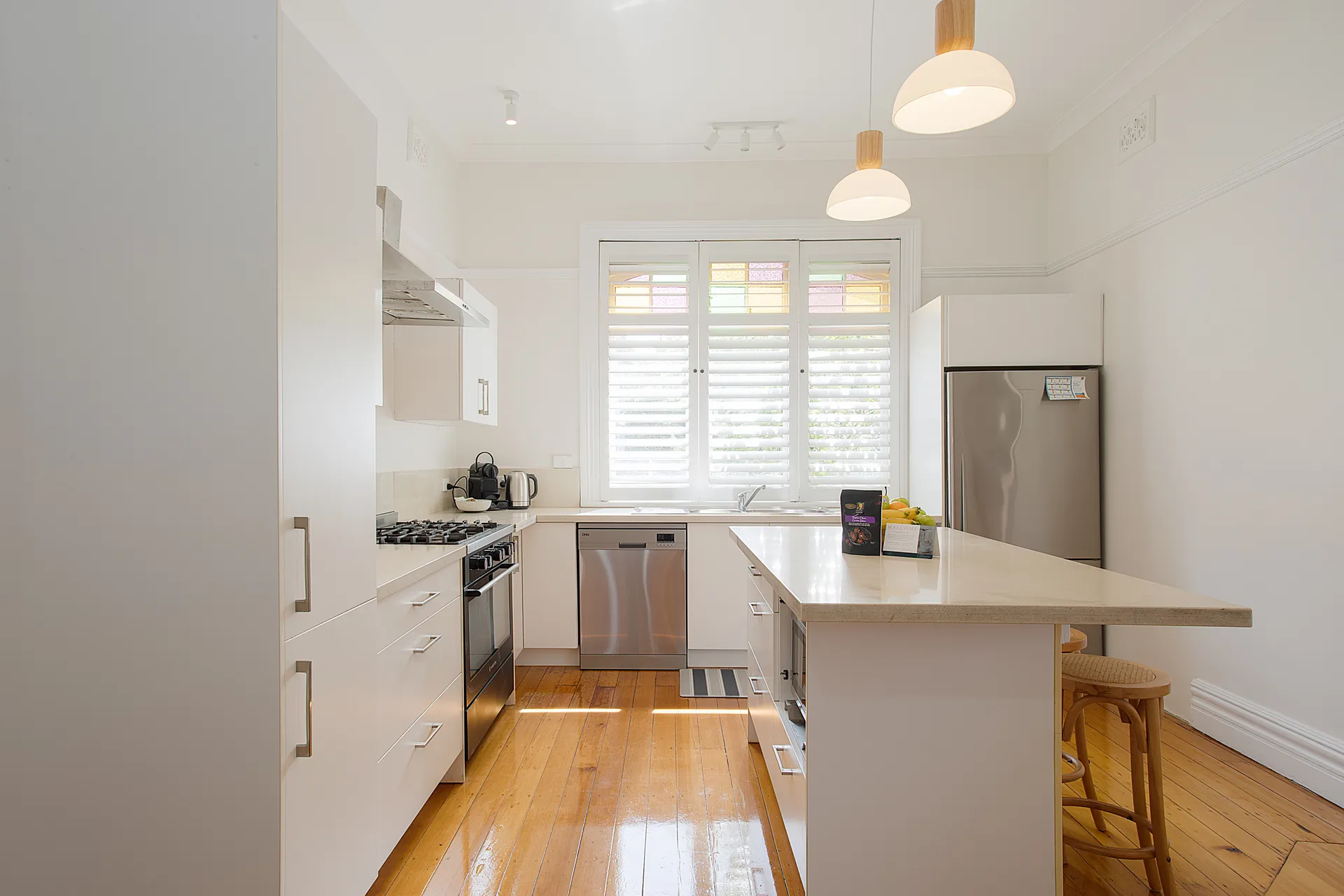 The kitchen integrates seamlessly into the open plan living area, designed for both culinary experience and easy entertaining. Sleek white cabinetry provides abundant storage, while modern appliances including gas cooktop, oven, microwave, full size fridge and freezer and dishwasher handle everything from quick breakfasts to dinner feasts. A breakfast bar with seating creates the perfect spot for morning coffee or casual meals, while the adjacent dining area offers ample space for larger gatherings.