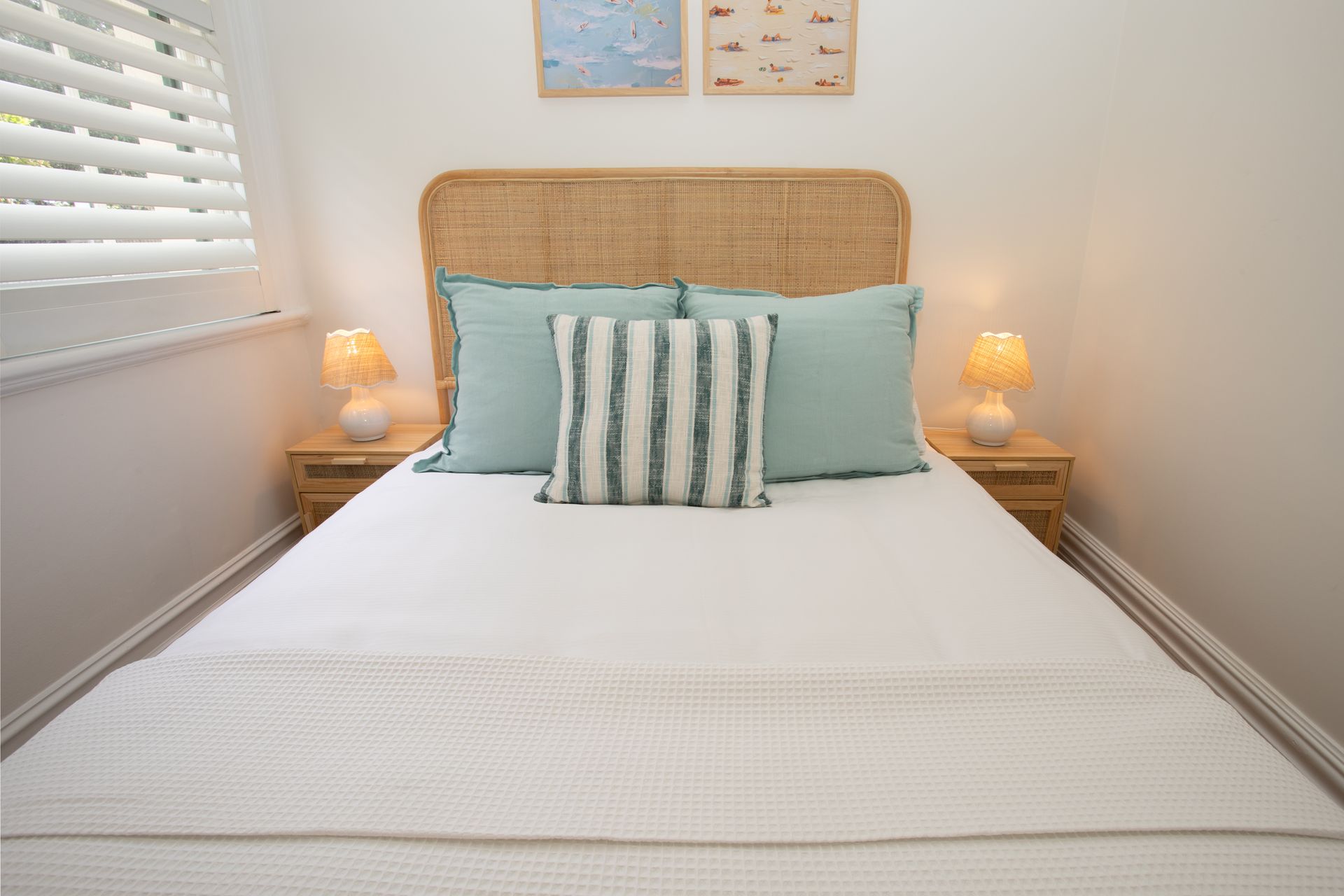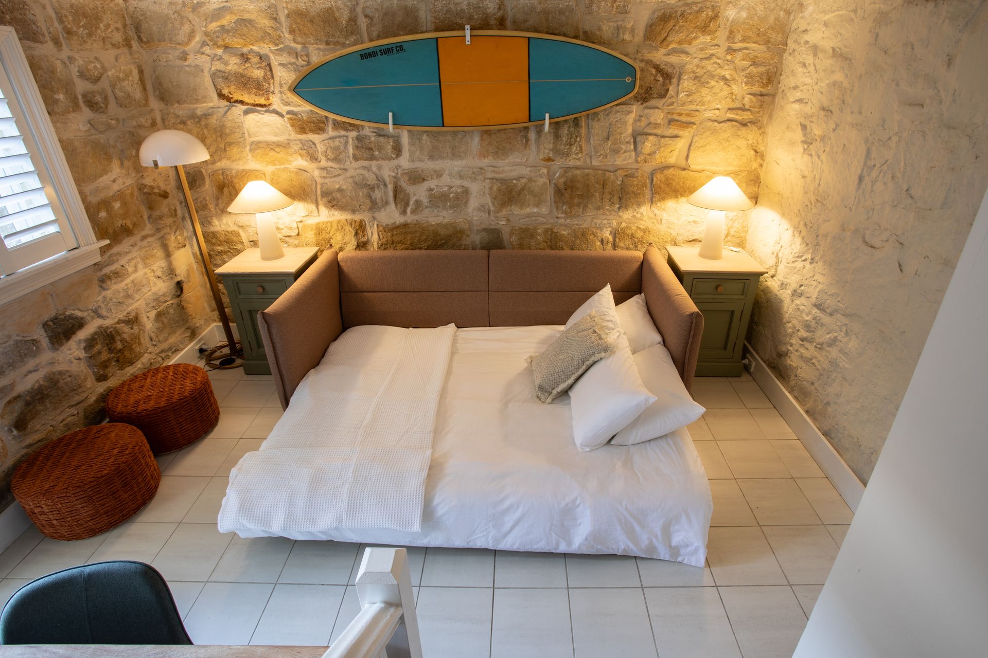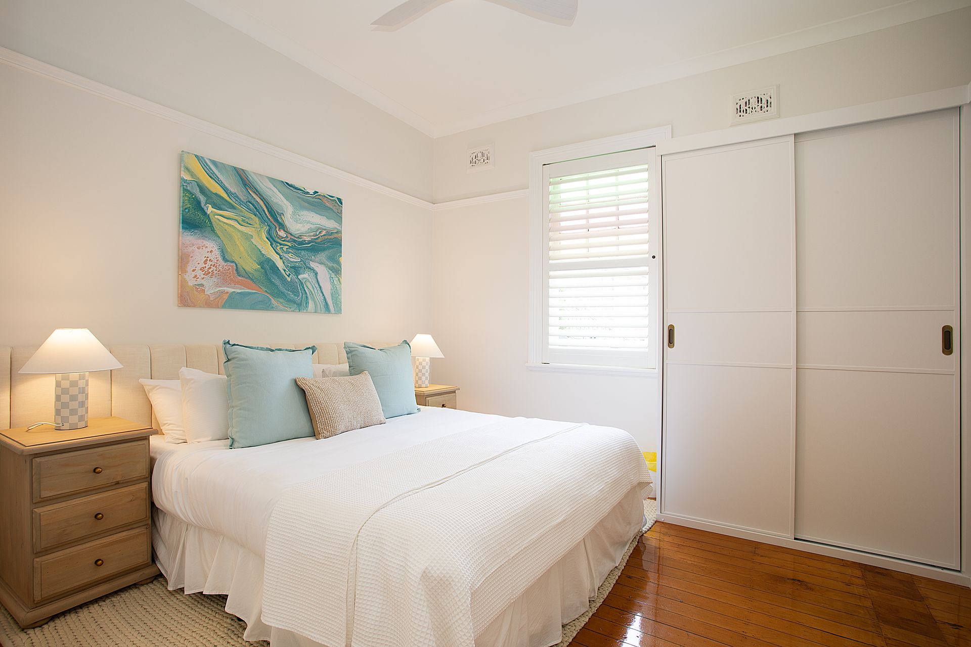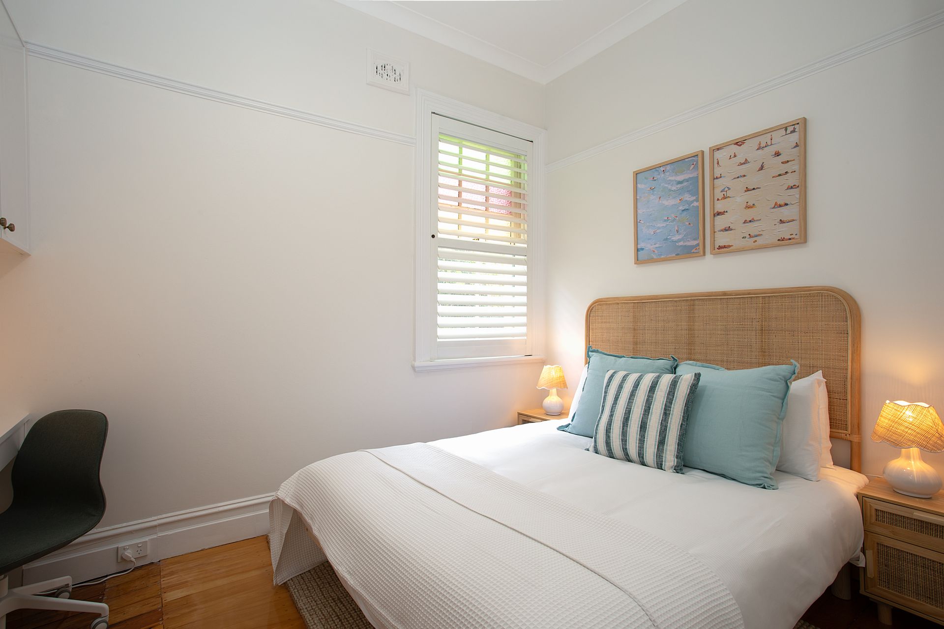 Four bedrooms are spread throughout the home, each designed as a private sanctuary. The primary suite features a luxurious king bed with premium linens and the unique flexibility to split into two long single beds, ideal for adaptable sleeping arrangements. The first guest bedroom offers a queen bed with coastal inspired styling, while the second guest bedroom features a double bed. The lower ground floor hosts the fourth sleeping space with a queen sofa bed, perfect for additional guests or teenagers seeking their own zone. Every bedroom features ceiling fans and exterior double-brick walls to keep the rooms naturally cool, while blackout blinds ensure undisturbed sleep after big beach days.