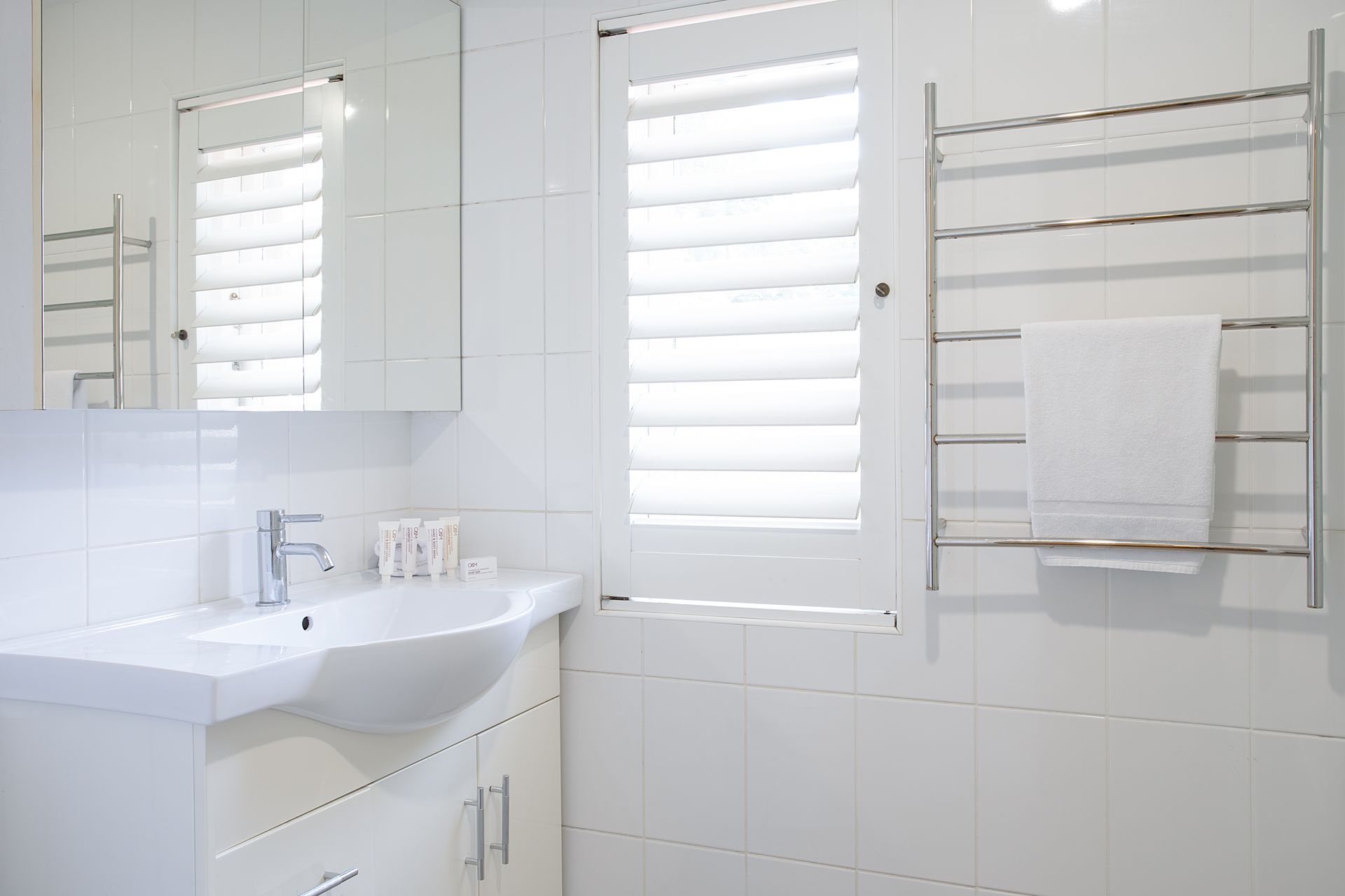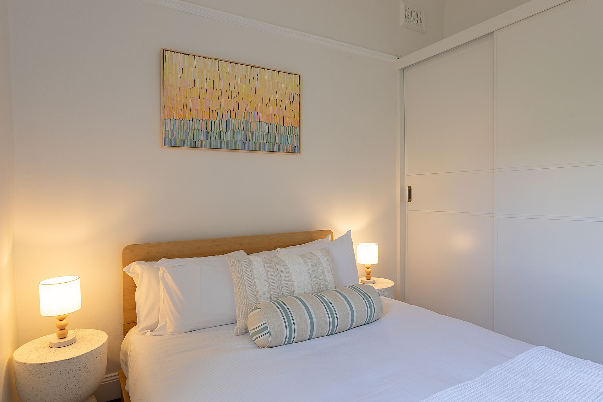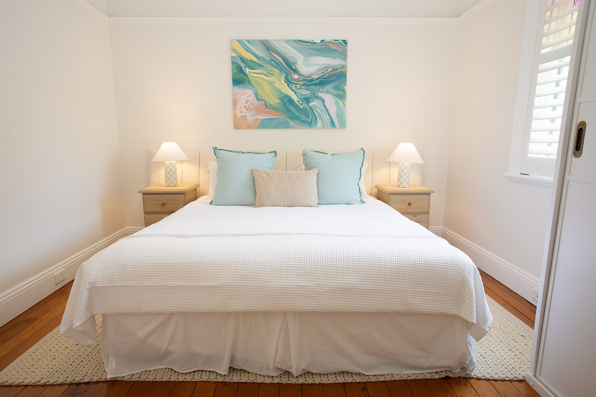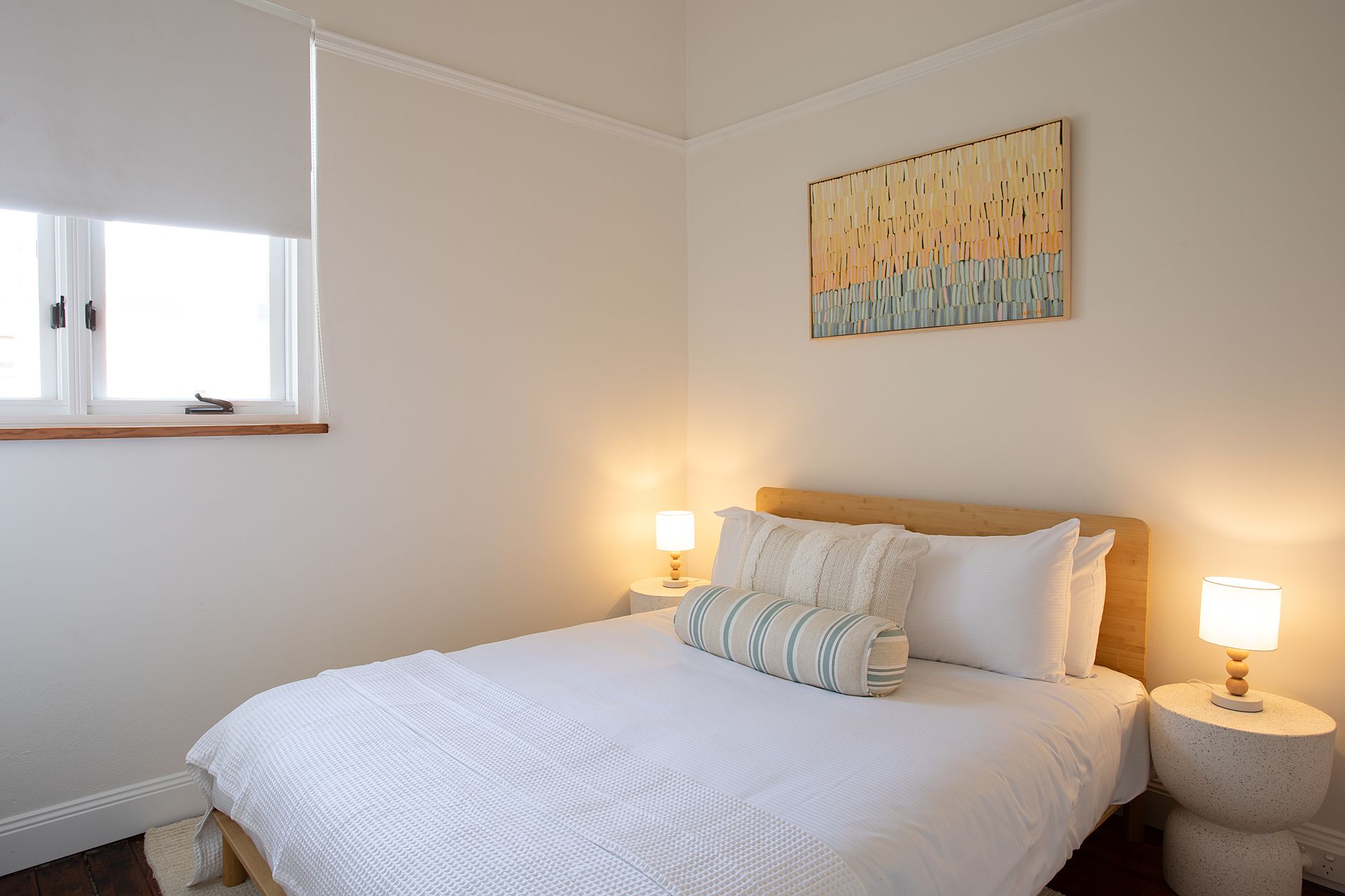 Four bedrooms are spread throughout the home, each designed as a private sanctuary. The primary suite features a luxurious king bed with premium linens and the unique flexibility to split into two long single beds, ideal for adaptable sleeping arrangements. The first guest bedroom offers a queen bed with coastal inspired styling, while the second guest bedroom features a double bed. The lower ground floor hosts the fourth sleeping space with a queen sofa bed, perfect for additional guests or teenagers seeking their own zone. Every bedroom features ceiling fans and exterior double-brick walls to keep the rooms naturally cool, while blackout blinds ensure undisturbed sleep after big beach days.