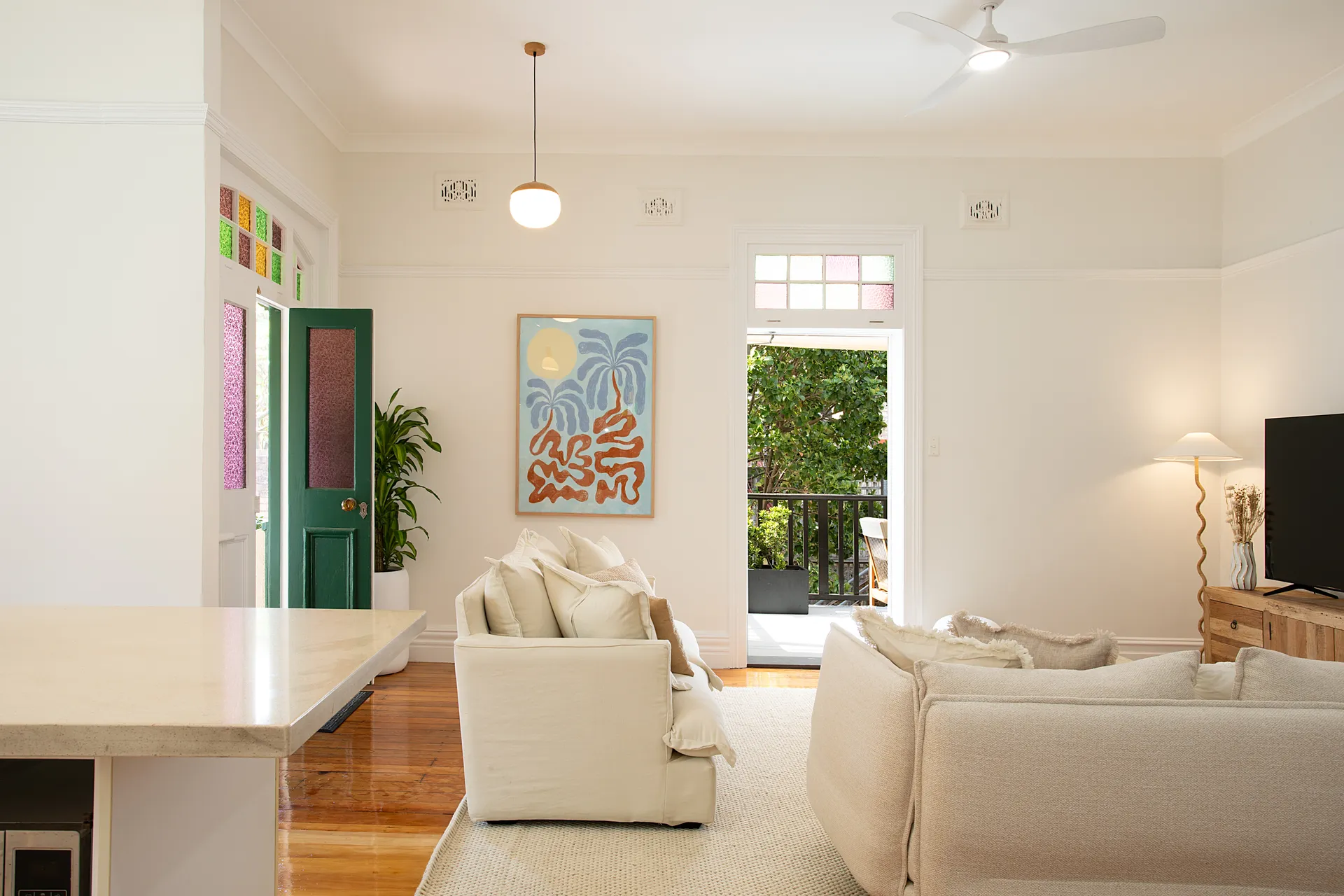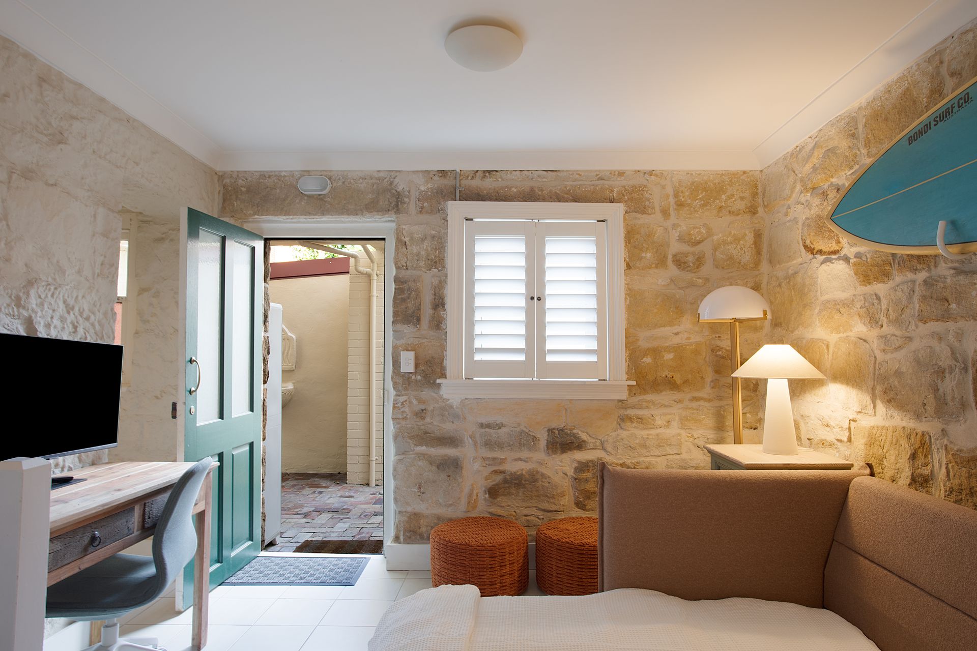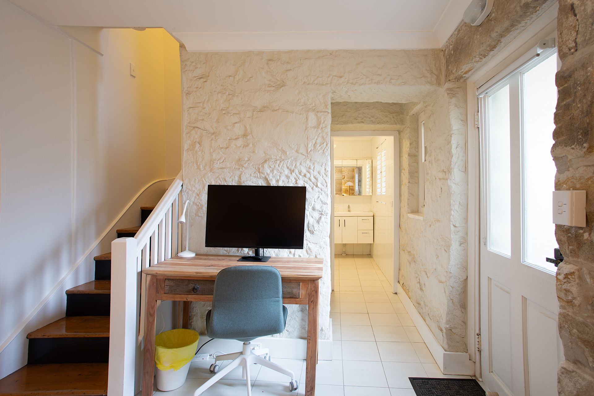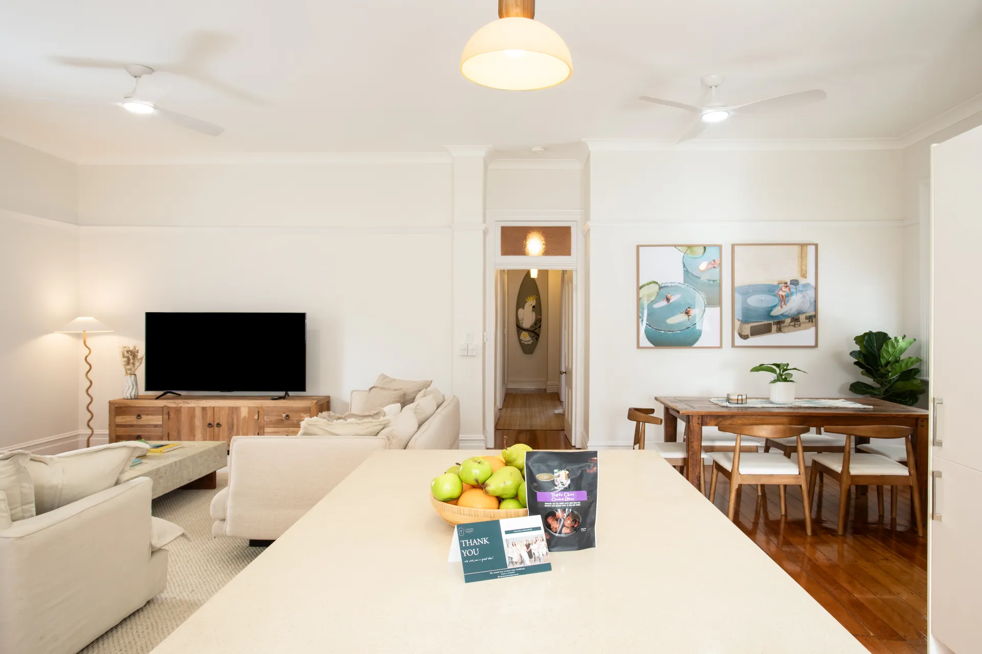 The heart of the home flows across an open plan living and dining area, where natural light pours through large windows, ceiling fans keep the coastal breeze circulating and double brick walls keep the interior naturally cool. This expansive space effortlessly accommodates gatherings of all sizes. Step out to your private balcony, complete with BBQ facilities, where sun loungers invite you to soak up the sunshine or unwind with sundowners as the day fades. The lower ground floor extends your living space with additional room to spread out, featuring a versatile queen sofa bed, direct access to the garden and a desk with smart monitor. The smart monitor doubles as a smart TV, or a monitor for your computer - perfect for work or entertainment.