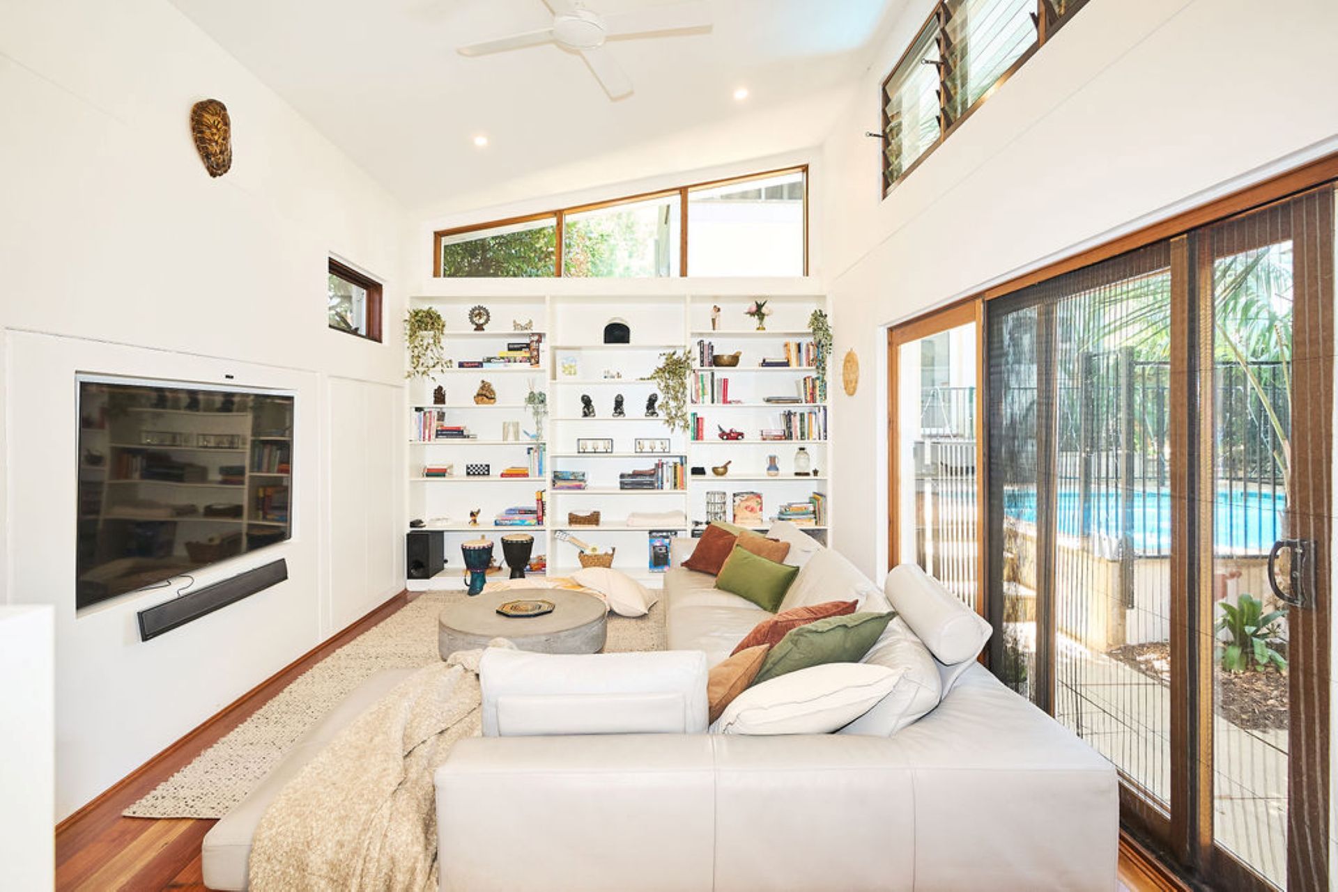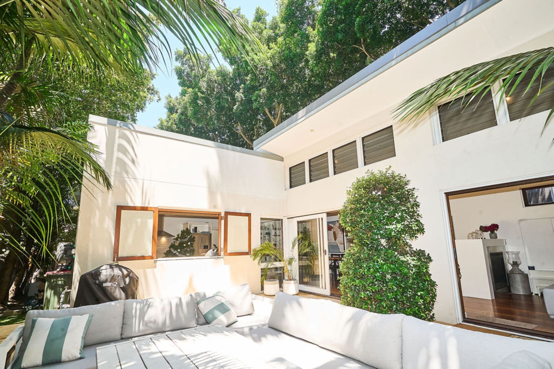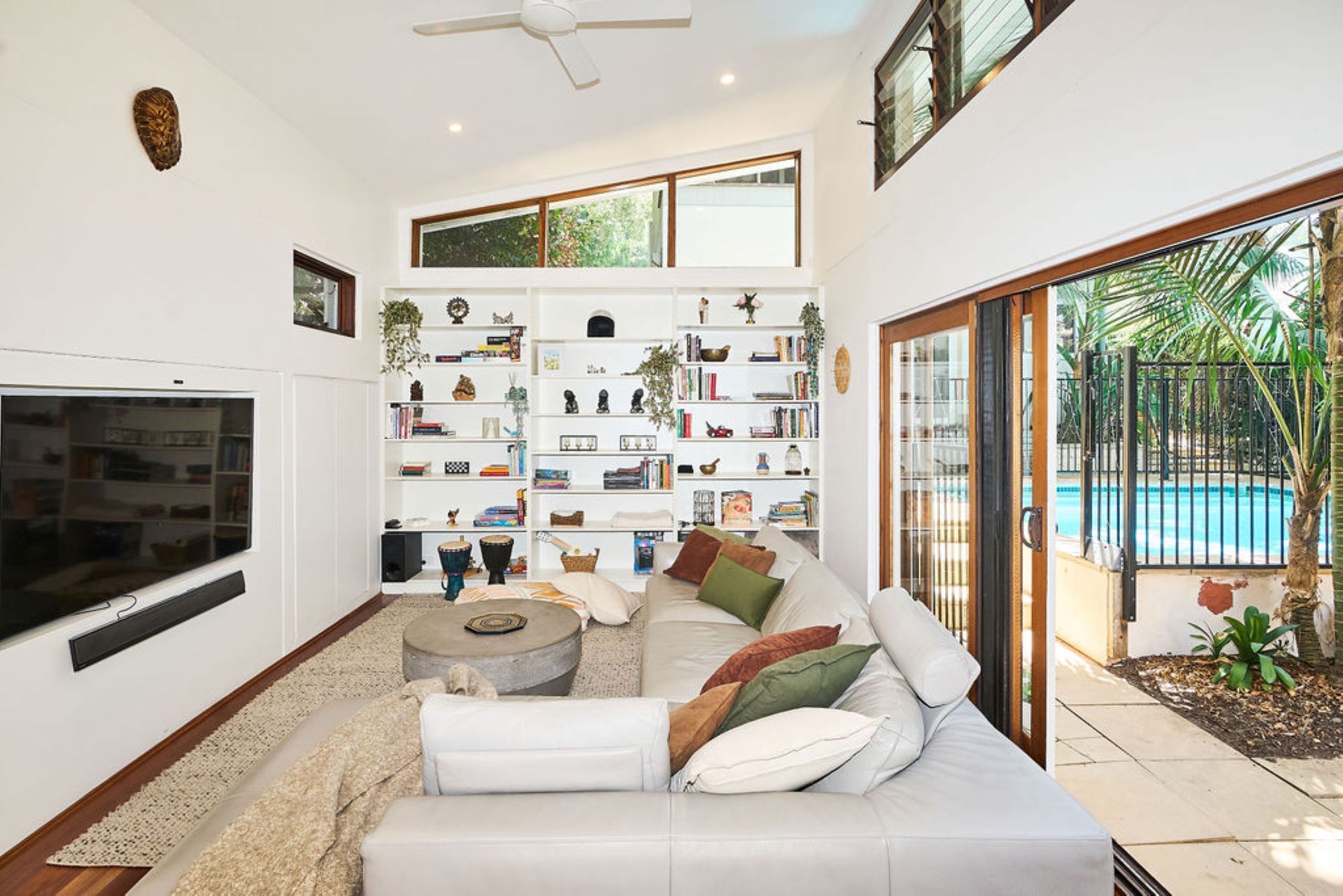 Beyond, an expansive alfresco terrace unfolds beneath mature trees, designed for long lunches and relaxed evenings with outdoor dining for up to eighteen guests and a gas BBQ. The north-facing swimming pool captures all-day sun, forming the heart of the outdoor experience, while established greenery ensures privacy and a sense of retreat within the vibrant coastal neighbourhood.