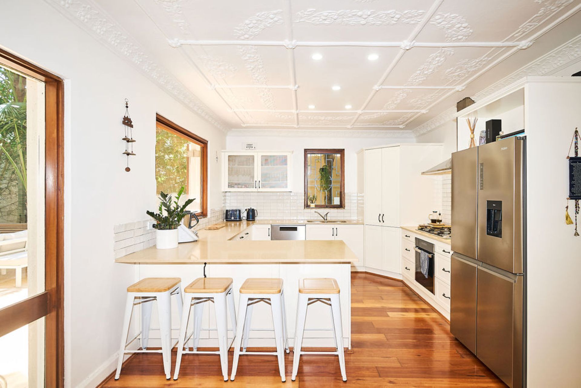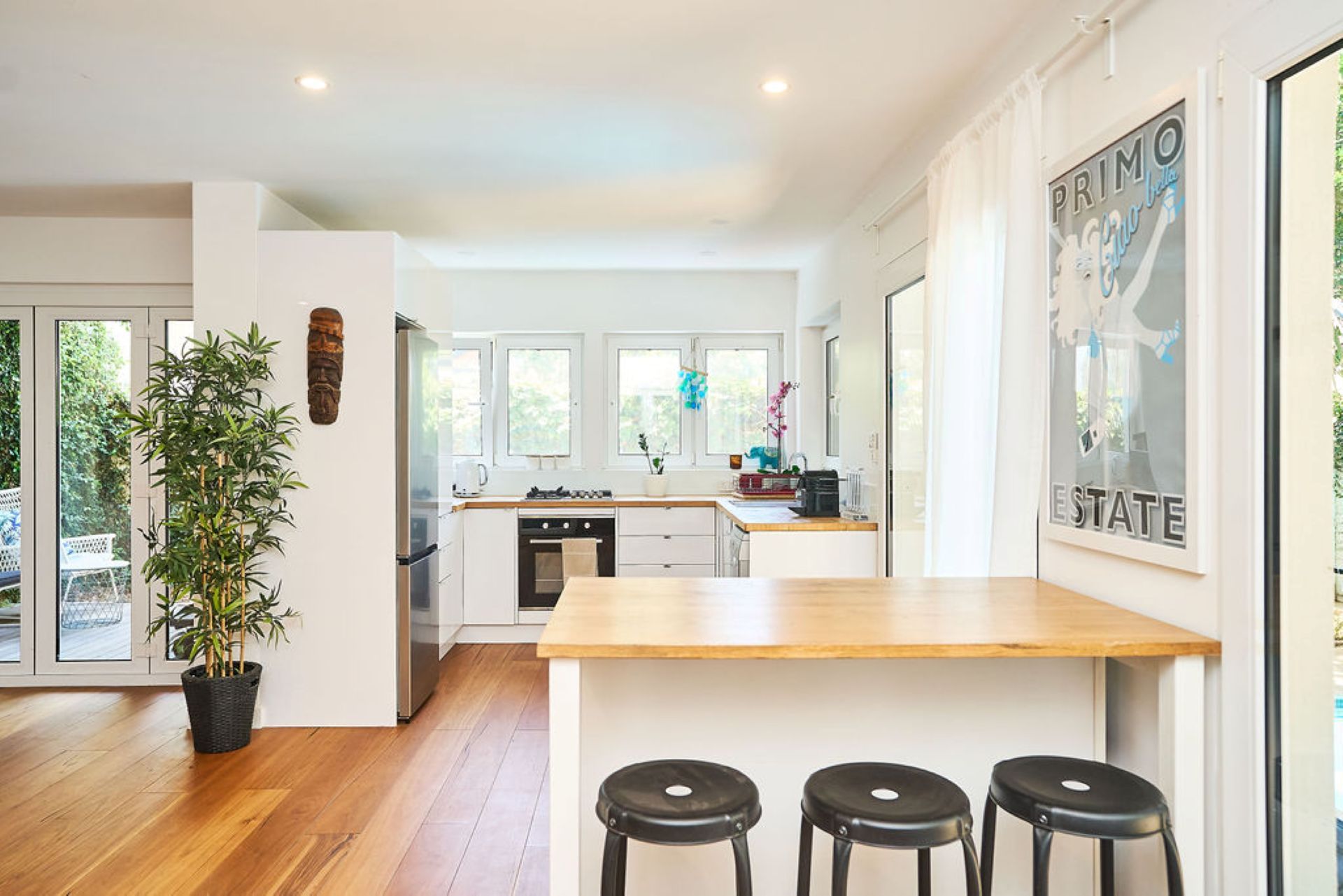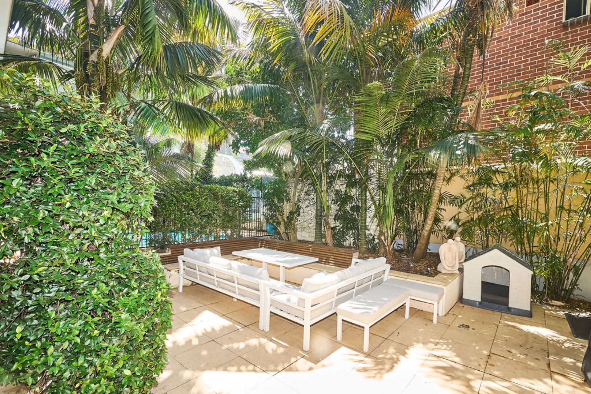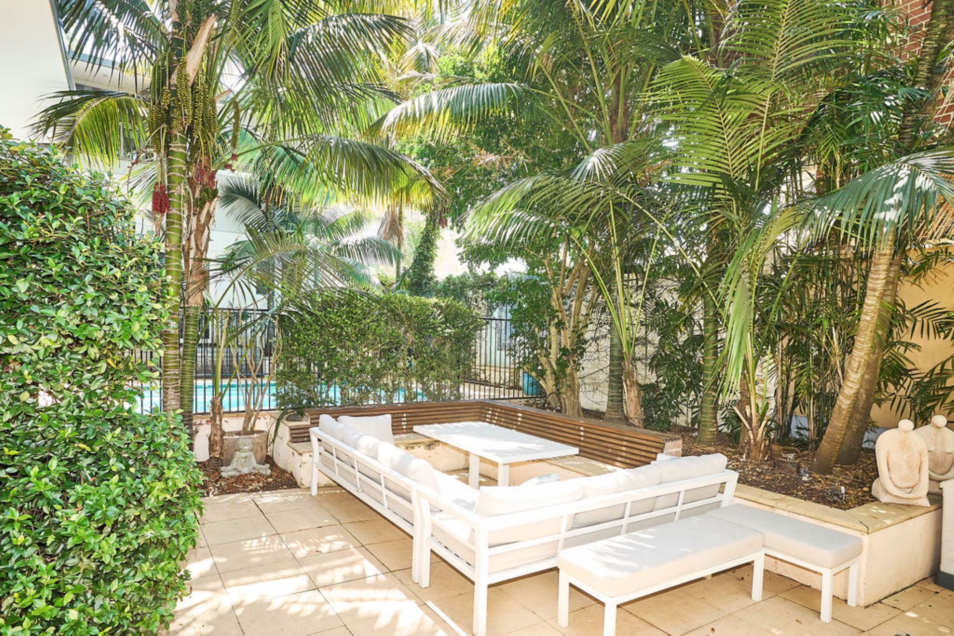 Beyond, an expansive alfresco terrace unfolds beneath mature trees, designed for long lunches and relaxed evenings with outdoor dining for up to eighteen guests and a gas BBQ. The north-facing swimming pool captures all-day sun, forming the heart of the outdoor experience, while established greenery ensures privacy and a sense of retreat within the vibrant coastal neighbourhood.