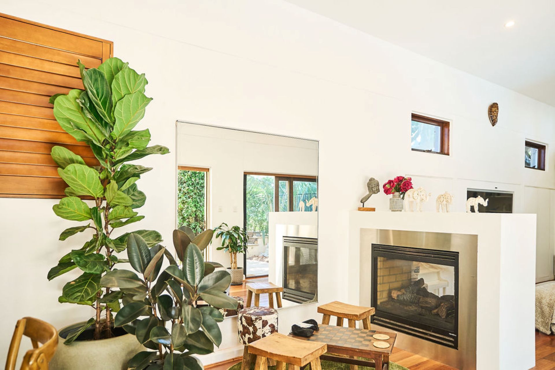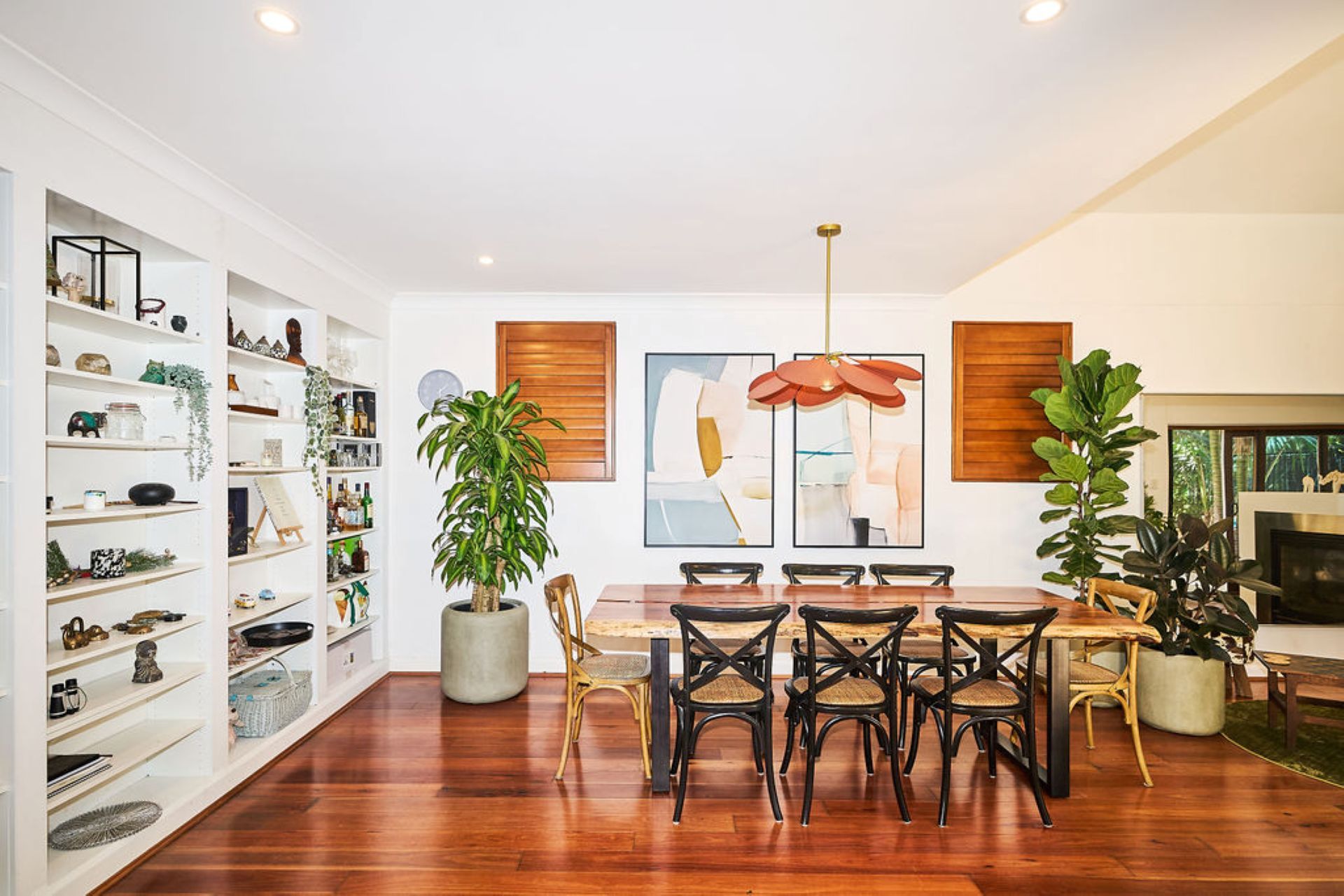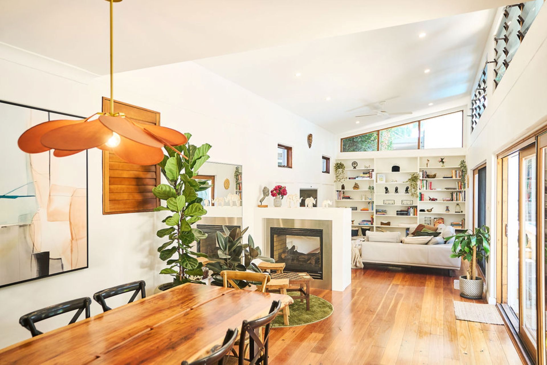 A double-fronted façade opens to interiors defined by polished timber floors, soaring ceilings and an effortless indoor-outdoor flow. The main living space centres around a double-height lounge framed by louvred glazing that welcomes fresh sea air and natural light throughout the day. A two-way fireplace creates an intimate corner for quiet evenings, while a bespoke live-edge timber dining table anchors the entertaining zone with seating for large gatherings.