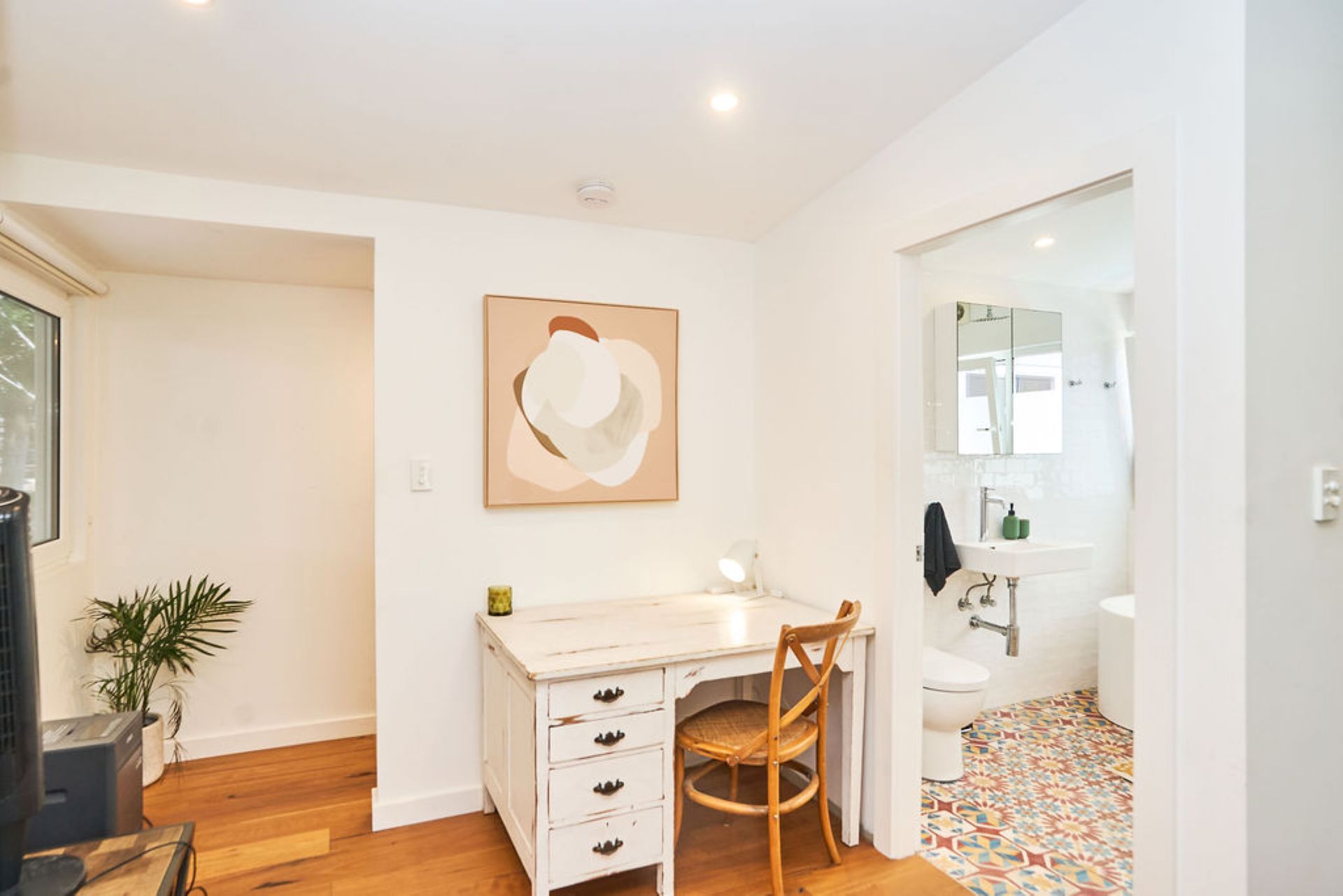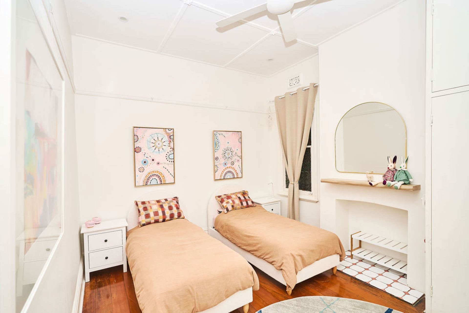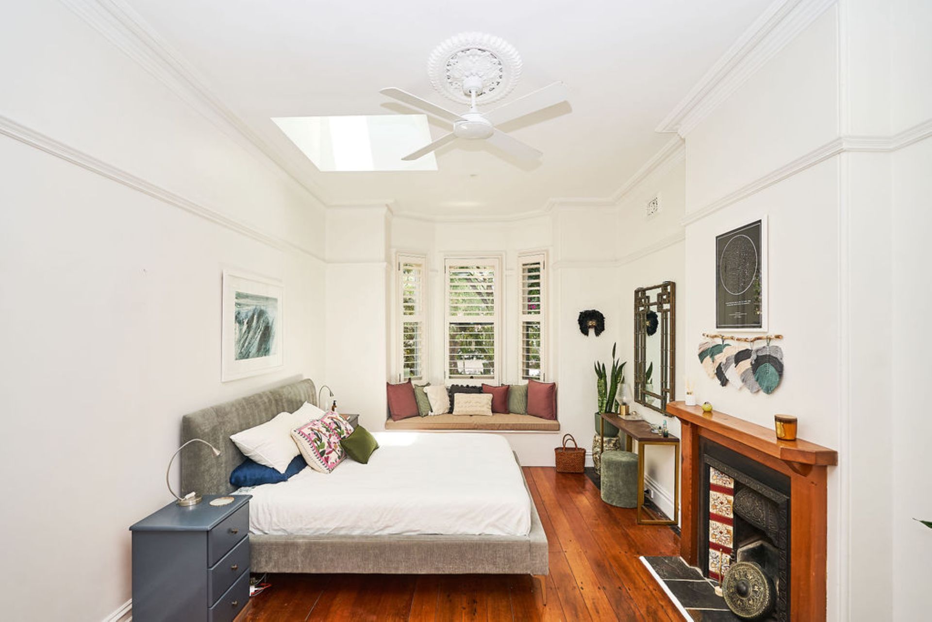 The oversized primary suite offers a private haven, complete with a plush king bed, cushioned bay window and plantation shutters that filter soft natural light. A skylight with motorised blackout adds flexibility, while a walk-in wardrobe leads through to a newly completed ensuite with double vanity and walk-in shower.