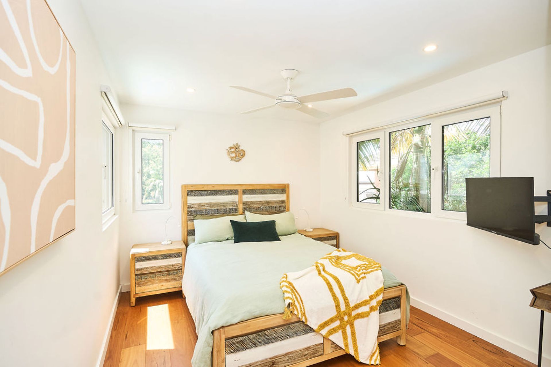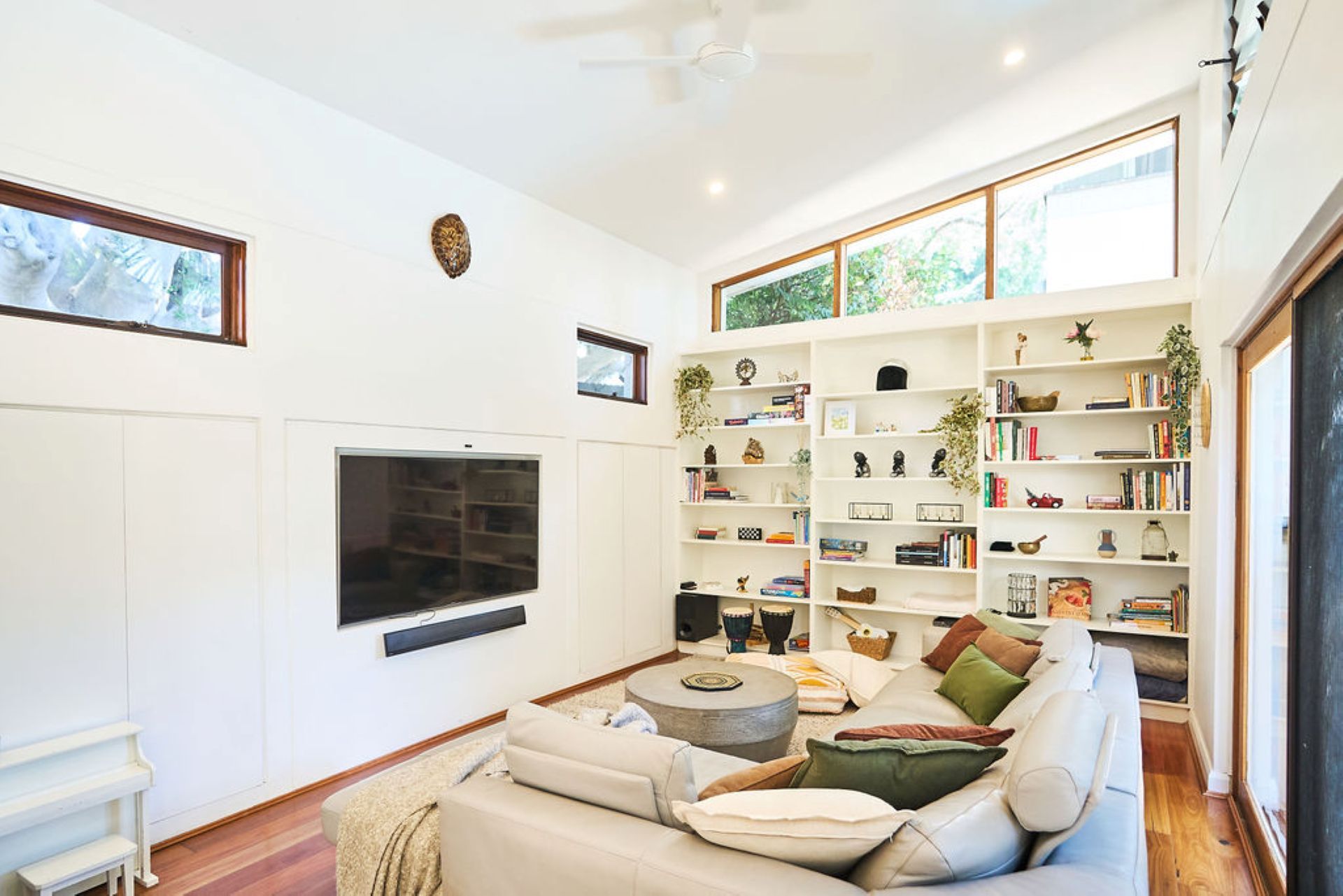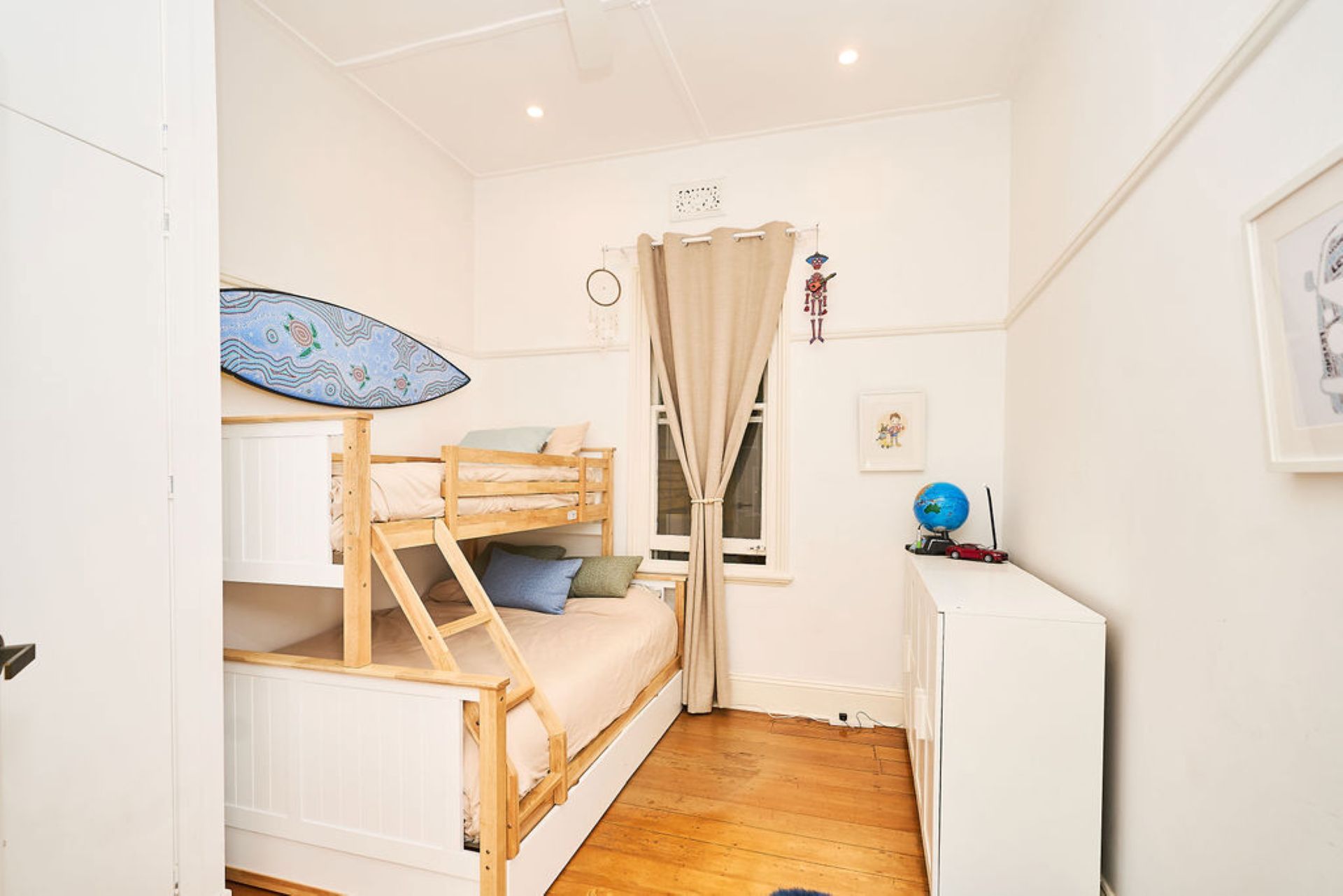 Additional bedrooms are thoughtfully configured to suit families or groups. A flexible king-or-twin room captures morning sun through large shuttered windows, while a third bedroom pairs a double bed with a single bunk above. Upstairs, a rumpus retreat doubles as a fourth bedroom with daybed and additional lounge space, ideal for children or extended guests.