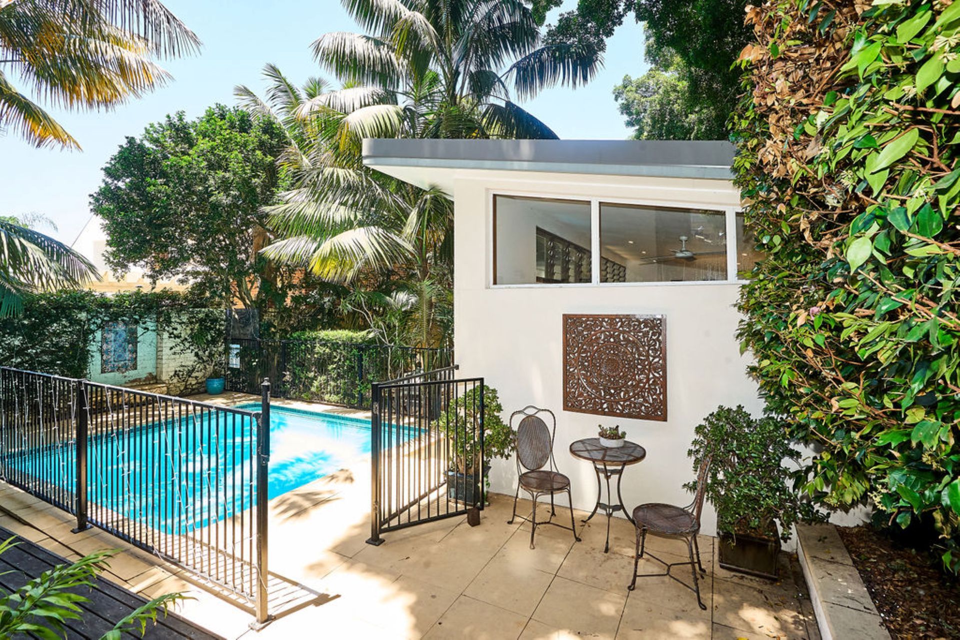 A separate self-contained guesthouse sits beyond the pool, offering a queen studio with its own bathroom, kitchenette, lounge area and private alfresco deck.