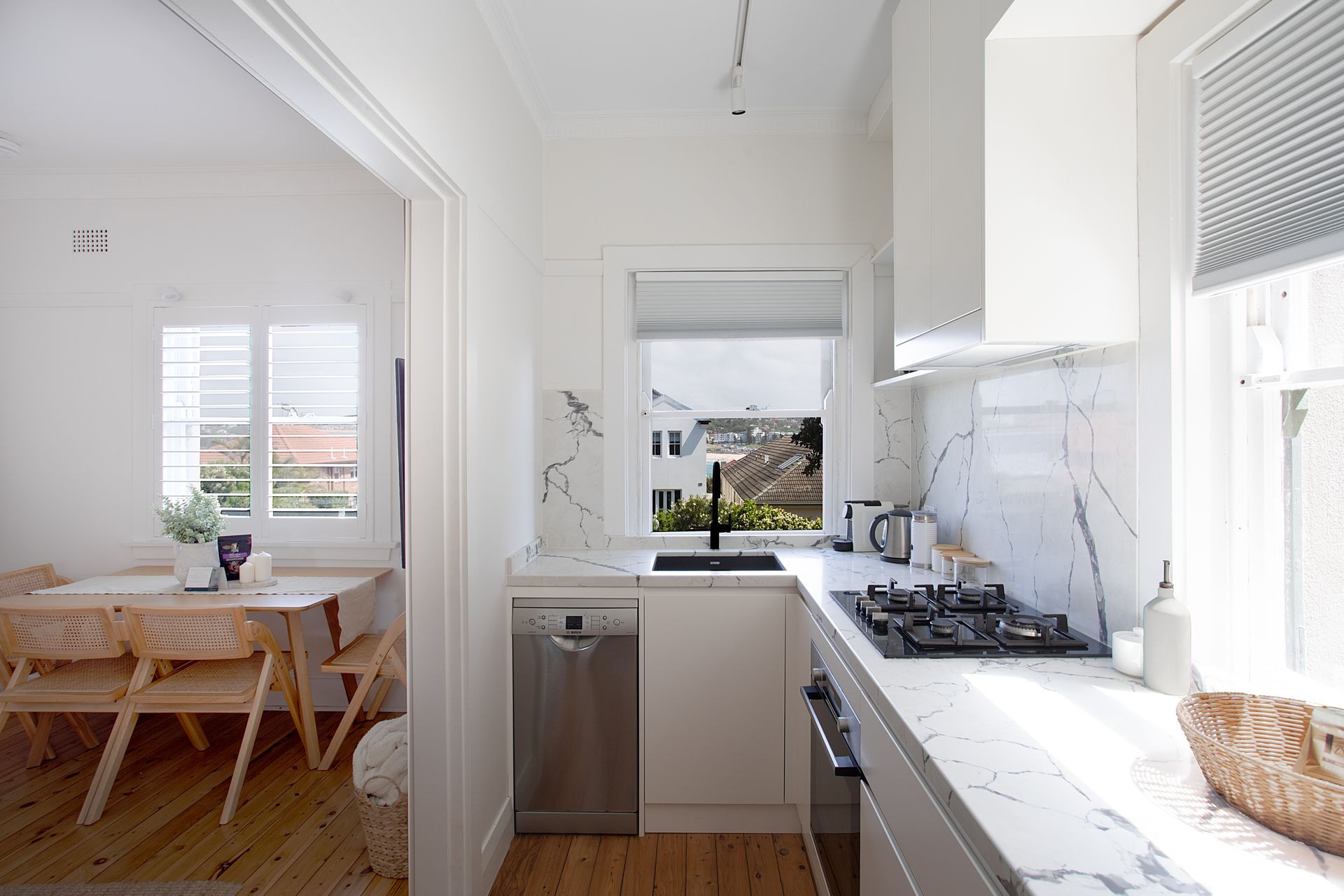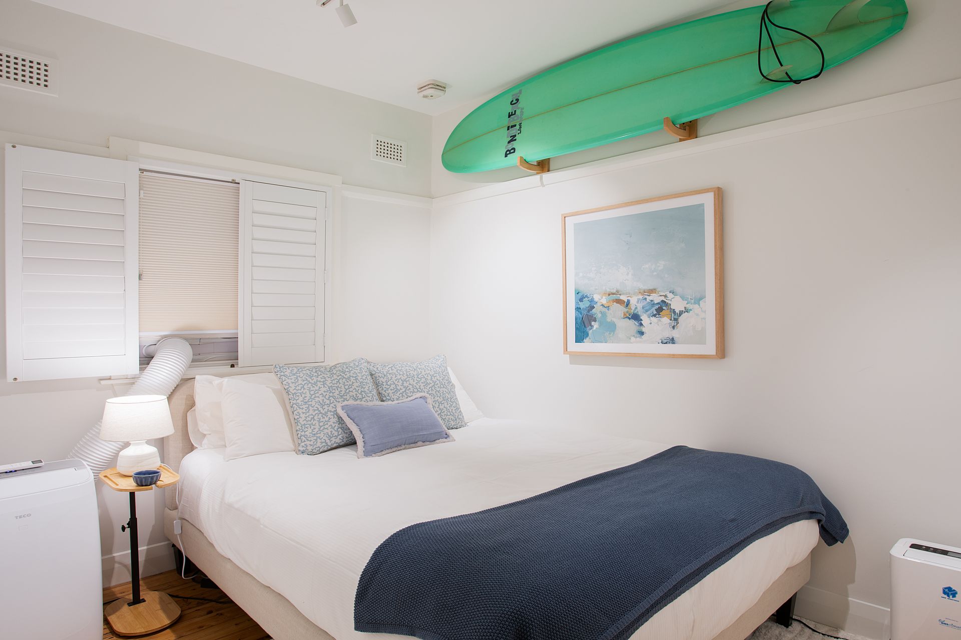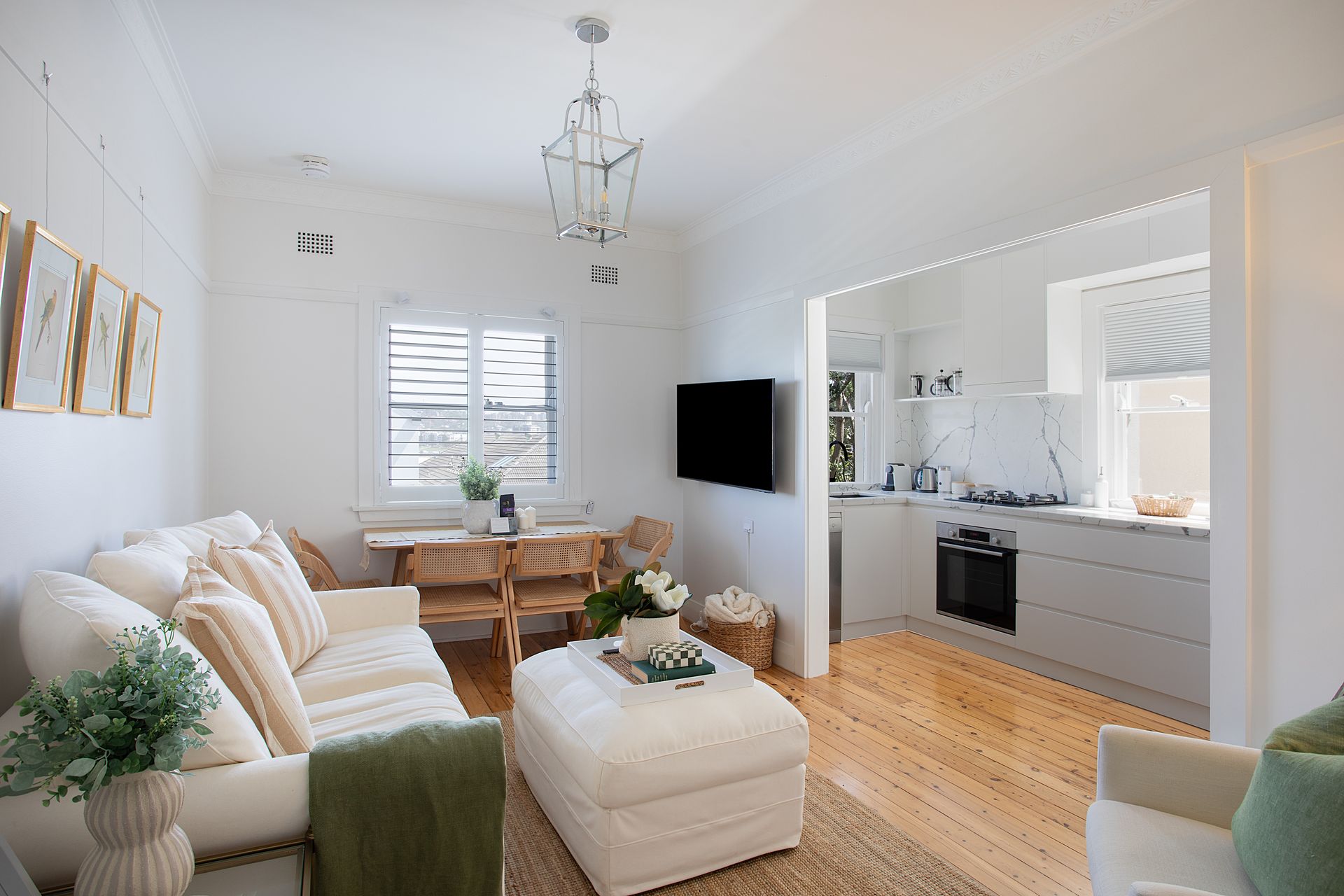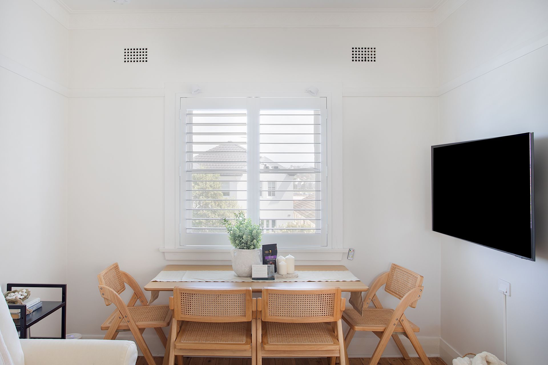 Step inside to discover an apartment that unfolds with an easy, natural flow mirroring coastal living at its best. Timber floors run throughout the living and dining spaces, warming the crisp white walls and lending texture to the light filled interior. The lounge area, dressed in cream tones with striped cushions and sage green throws, invites you to sink in after beach walks, while the dining table, crafted from natural wood with cane backed chairs, seats up to six, perfect for evening gatherings. In the kitchen, marble effect countertops catch the light, and though compact, the space features a gas cooktop, electric oven, dishwasher, toaster, kettle, and pod coffee machine for those crucial morning brews. Down the hallway, the master bedroom features a king bed with built-in wardrobes offering ample storage, while the second bedroom accommodates a queen perfectly. Both rooms include portable air conditioning units, essential for those summer nights. The bathroom channels Art Deco elegance with black fixtures and a shower over bath combination. Outside, the shared external laundry area houses your private washer and dryer, and the shared garden provides a peaceful outdoor space to catch your breath between beach sessions.