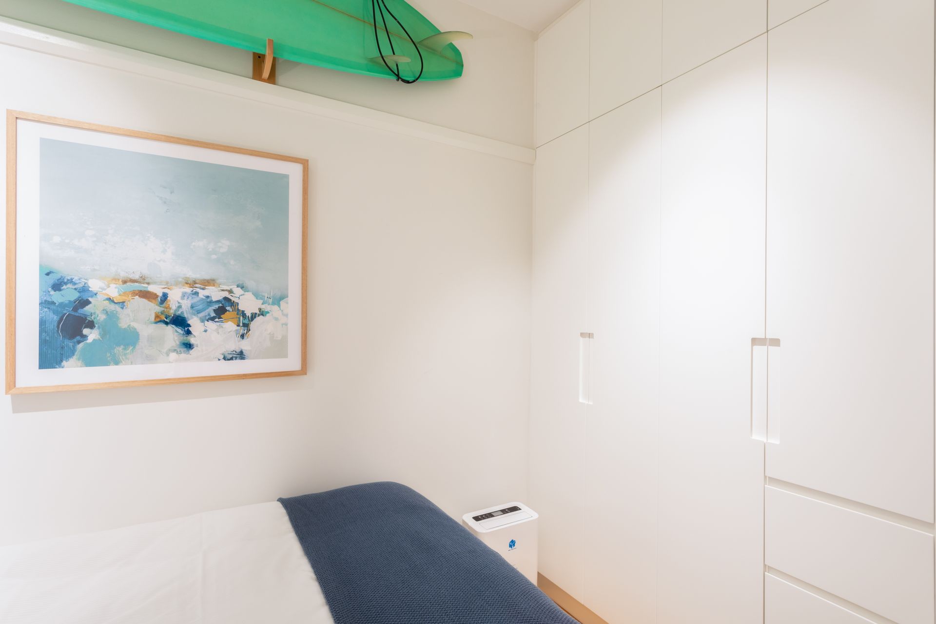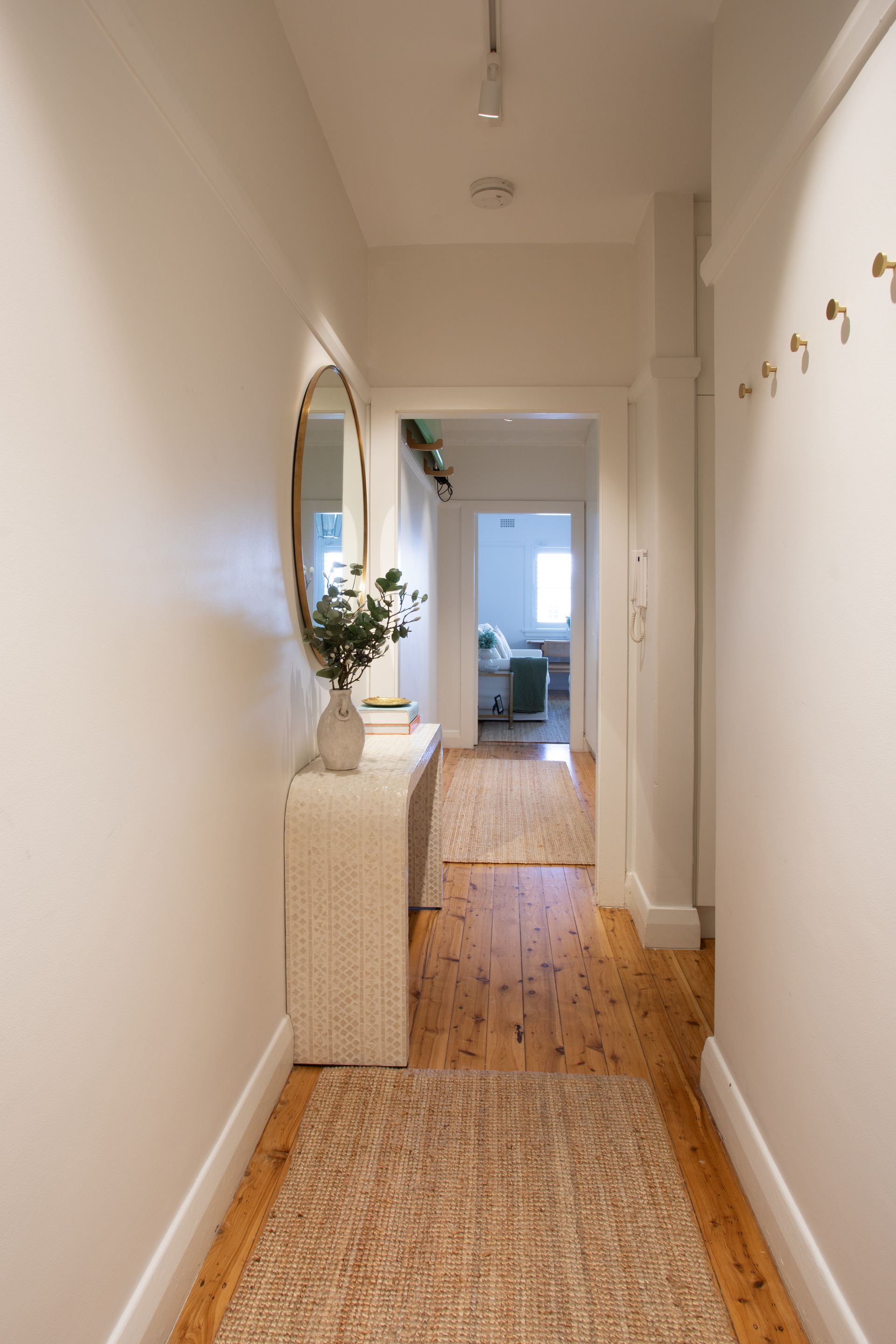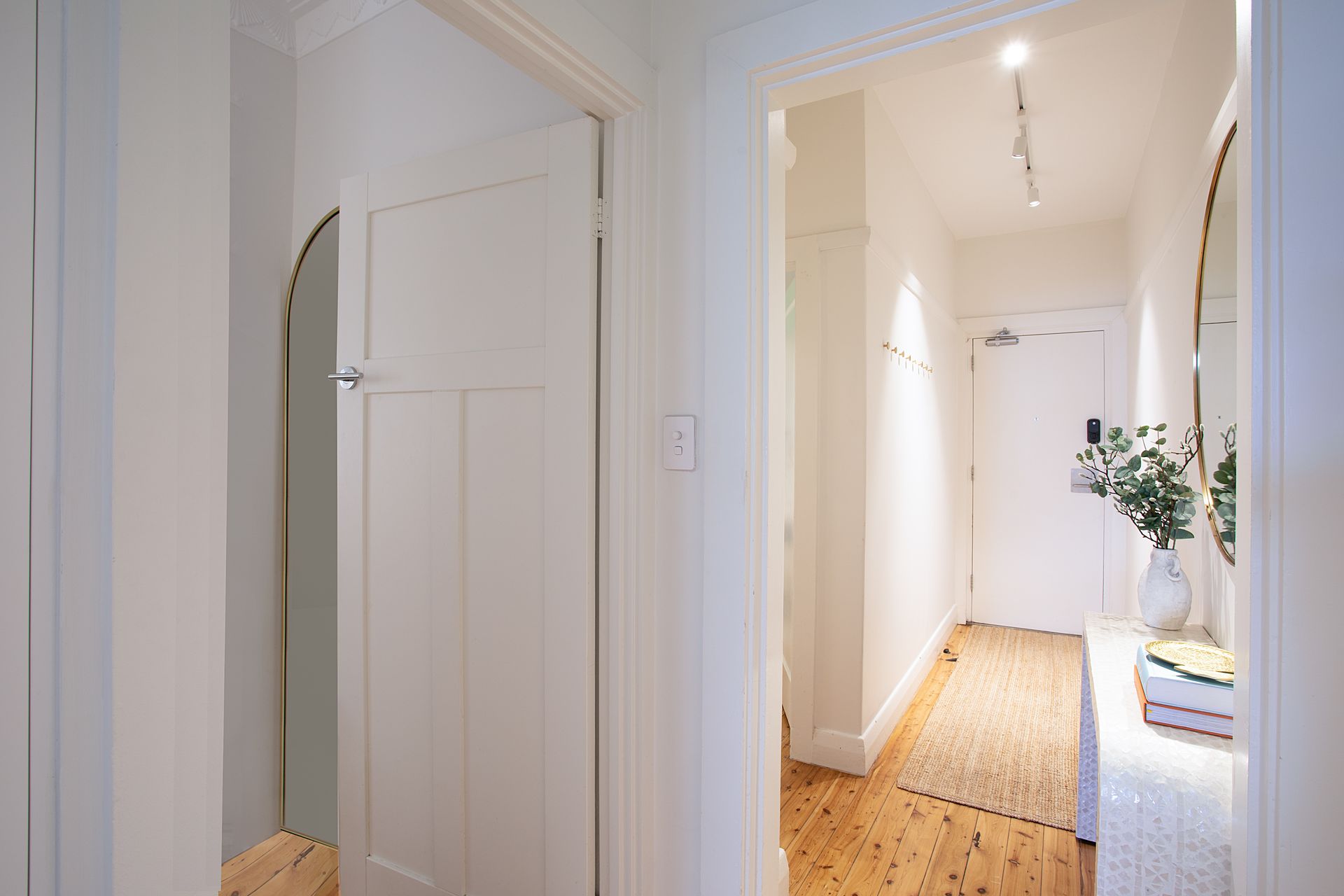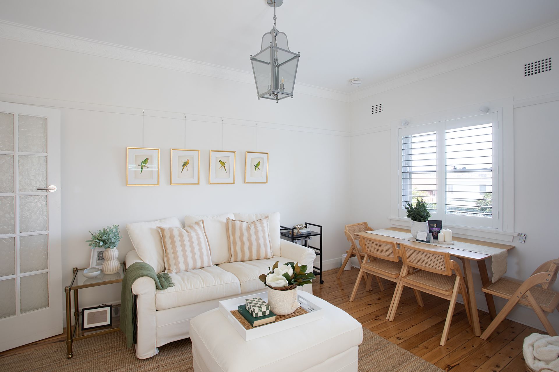 Step inside to discover an apartment that unfolds with an easy, natural flow mirroring coastal living at its best. Timber floors run throughout the living and dining spaces, warming the crisp white walls and lending texture to the light filled interior. The lounge area, dressed in cream tones with striped cushions and sage green throws, invites you to sink in after beach walks, while the dining table, crafted from natural wood with cane backed chairs, seats up to six, perfect for evening gatherings. In the kitchen, marble effect countertops catch the light, and though compact, the space features a gas cooktop, electric oven, dishwasher, toaster, kettle, and pod coffee machine for those crucial morning brews. Down the hallway, the master bedroom features a king bed with built-in wardrobes offering ample storage, while the second bedroom accommodates a queen perfectly. Both rooms include portable air conditioning units, essential for those summer nights. The bathroom channels Art Deco elegance with black fixtures and a shower over bath combination. Outside, the shared external laundry area houses your private washer and dryer, and the shared garden provides a peaceful outdoor space to catch your breath between beach sessions.