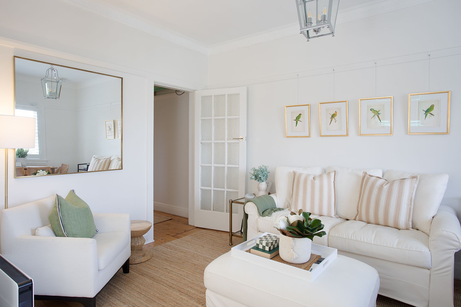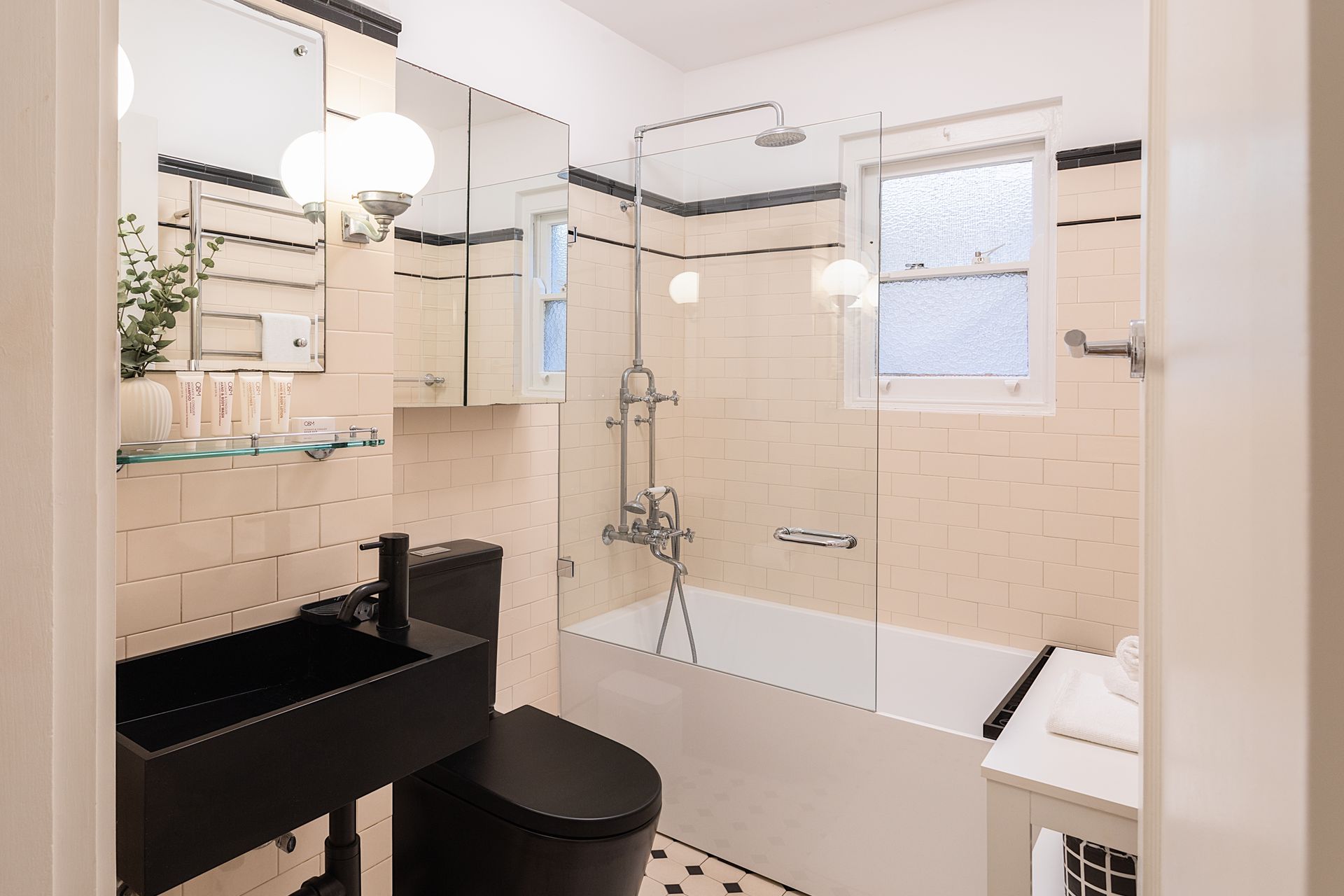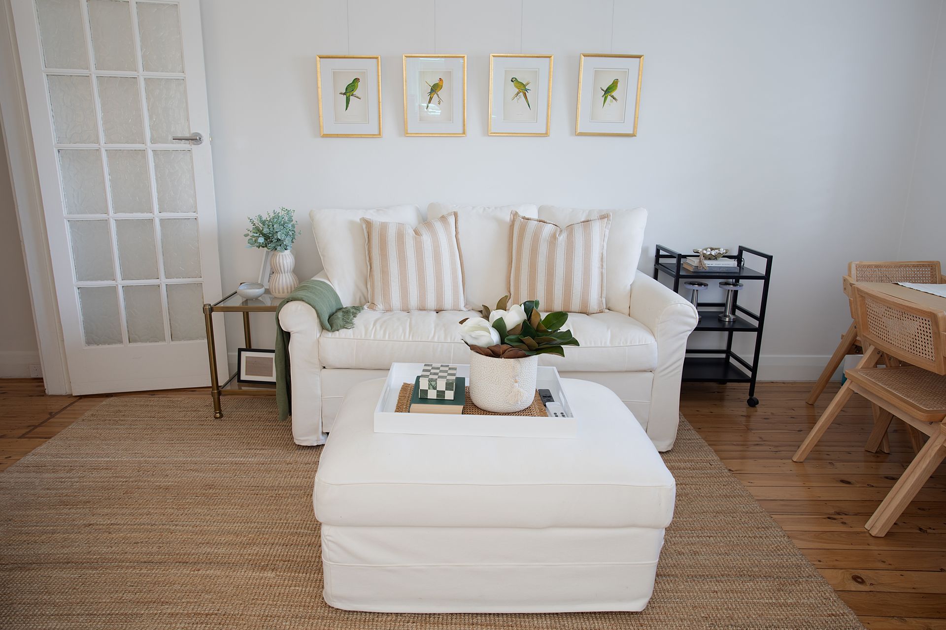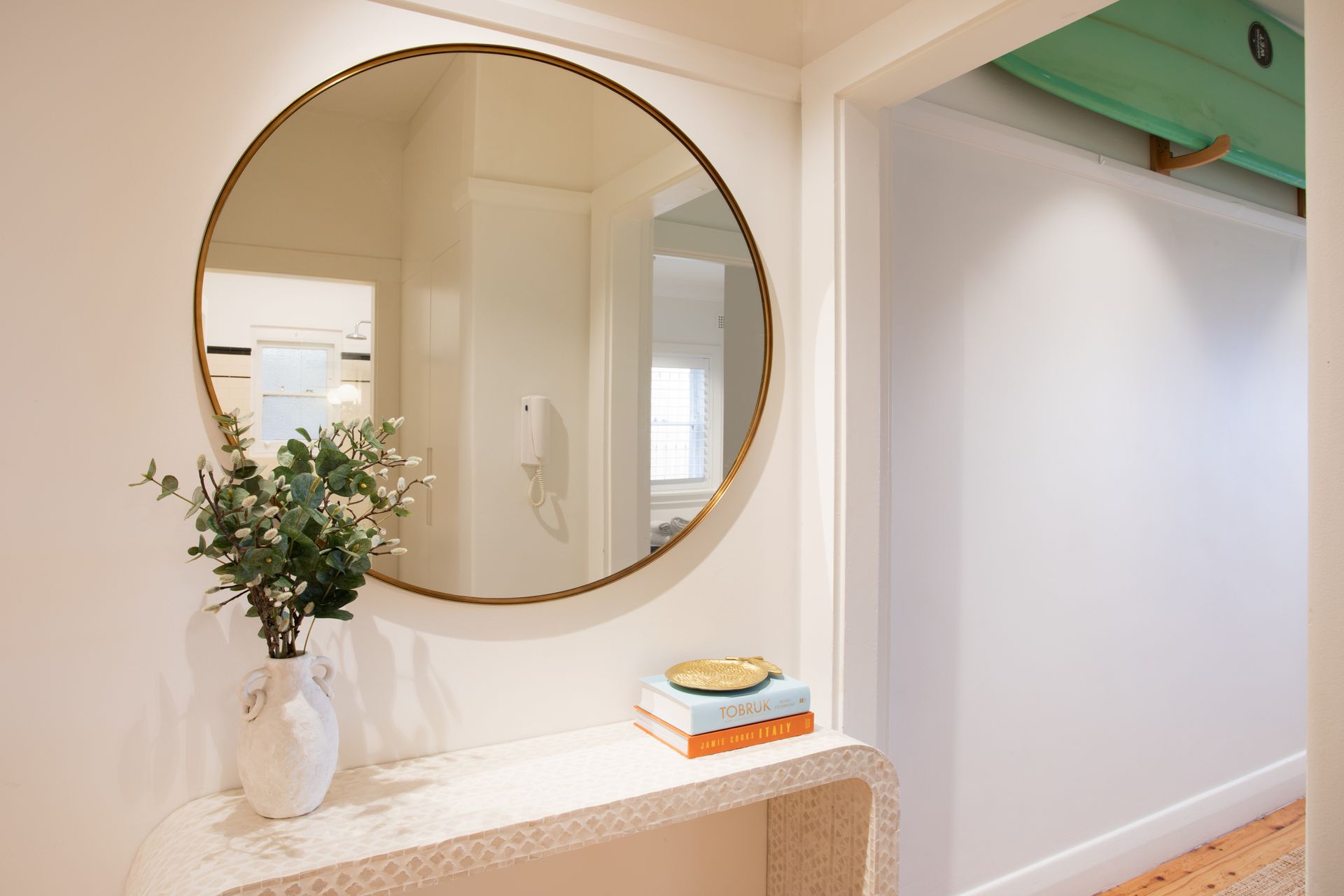 Step inside to discover an apartment that unfolds with an easy, natural flow mirroring coastal living at its best. Timber floors run throughout the living and dining spaces, warming the crisp white walls and lending texture to the light filled interior. The lounge area, dressed in cream tones with striped cushions and sage green throws, invites you to sink in after beach walks, while the dining table, crafted from natural wood with cane backed chairs, seats up to six, perfect for evening gatherings. In the kitchen, marble effect countertops catch the light, and though compact, the space features a gas cooktop, electric oven, dishwasher, toaster, kettle, and pod coffee machine for those crucial morning brews. Down the hallway, the master bedroom features a king bed with built-in wardrobes offering ample storage, while the second bedroom accommodates a queen perfectly. Both rooms include portable air conditioning units, essential for those summer nights. The bathroom channels Art Deco elegance with black fixtures and a shower over bath combination. Outside, the shared external laundry area houses your private washer and dryer, and the shared garden provides a peaceful outdoor space to catch your breath between beach sessions.