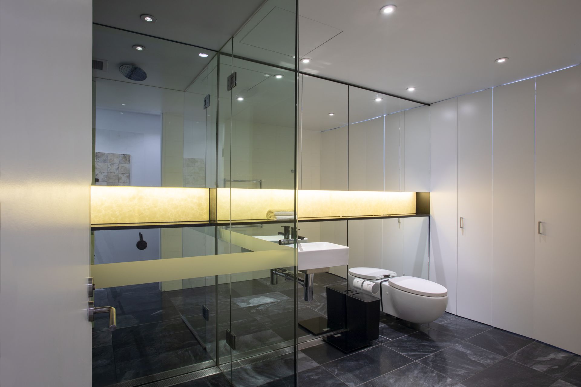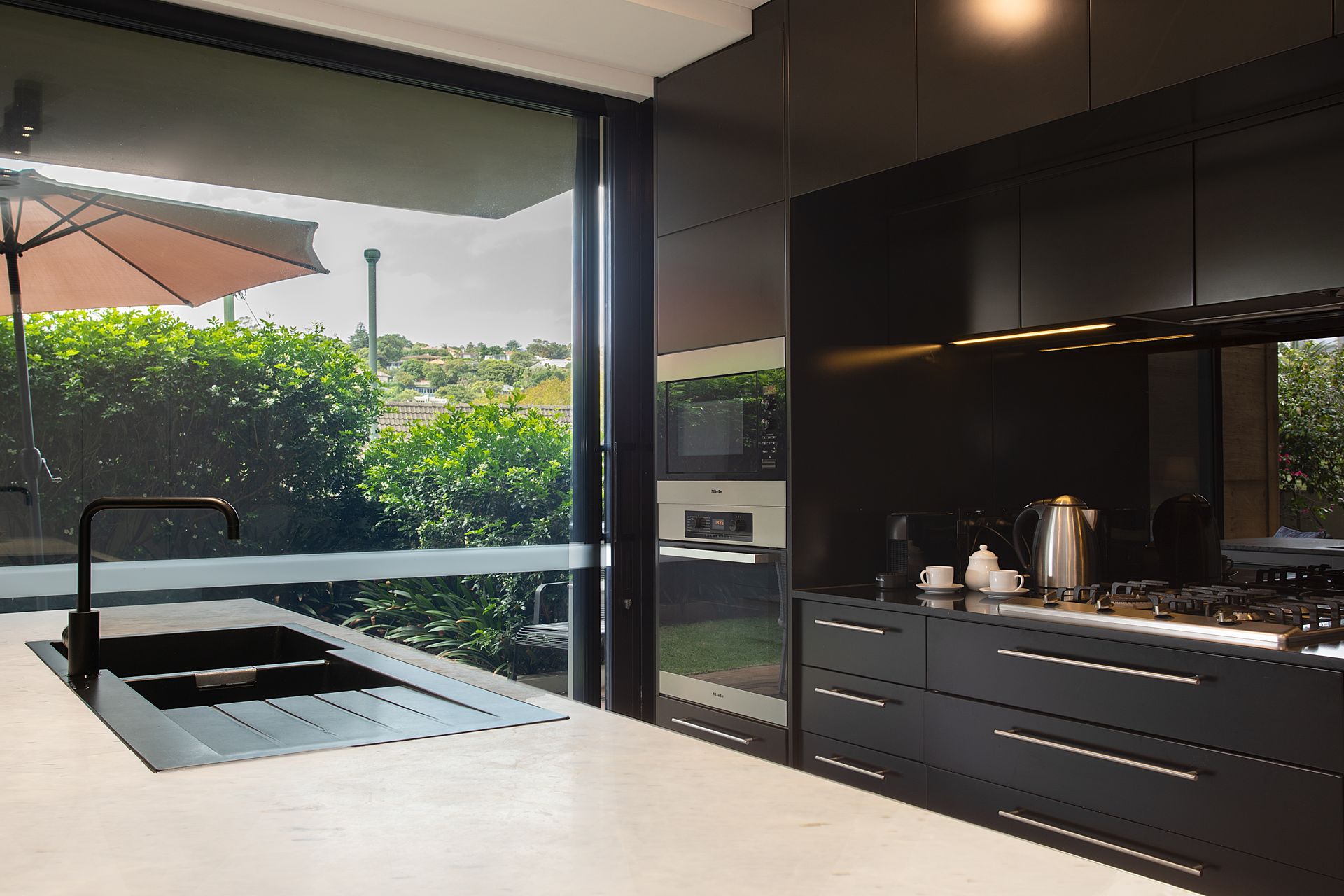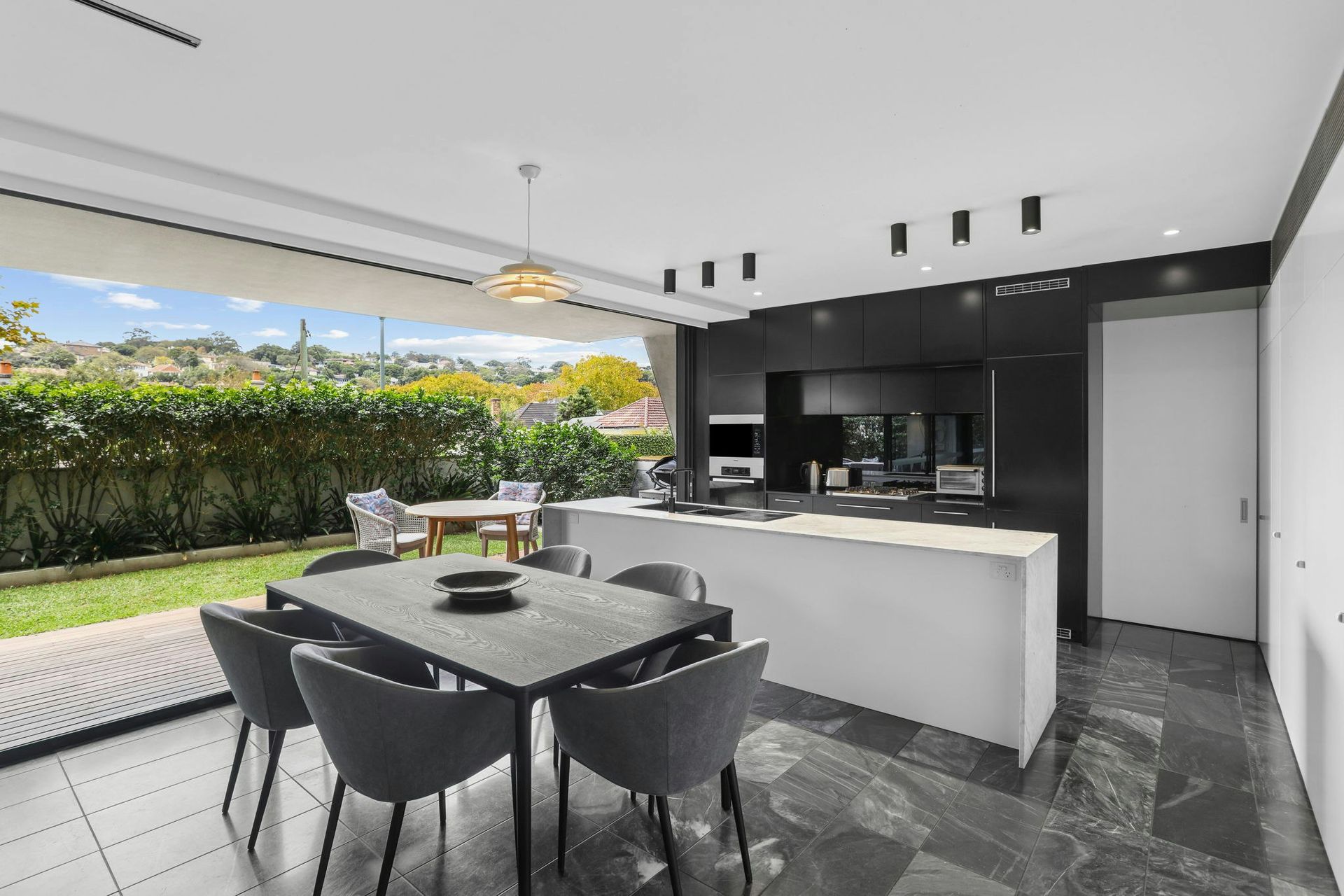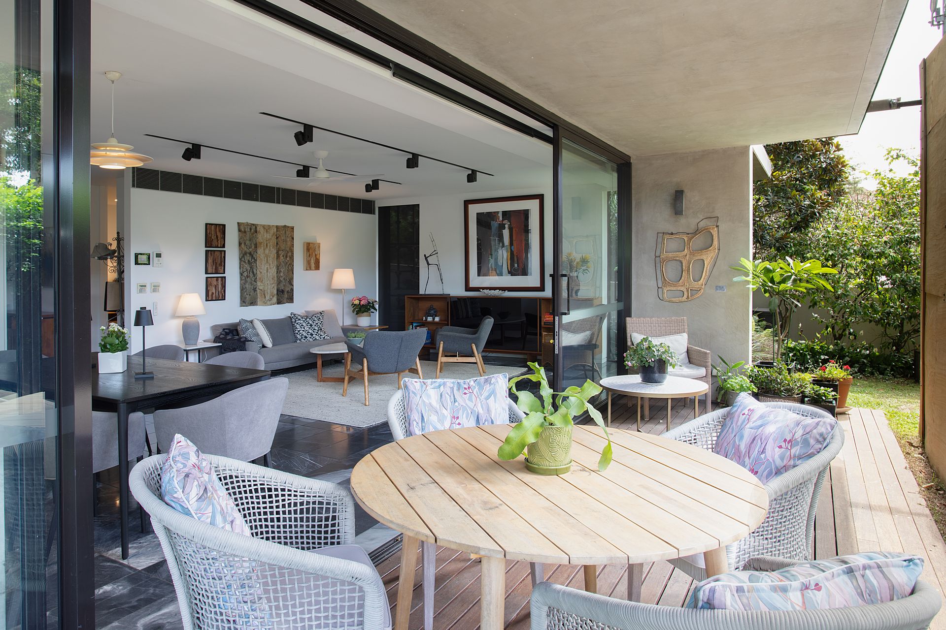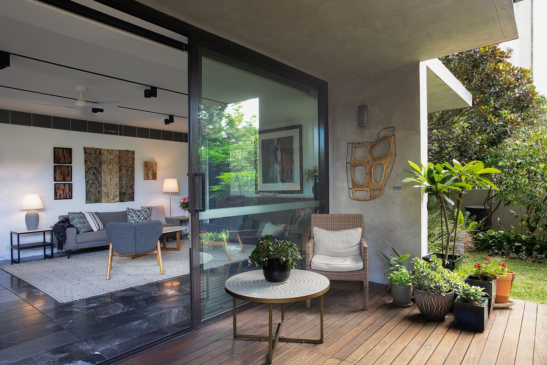 - Floor-to-ceiling glass walls and bifold doors opening directly to the private courtyard garden