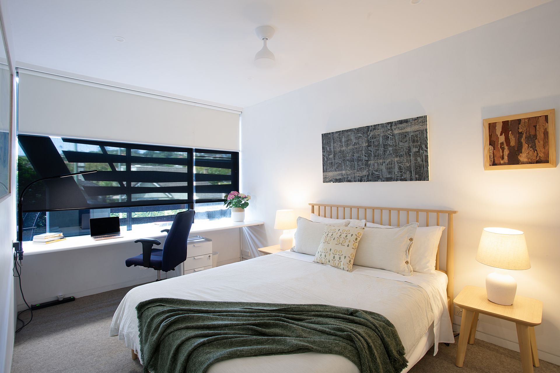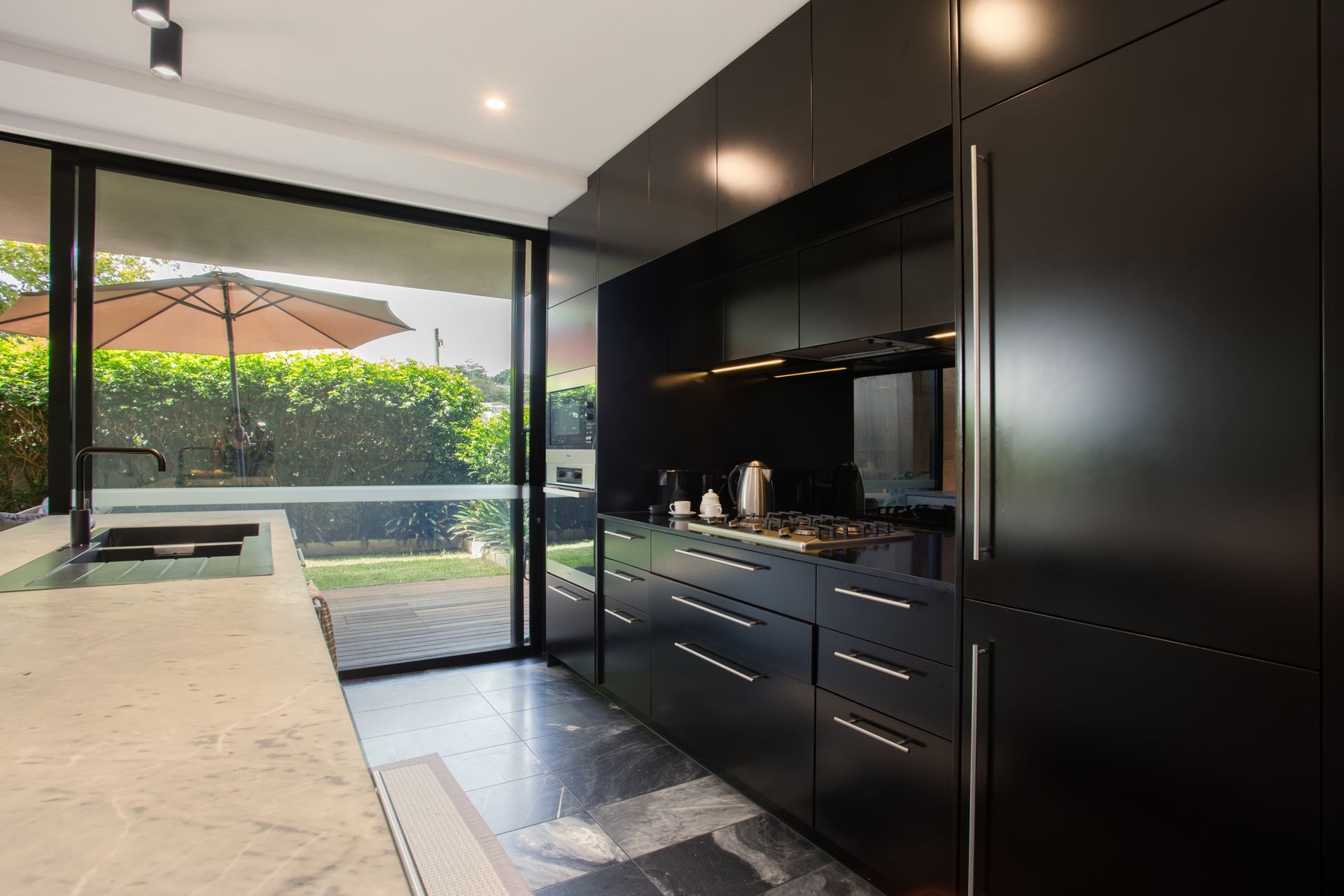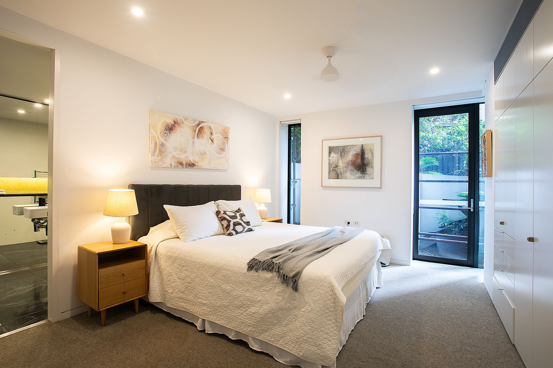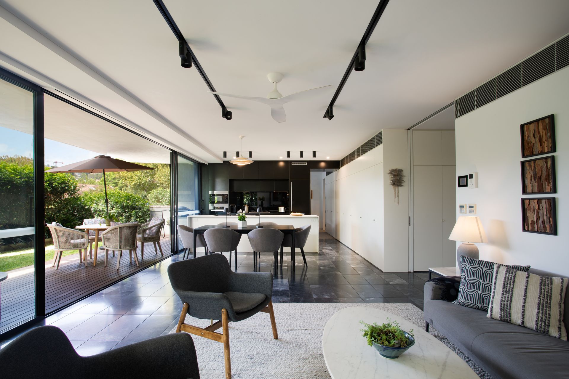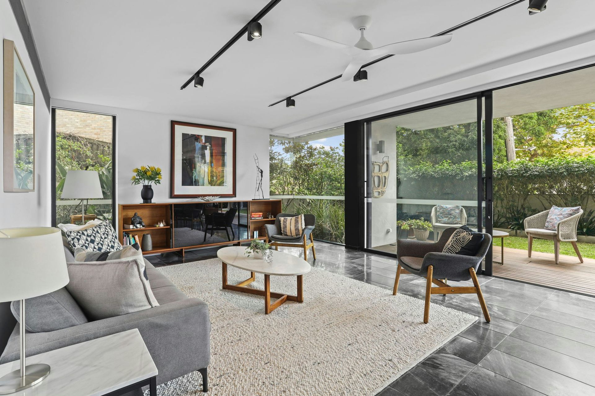 Step inside and discover a home that announces itself quietly, floor-to-ceiling glass frames a wall of green that softens every room, while polished dark stone tiles carry you through the open plan living and dining areas in one seamless sweep. The living room is anchored by a textural cream rug, a sculptural oval marble coffee table and a pair of mid century armchairs that encourage long afternoons. A walnut credenza runs the length of one wall, home to curated books and objects, with an expressive framed artwork above setting a confident, collected tone. From every angle, the garden is present, bifold glass doors slide fully open to dissolve the boundary between inside and out, connecting the living room to a shaded terrace furnished with dining and lounge seating for effortless summer evenings. The kitchen is a serious space dressed in matte black cabinetry, a full length stone waterfall island and a suite of quality appliances including a full sized refrigerator, oven, induction cooktop and dishwasher, all arranged for ease and convenience. A pendant light with brushed brass detailing anchors the generous dining table beneath, while the garden courtyard unfolds beyond through retractable glass panels, making breakfast in the morning sun feel like a natural ritual. The two king bedrooms offer genuine retreat, serene, light filled rooms dressed in neutral tones with plush carpet underfoot, original artworks above each bed and garden views through black-framed doors that open to a private outdoor nook. Each room is appointed with bedside lamps, quality linen and ample wardrobe space. The bathroom brings the drama of the kitchen into the most private corner of the home, with floor-to-ceiling black gloss tiles, a full width mirror with integrated warm accent lighting, twin wall-mounted basins on polished chrome stands, a wall-hung toilet and a deep soaking bath, all illuminated by recessed downlights. Ducted air conditioning flows throughout the entire home, keeping every season comfortable, and two secure undercover parking spaces complete the offering.