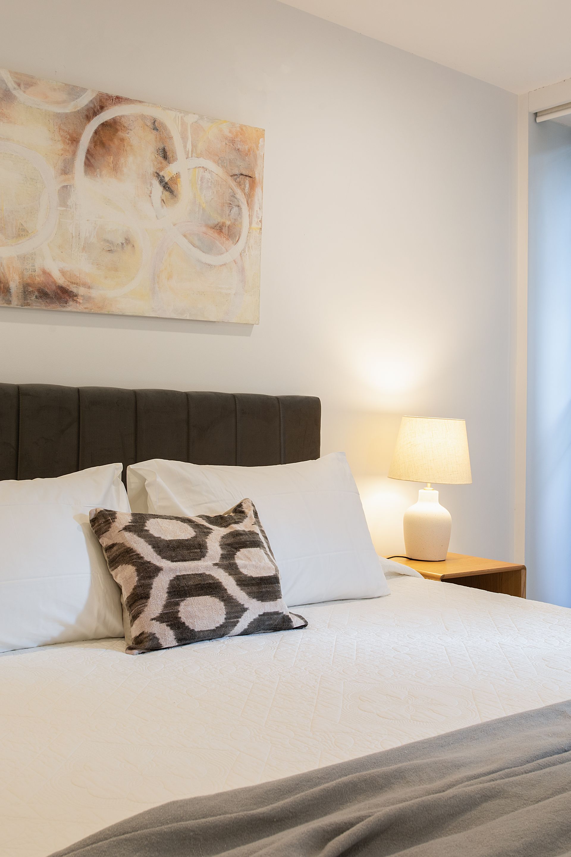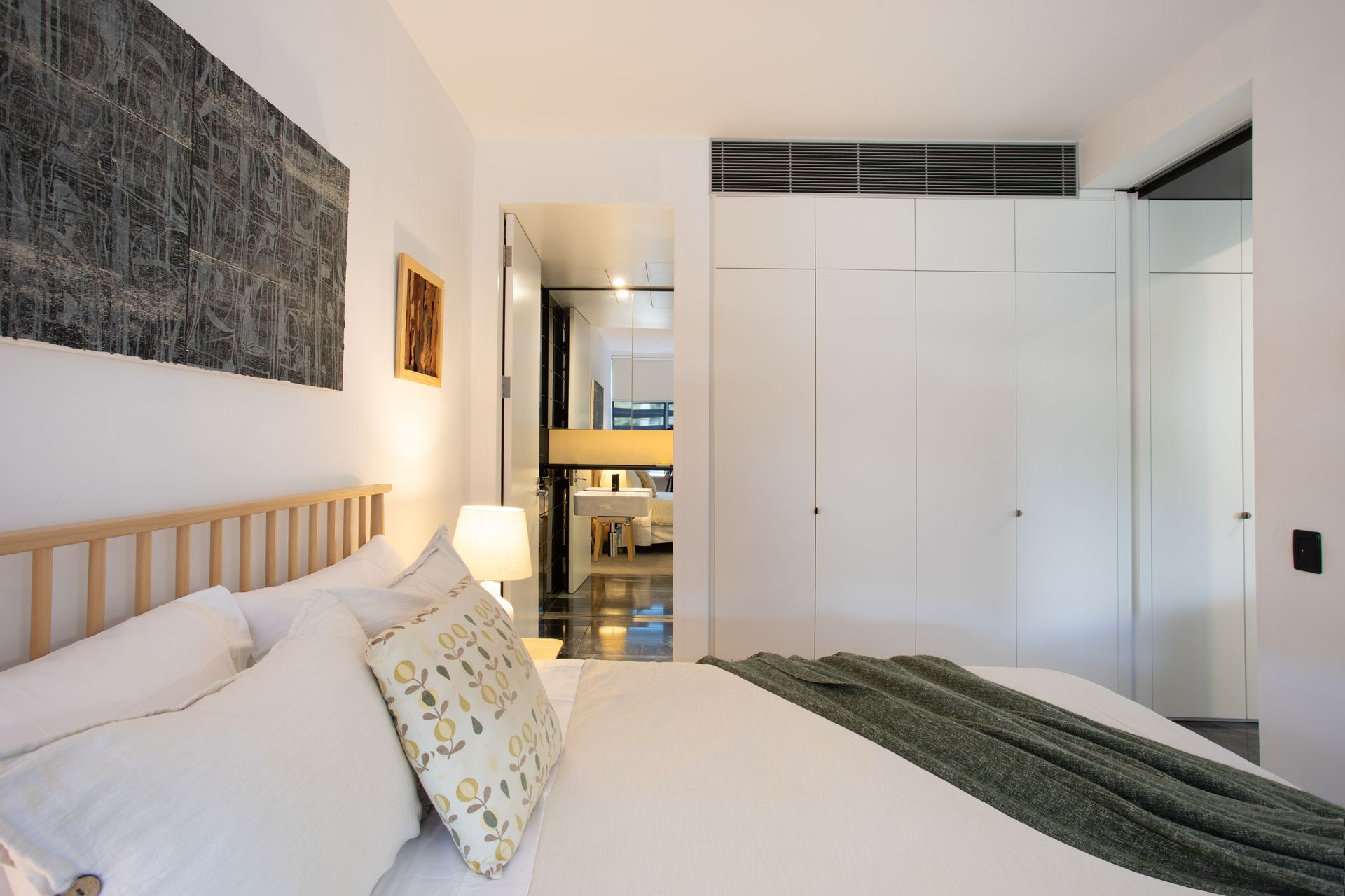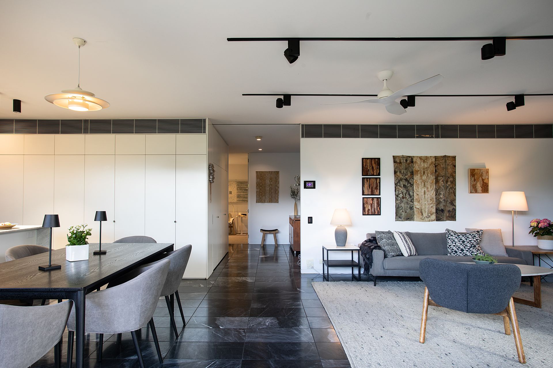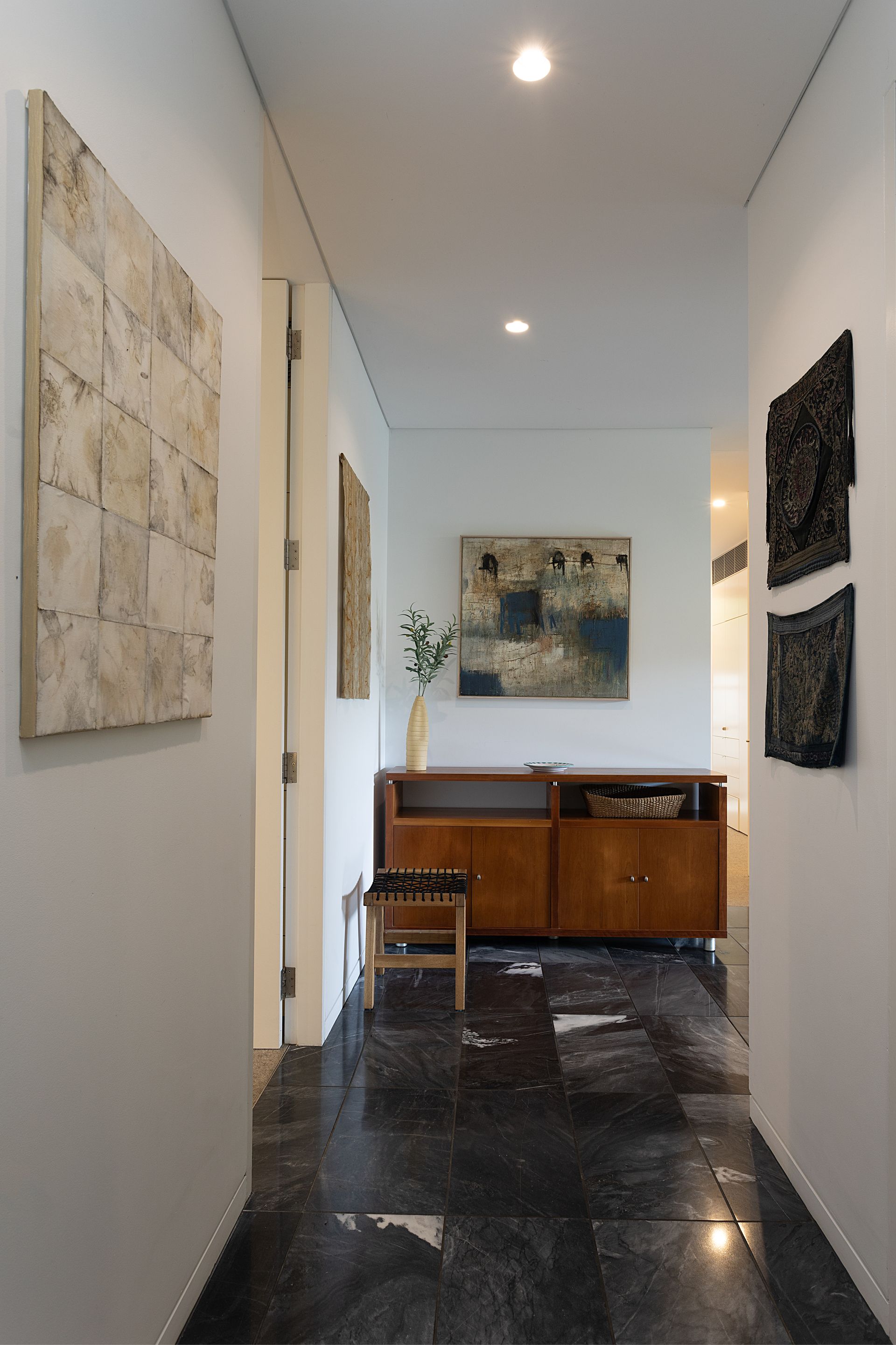 - Mid-century architectural interior with polished stone floors, walnut joinery and curated artworks throughout