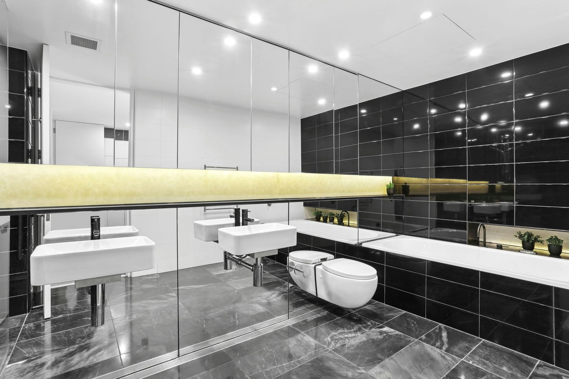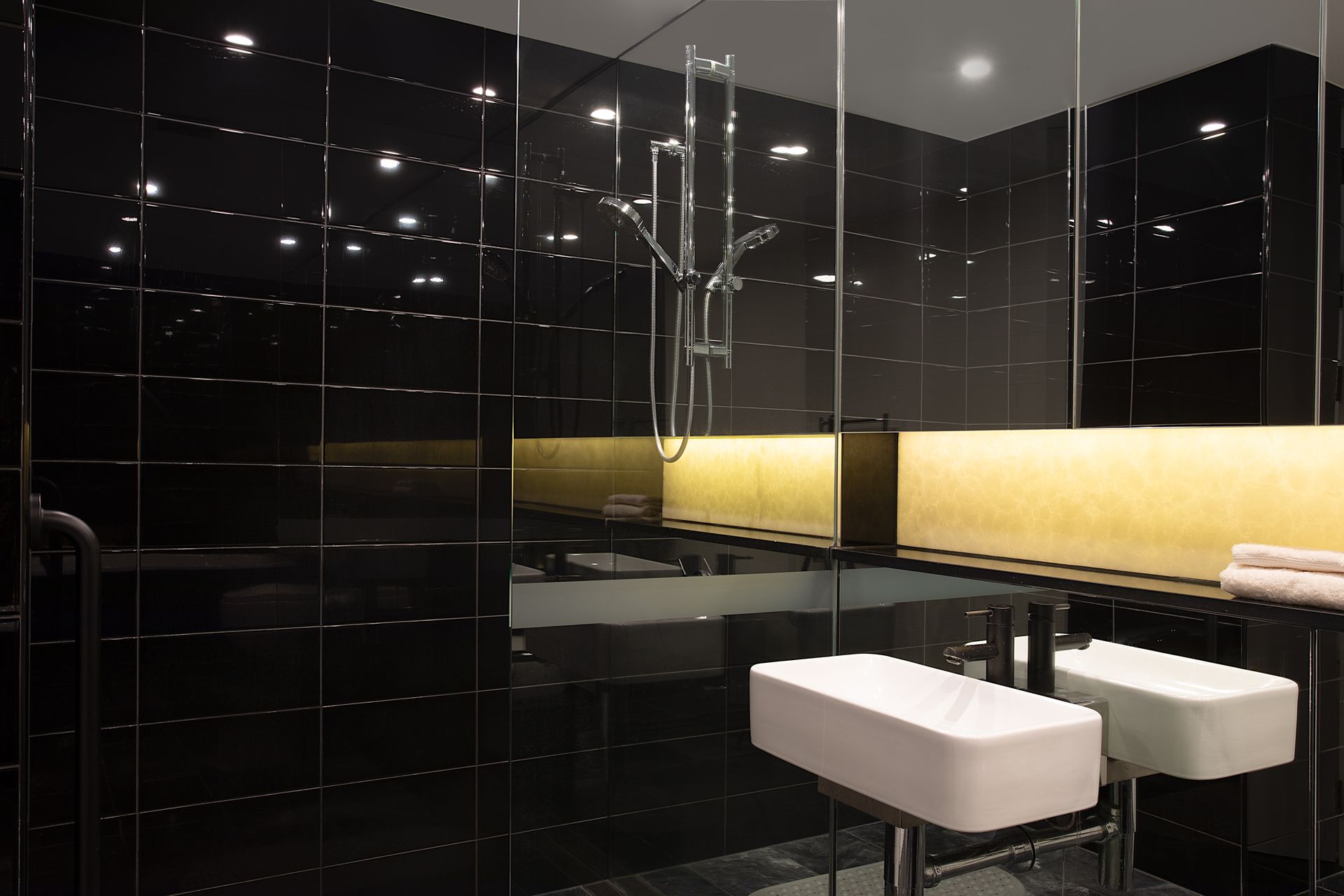- Dramatic master ensuite-style bathroom with soaking bath, twin wall-mounted basins and black gloss tiles