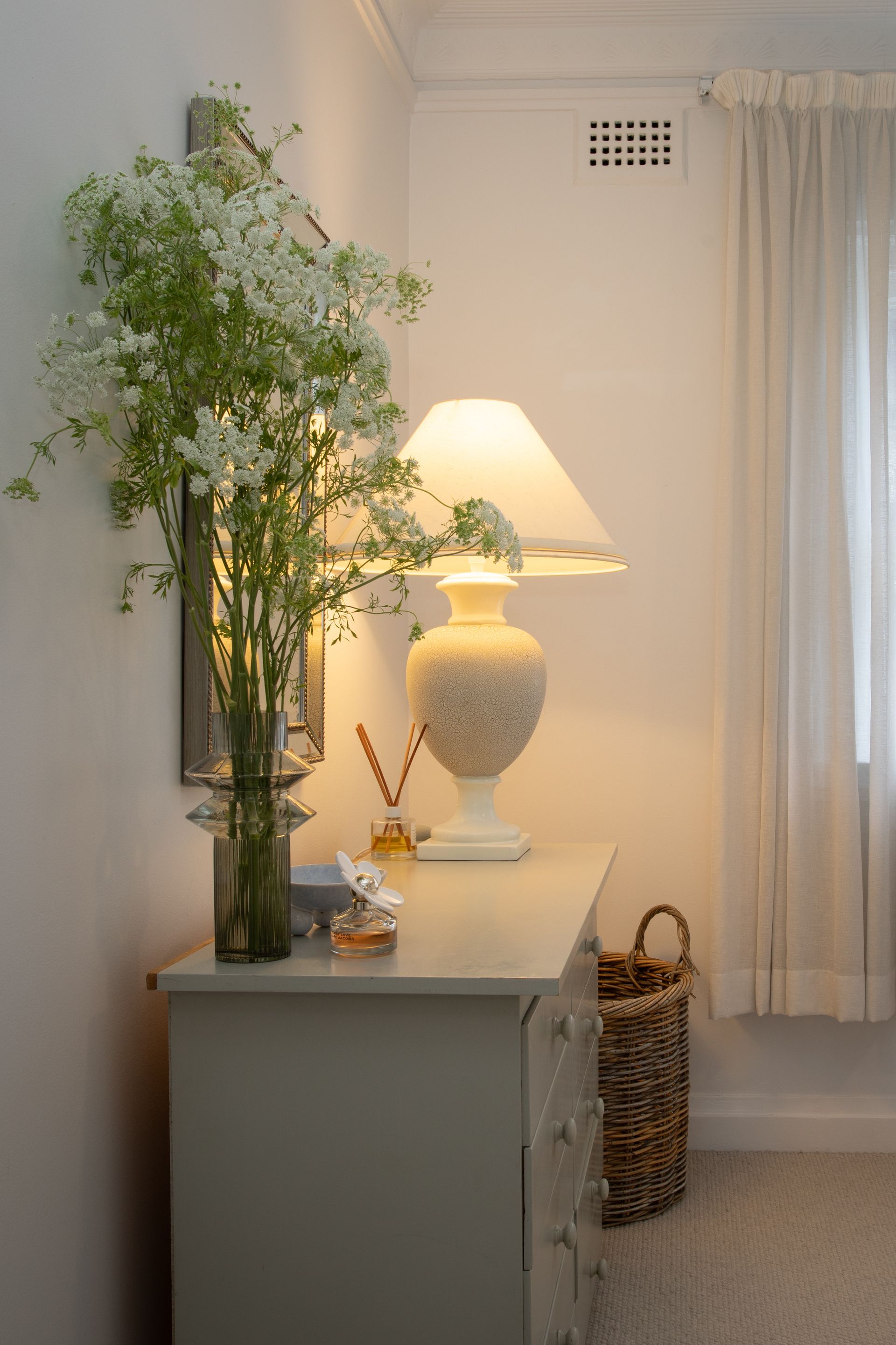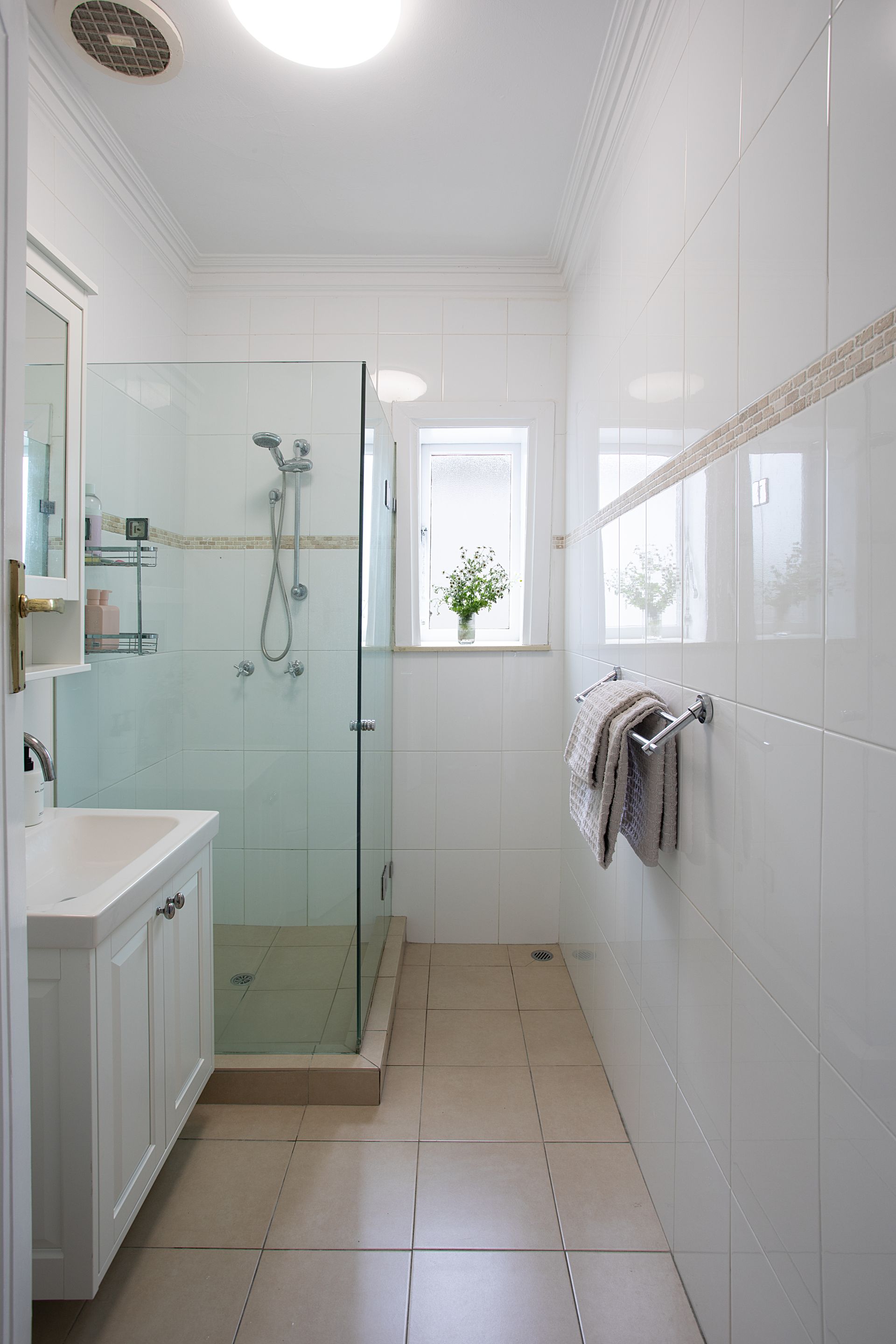 A full bathroom serves the home with classic Art Deco styling and modern fixtures. The bathroom features a combined shower and bath alongside toilet and vanity, with a washing machine and dryer tucked away for everyday convenience throughout your stay. Ceiling fans maintain air flow and comfort, while portable heating and cooling units adapt to Sydney's changing seasons.