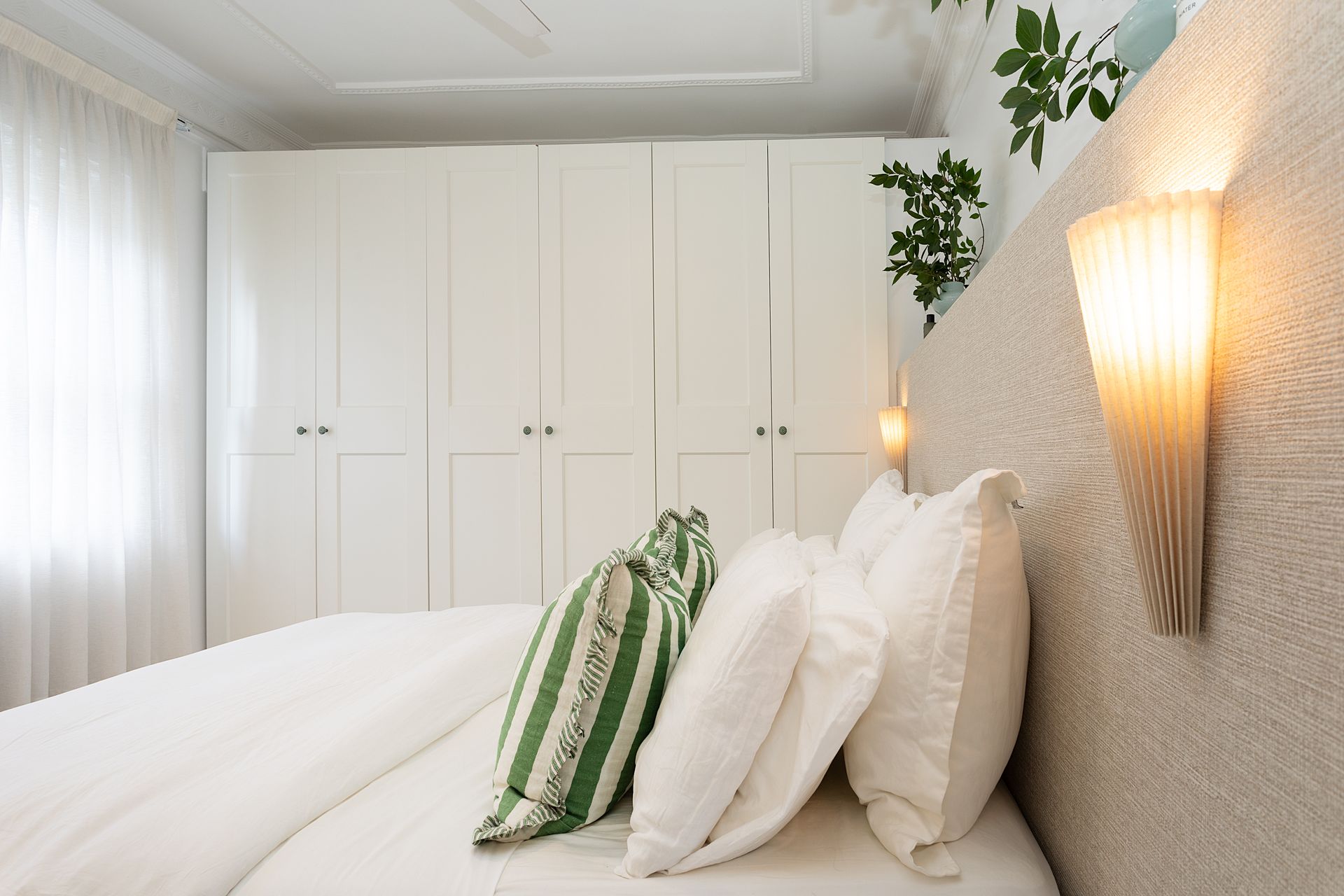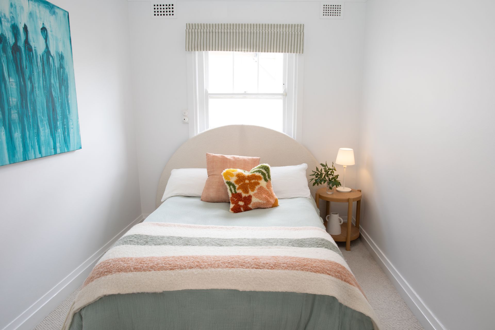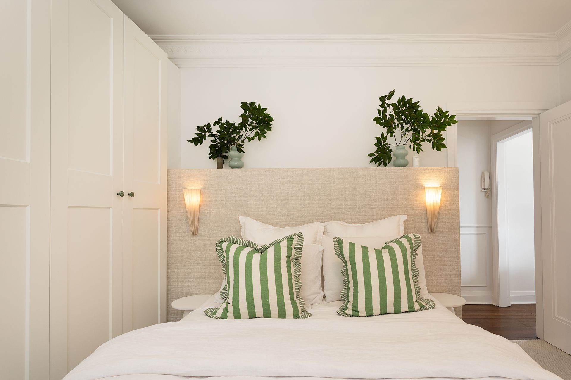 Two bedrooms provide peaceful retreats, each fitted with ceiling fans for year round comfort. The first bedroom features a queen bed dressed in quality linens, while the second offers a double bed, both spaces designed as calm sanctuaries for restful sleep. The top floor position ensures quiet nights, while blackout capabilities in each room guarantee undisturbed rest after days exploring Double Bay and the harbour.