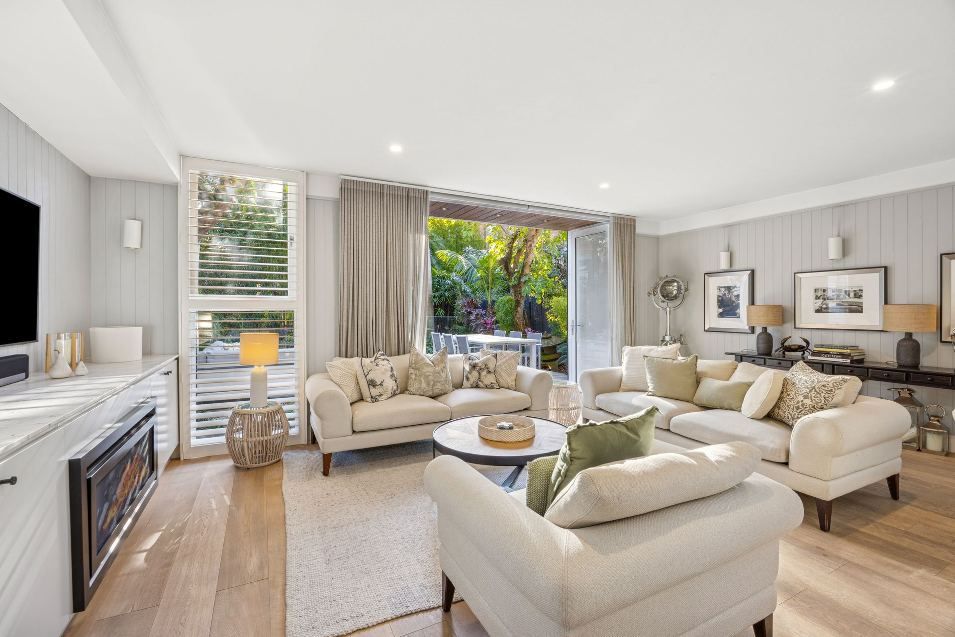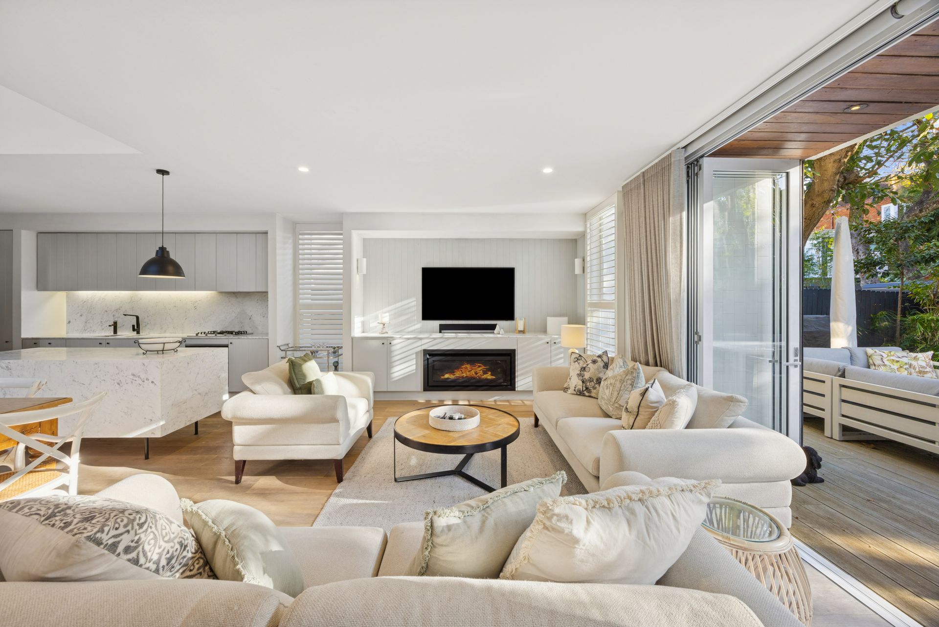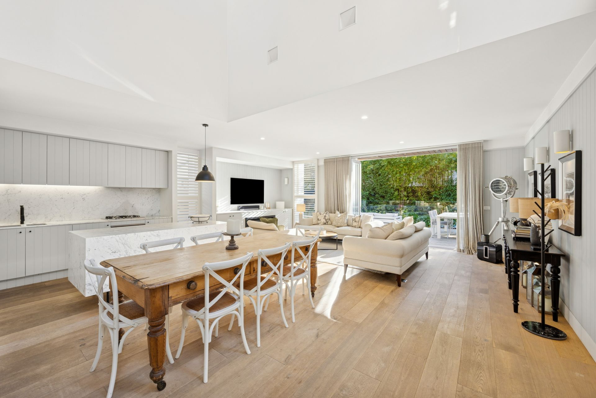 - Large central living and dining area overlooking the garden