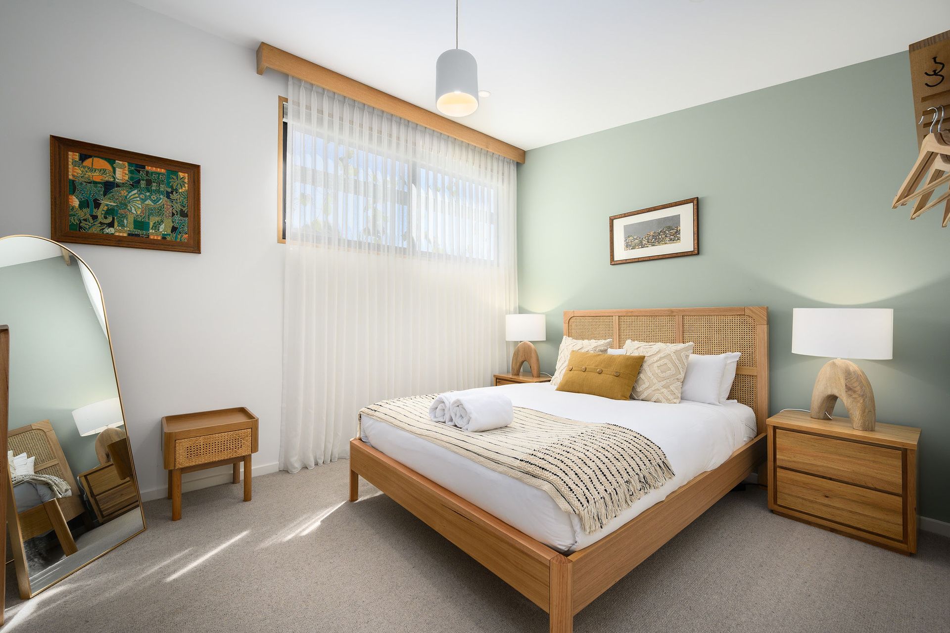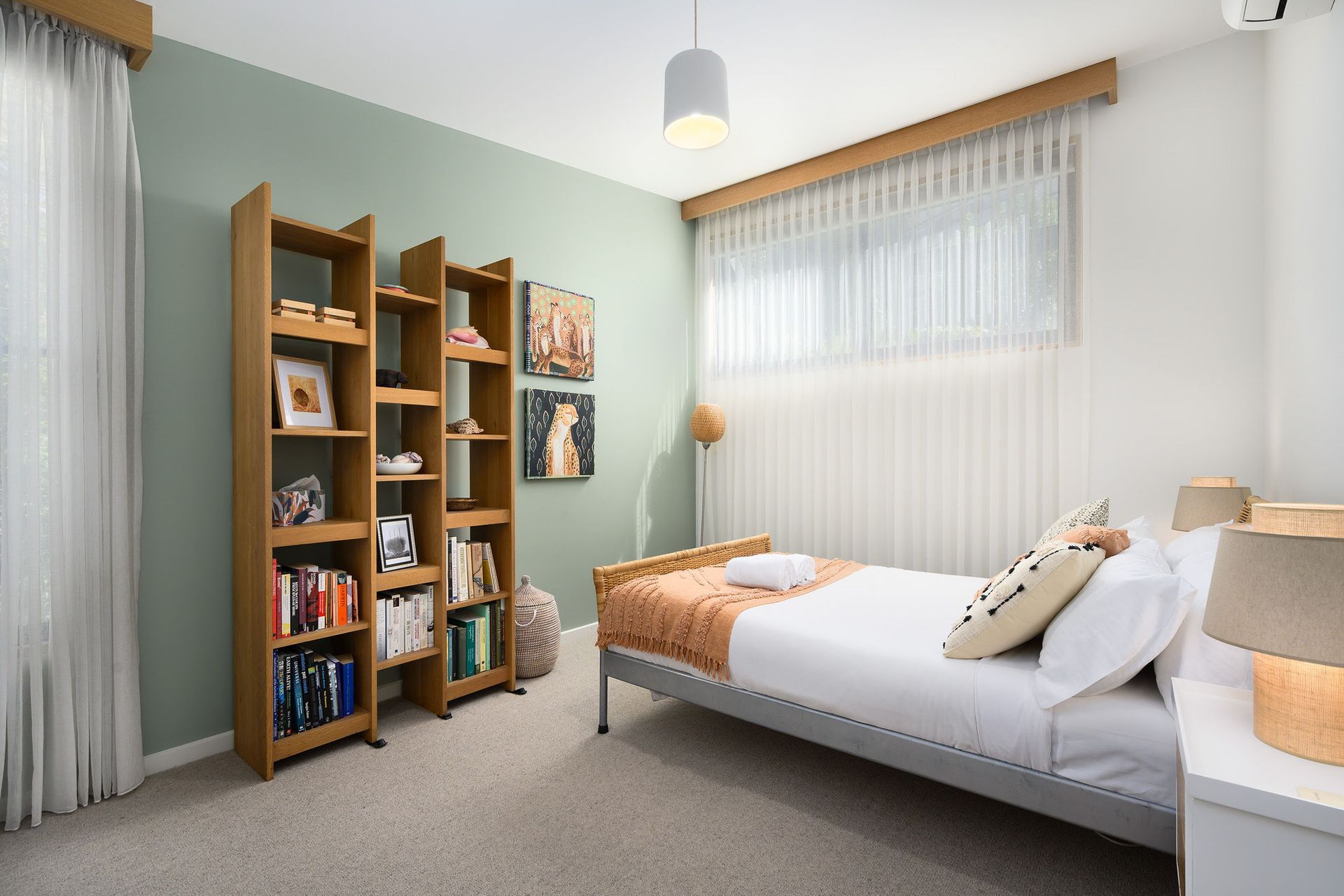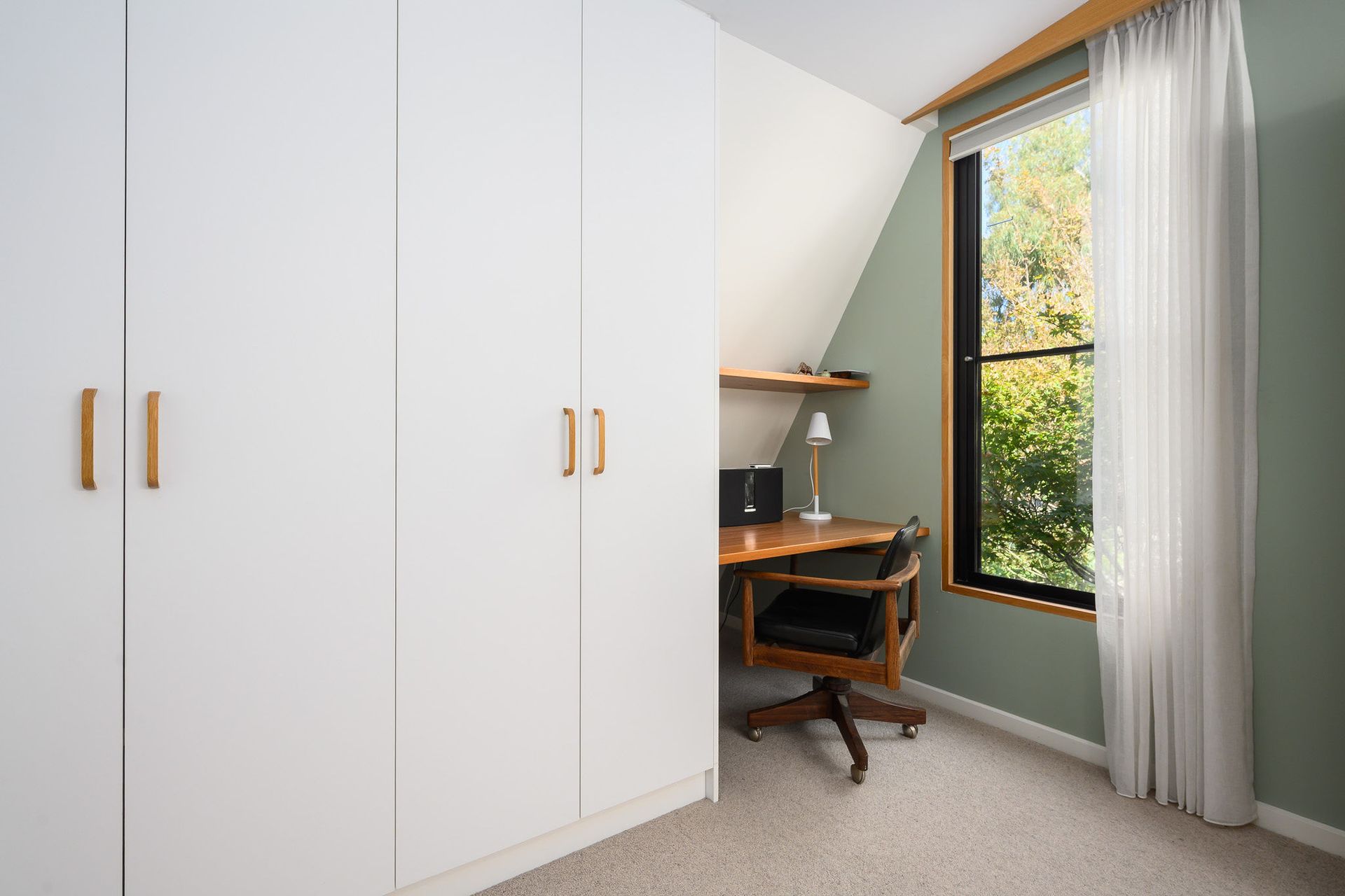 Upstairs, two additional restful bedrooms provide flexible accommodation. One holds a queen bed, another holds a double bed with a desk and bookshelves for those who work or study from home.
