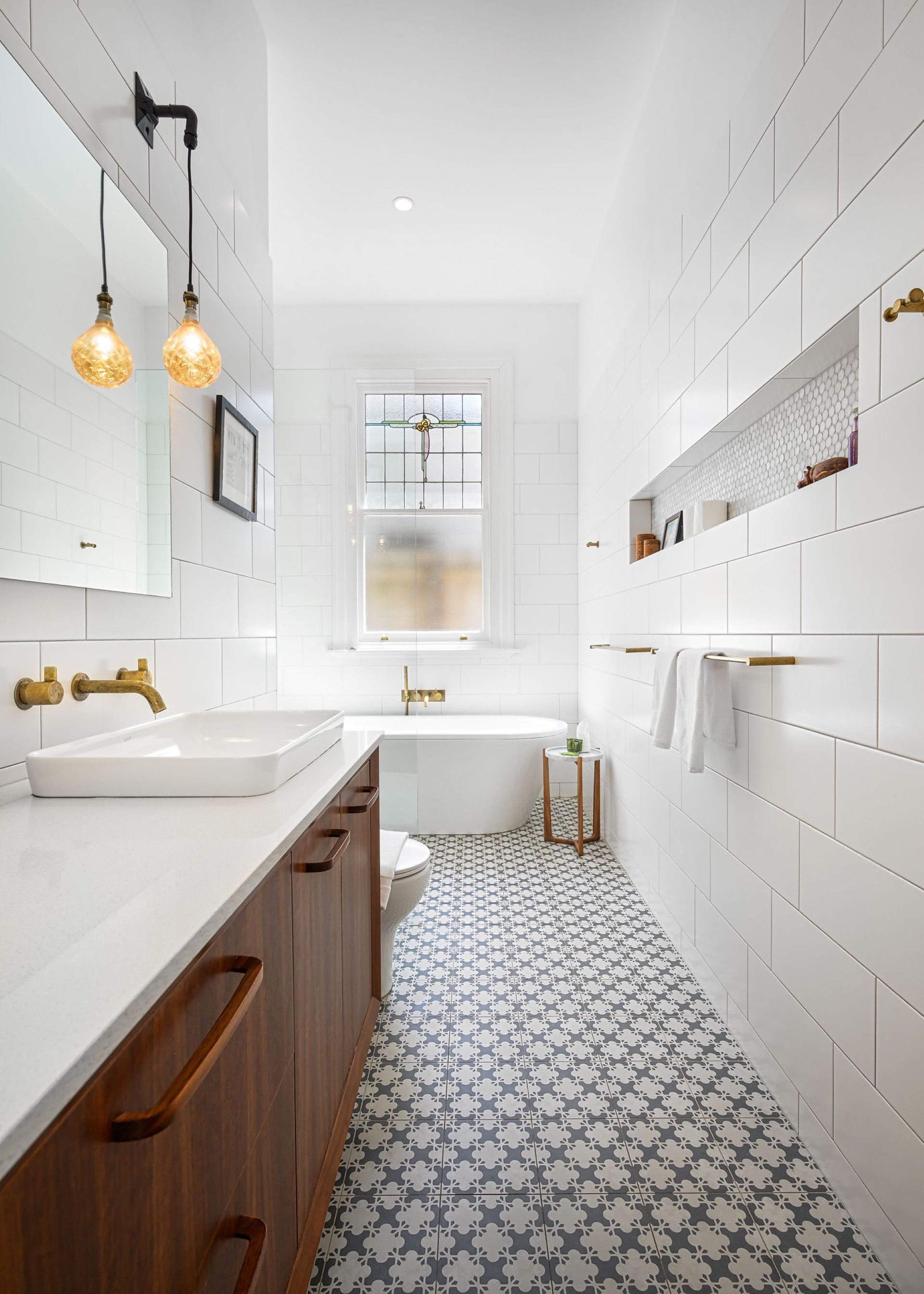 The ground floor bathroom combines heritage floor tiles and brass fixtures with a custom-made walnut vanity supporting a white vessel basin. A freestanding bath sits beside the walk in shower, beneath another stunning stained glass window. The modern upstairs bathroom combines charcoal tiles, timber vanity, white vessel basin, and rainfall shower with heated towel rails and designer corner pendant lights.
