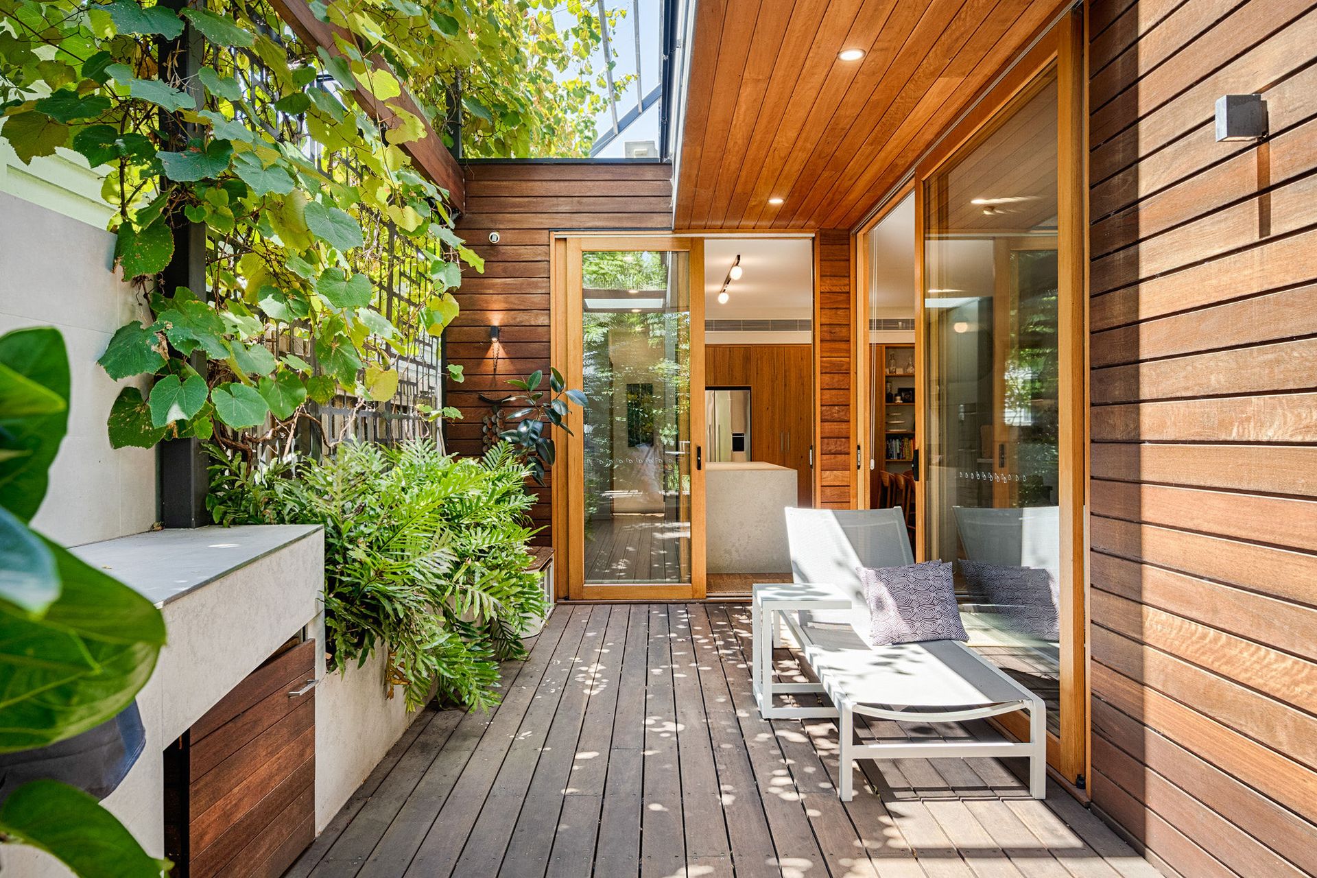 The private garden centres on a mature Japanese maple with foliage that shifts through seasons. Circular concrete stepping stones trace paths through lawn and garden beds, while high timber screening creates complete privacy. A timber deck extends from the living area with Weber BBQ and outdoor dining setup, while a sun lounge and side table beckon for a morning coffee or evening wine