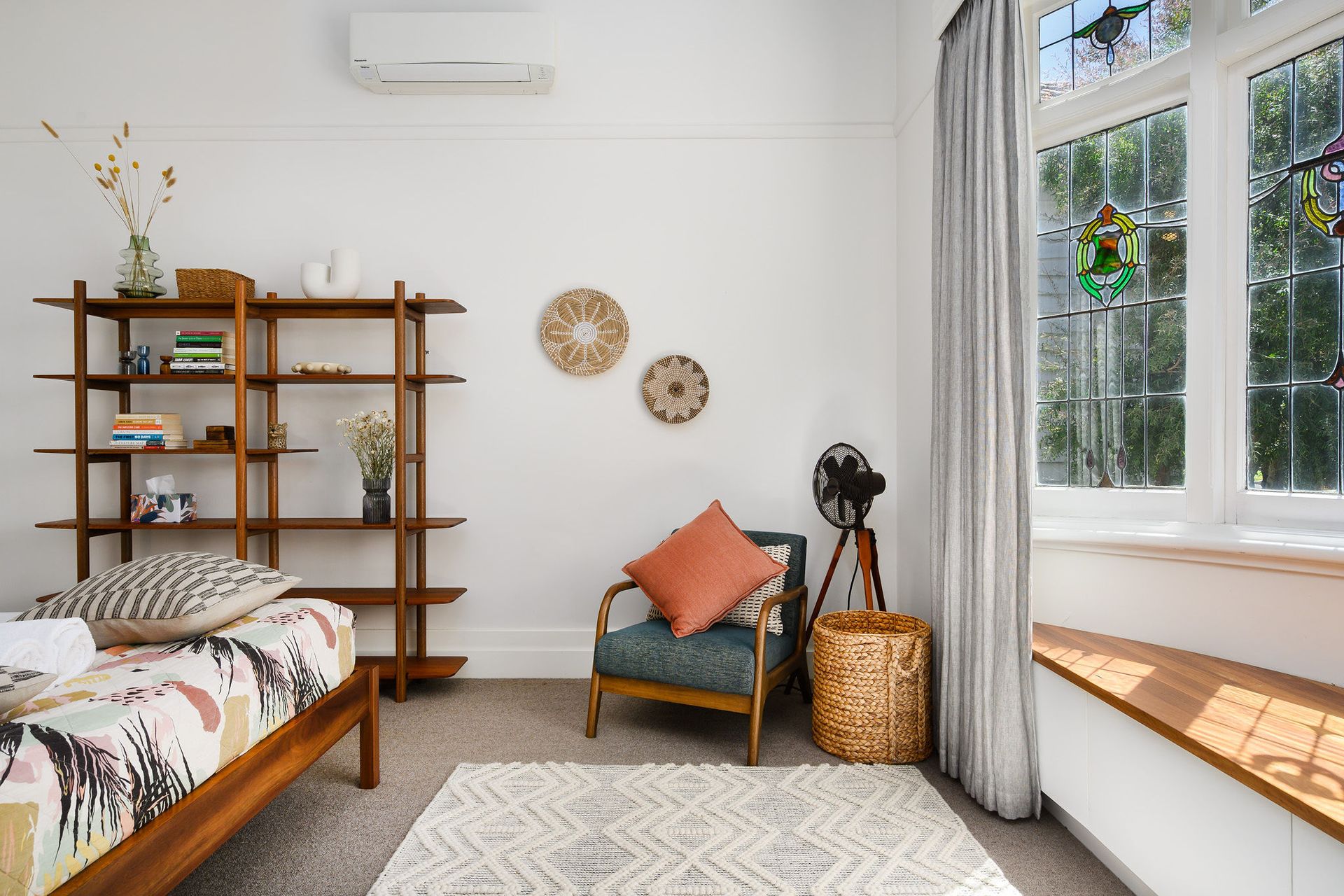 The master bedroom on the ground floor honours the Edwardian facade of the home with a queen bed facing original stained glass bay windows. With built-in storage and custom spotted gum shelving, consider this room a retreat from daily life. The generous second bedroom fits two king singles set against playful wallpaper, perfect for children or guests sharing space.