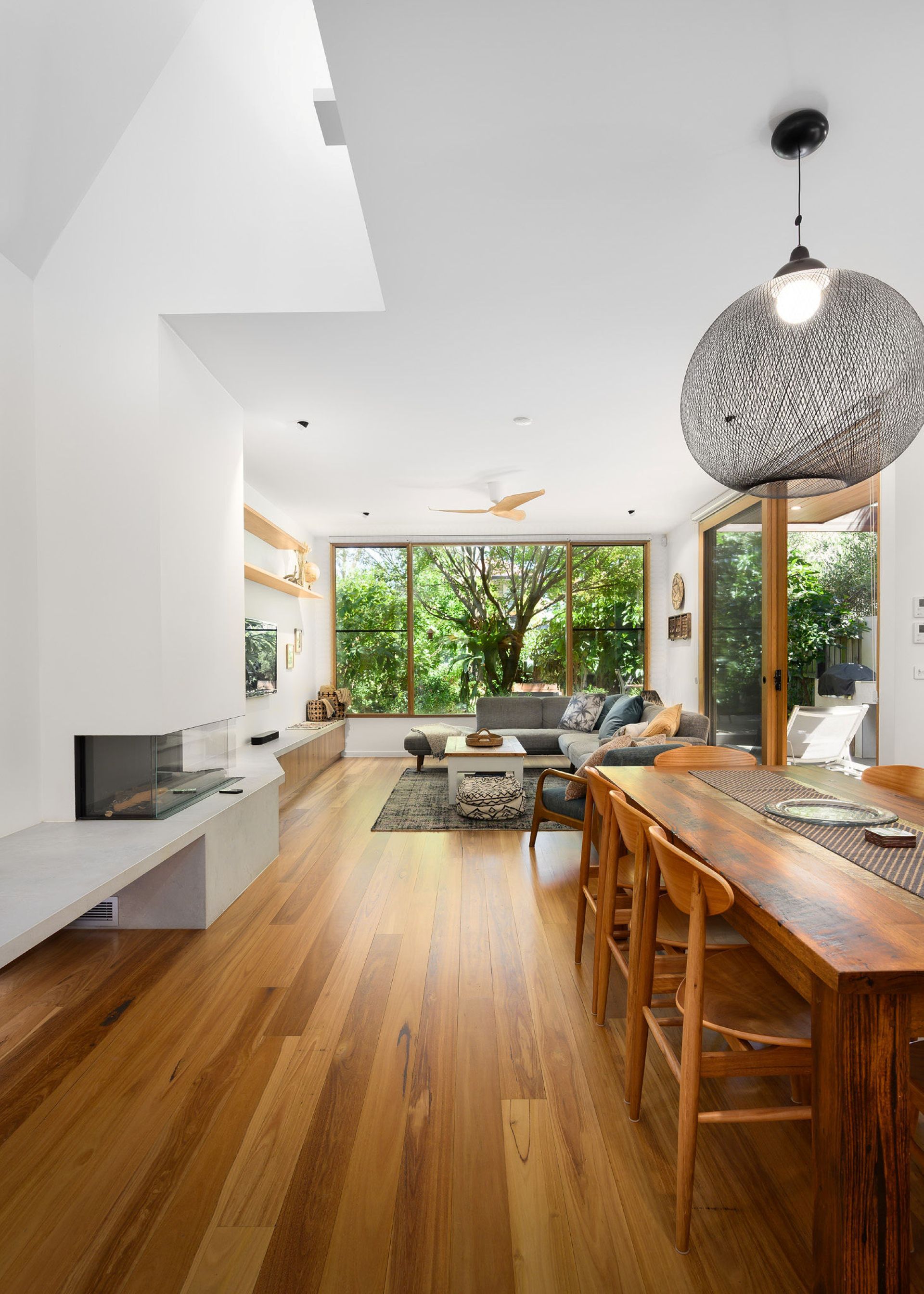 Open plan living flows beneath soaring white ceilings with timber cabinetry defining zones without walls. Large format woven pendant lights hover above the reclaimed timber dining table, while floor to ceiling timber framed windows flood the space with natural light. The corner grey sofa faces a wall mounted television with integrated surround sound, creating a relaxed media zone. A minimalist fireplace with glass panels anchors one end of the living area. Timber flooring runs continuously from kitchen through living to the garden threshold, where sliding glass doors dissolve the boundary between indoor comfort and outdoor sanctuary.
