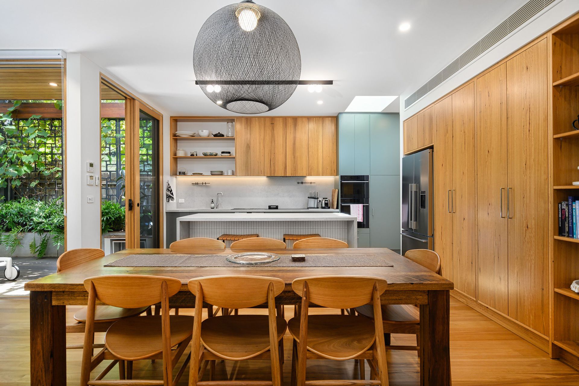 The kitchen pairs teal lower cabinets with blonde timber uppers and open shelving that displays ceramics and glassware. A white tiled island with waterfall edge provides seating for three tan leather stools, while the induction cooktop includes one gas burner for precise flame cooking. Dual stainless steel refrigerators, twin ovens, and integrated dishwasher handle any culinary demands. The coffee station and ample pantry space keep countertops clear.