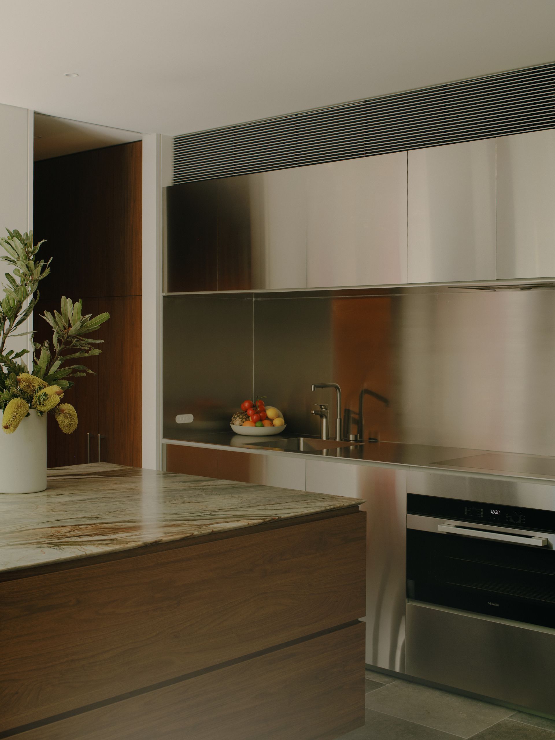 Step through the entrance and into the ground floor's generous open plan living space, where clean lines and thoughtful spatial planning invite natural light to flood across pale stone floors. The kitchen with its sleek minimalist cabinetry, concealing a butler's pantry that houses both laundry facilities and ample storage. The kitchen island becomes the home's social anchor, the kitchen is equipped with an induction hob, electric oven, and a premium Zip tap delivering instant boiling and sparkling water. A pod coffee machine and dishwasher complete the culinary suite, while underfloor heating extends beneath your feet, creating an atmosphere of quiet luxury. The space flows seamlessly toward the private courtyard garden, an intimate outdoor sanctuary perfect for sunset aperitifs or long weekend lunches beneath the sky. Two bedrooms occupy this level: one with a queen bed, the other featuring two king singles, both cooled by ceiling fans and bathed in natural light. The ground floor bathroom becomes a spa retreat with both bath tub and overhead shower, warmed by underfloor heating on crisp mornings. Ascend the striking staircase to discover the upper level's serene sleeping quarters, where ducted air conditioning maintains perfect comfort year-round. The principal bedroom showcases a king bed and private ensuite shower featuring marble tiles. A fourth bedroom with a king single bed sits alongside a dedicated office nook, ideal for those who blend work and leisure. Split system air conditioning in the main living area and the master bedroom ensures climate control throughout the seasons.