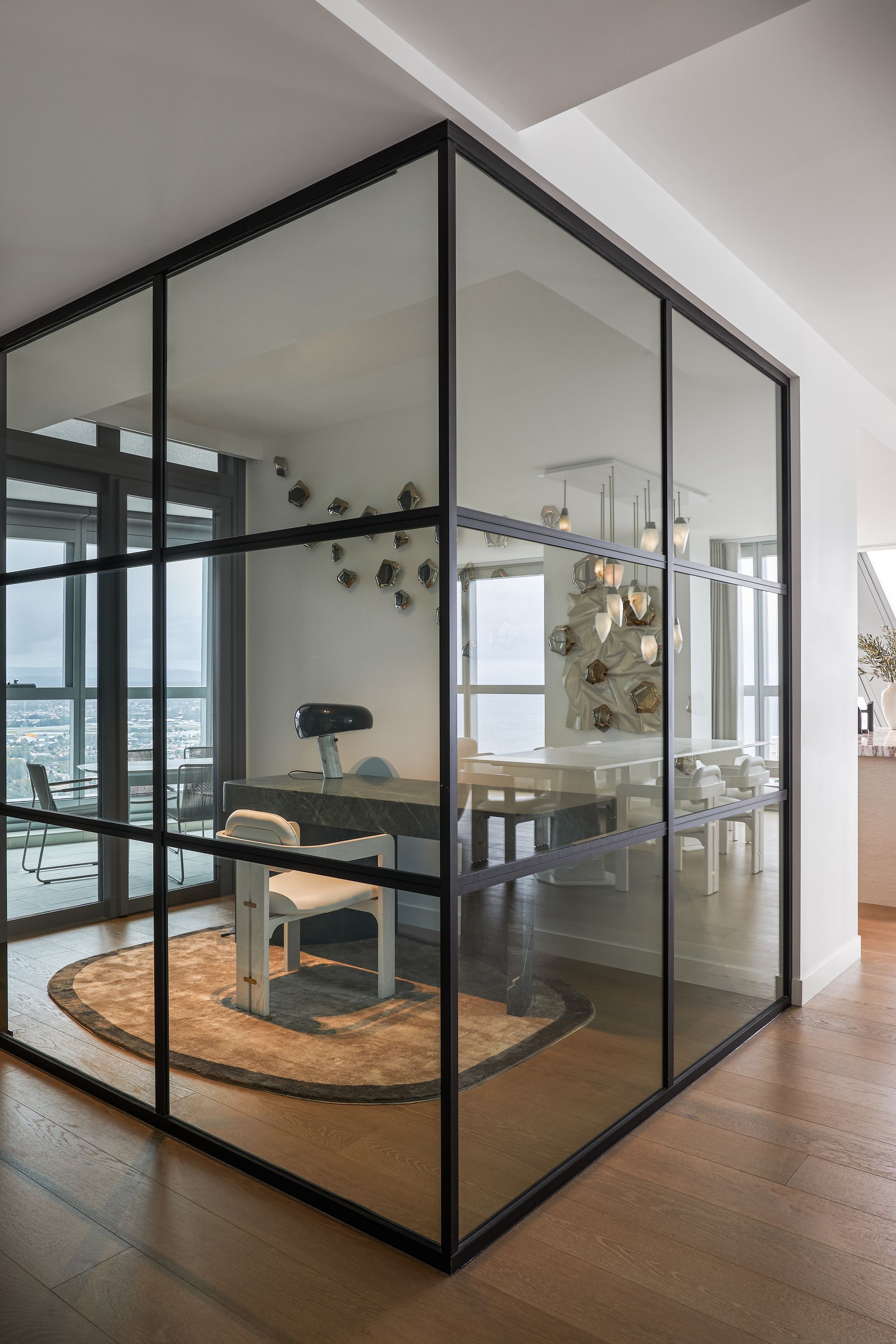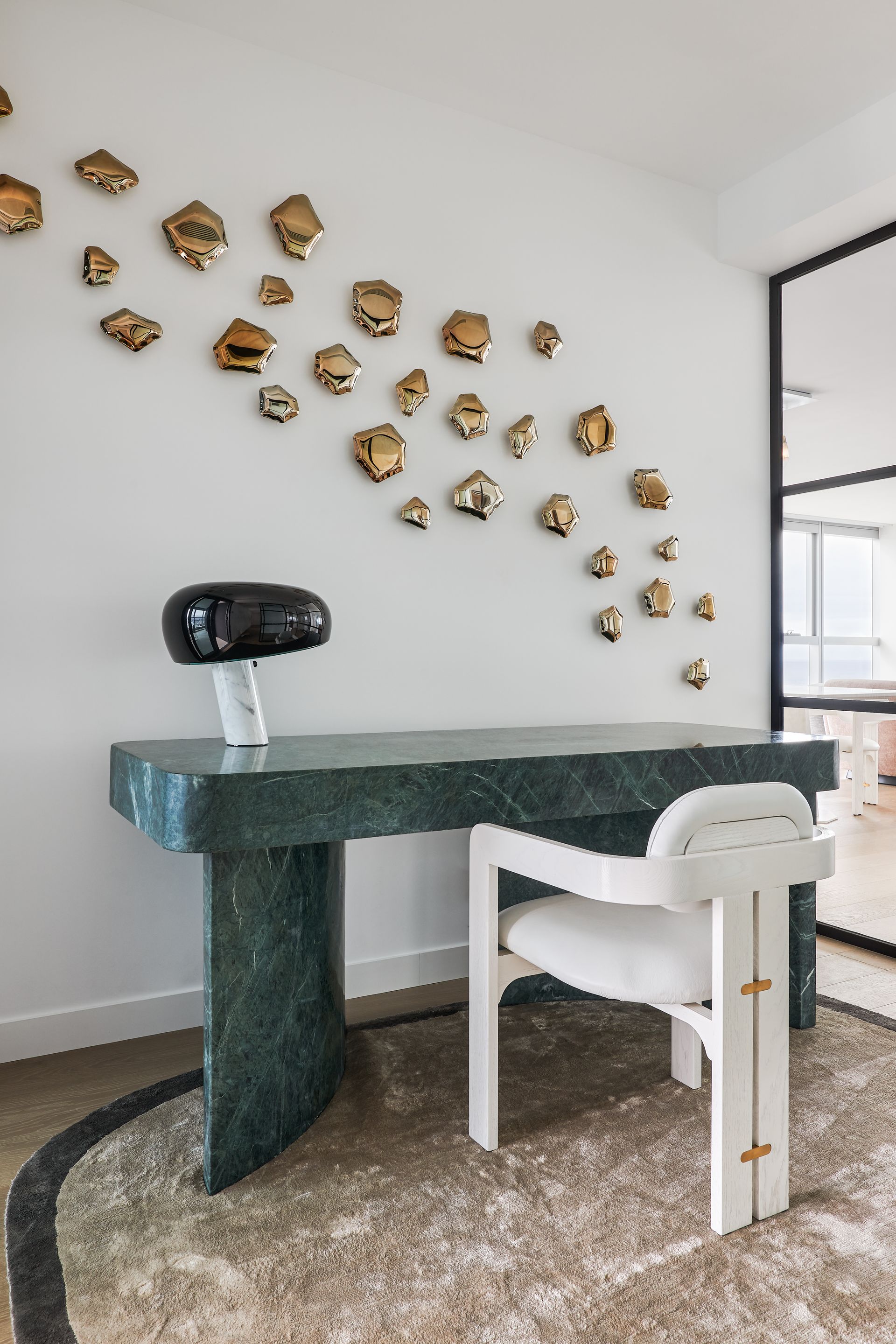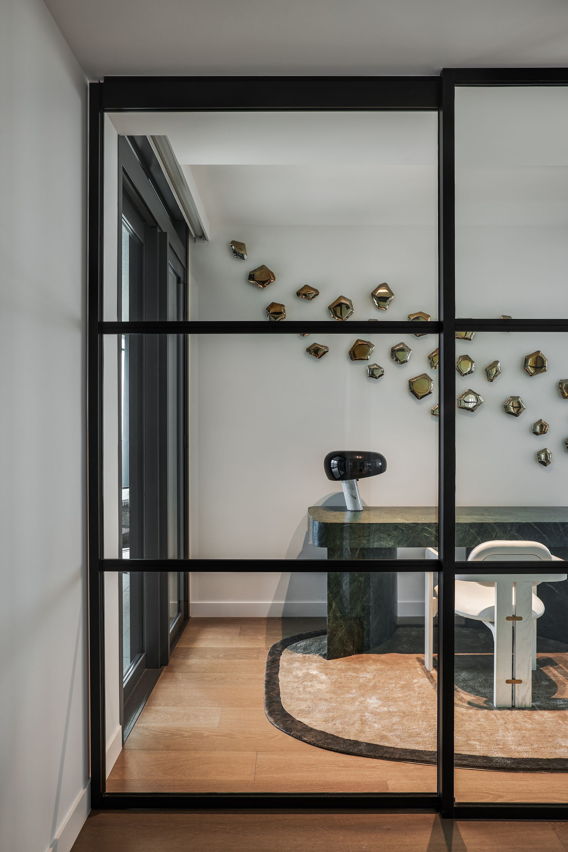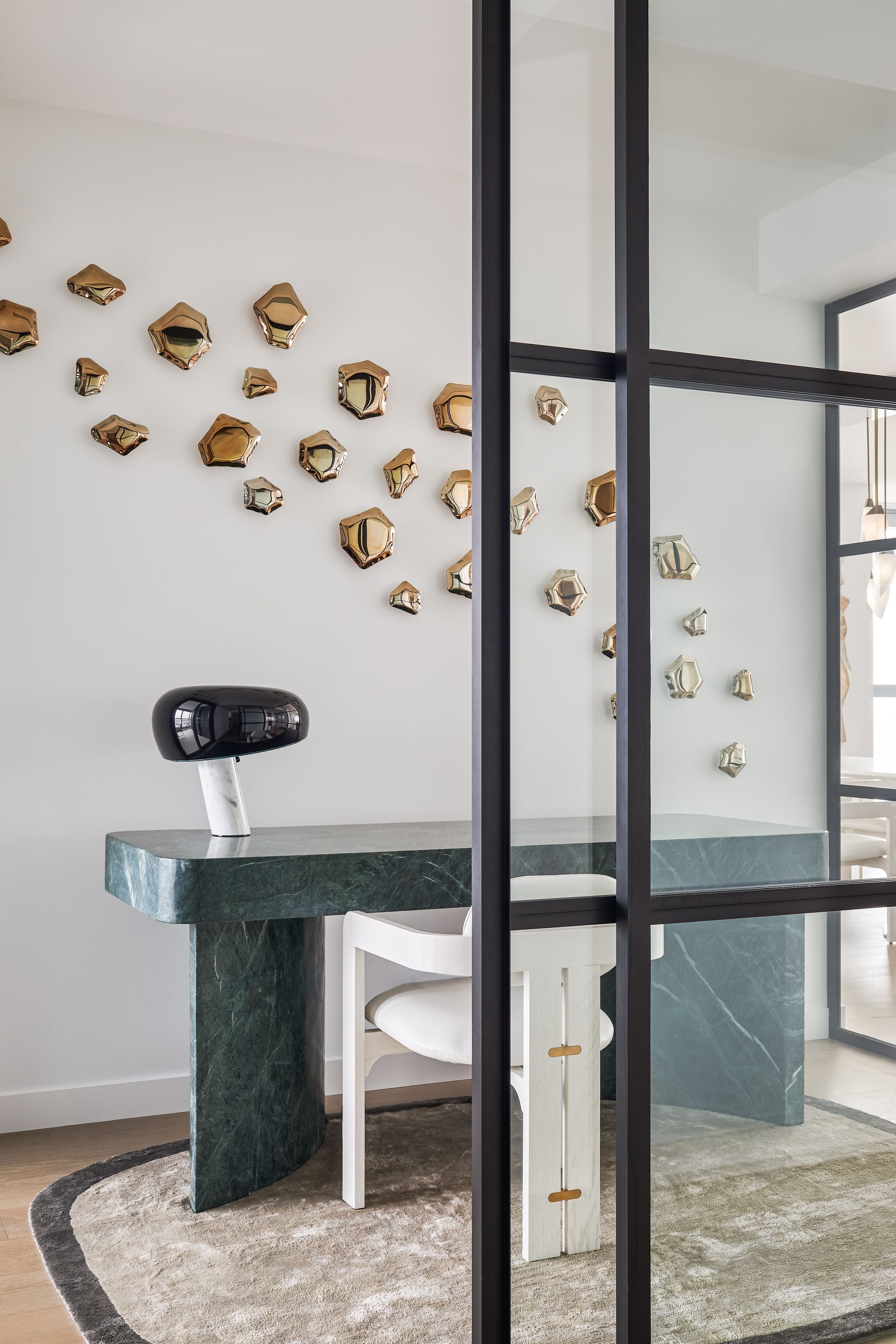 - Dedicated study and office with green marble desk and glass partition