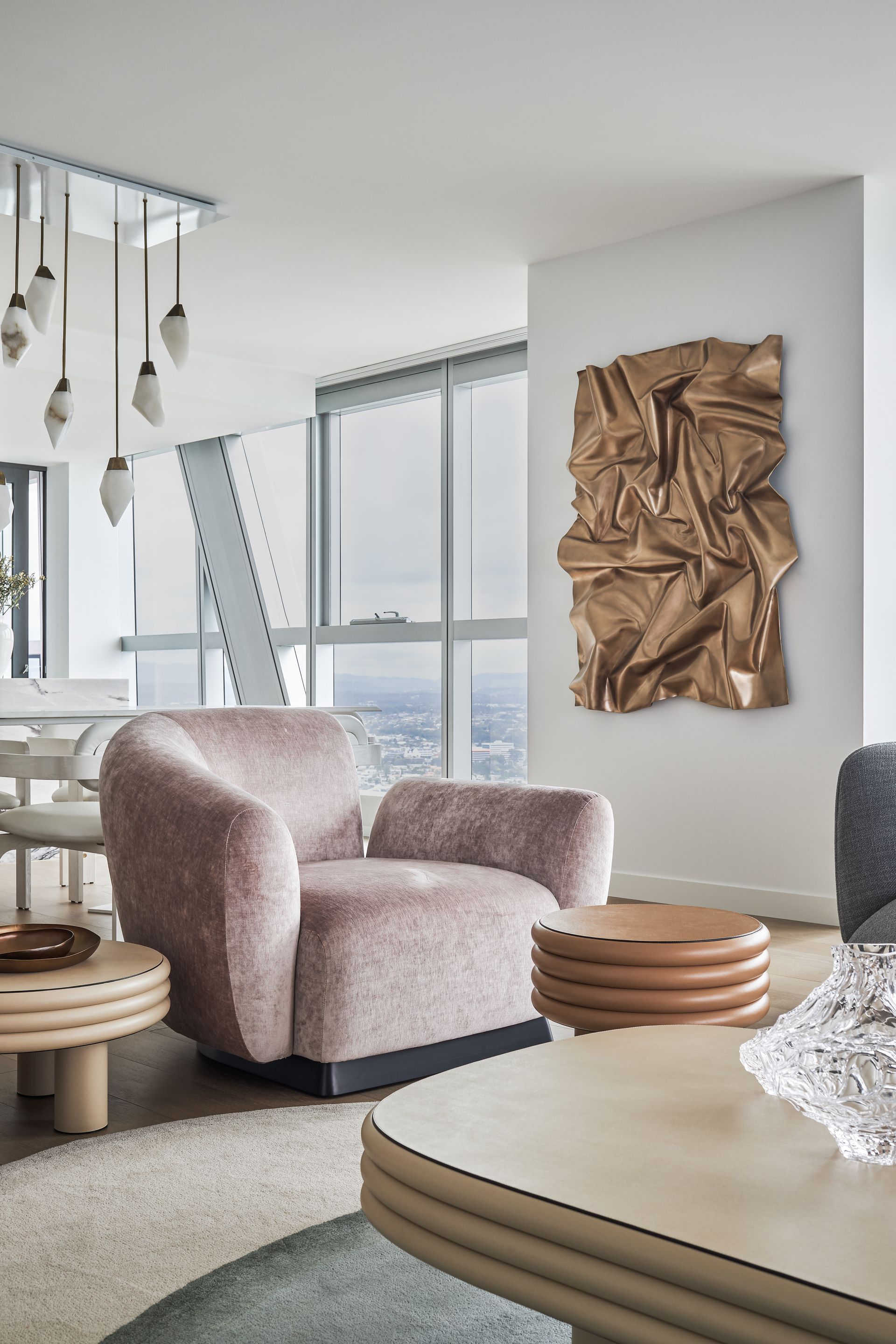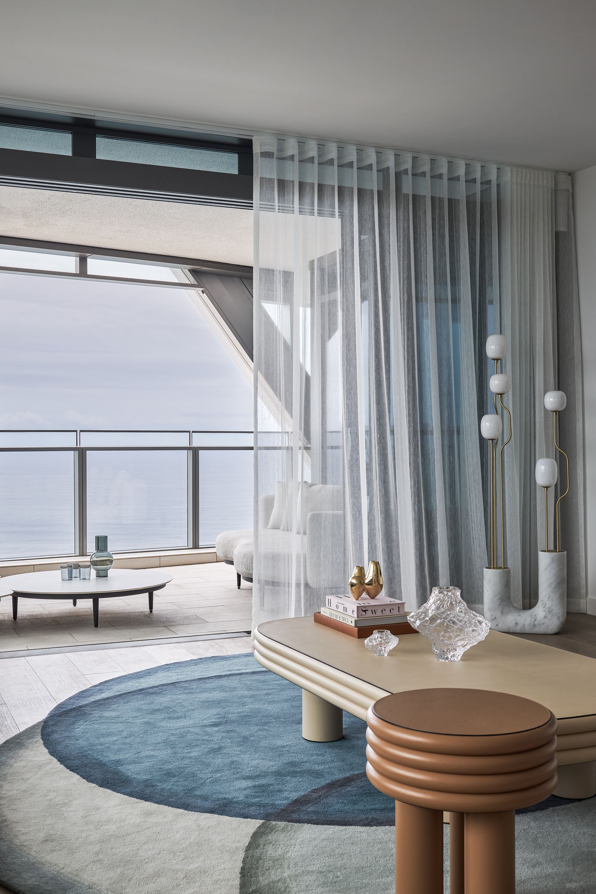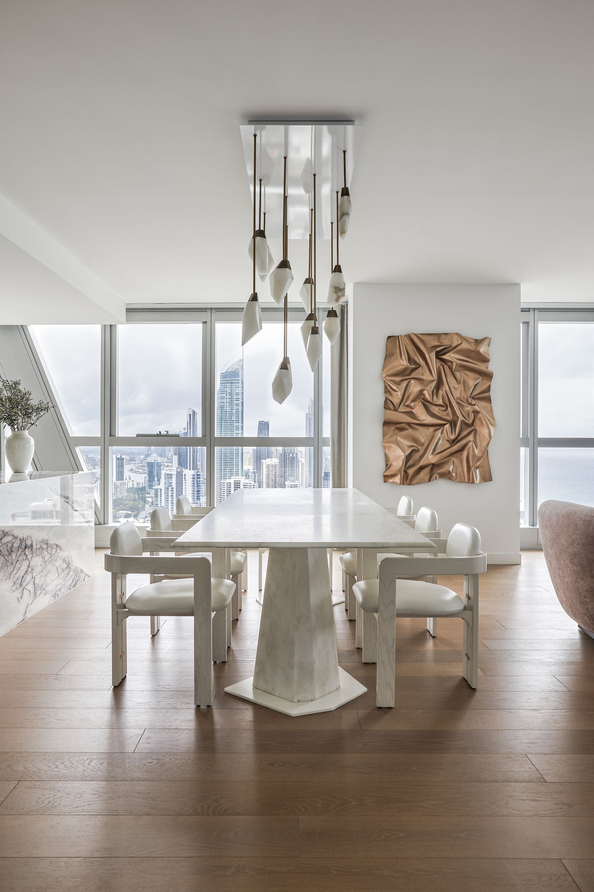 The open-plan living and dining area is furnished with intention, curved sofas in warm blush and charcoal, a sculptural coffee table, and a bold copper wall installation that commands attention against the floor-to-ceiling windows. The views from here are simply hard to overstate: the Pacific Ocean stretches across the entire northern and eastern horizon, with the Surfers Paradise skyline framing the city to the north and the Nerang River winding through the suburbs below. The kitchen is fitted with premium appliances, stone benchtops, and a large island bench ideal for casual dining. A dedicated study with a green marble desk and a steel-framed glass partition adds a functional layer that rarely appears at this level of holiday accommodation.