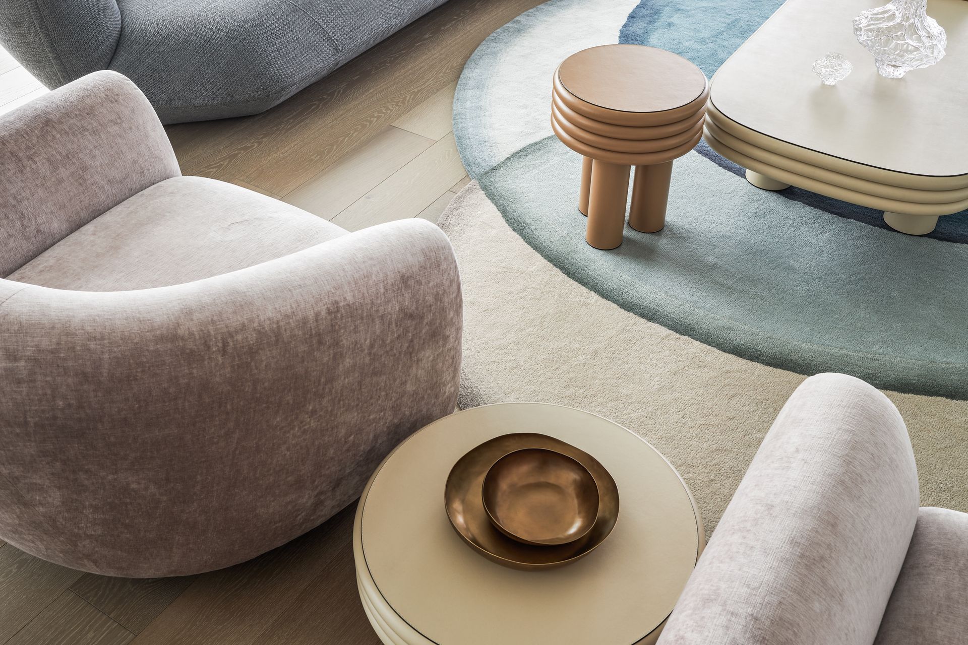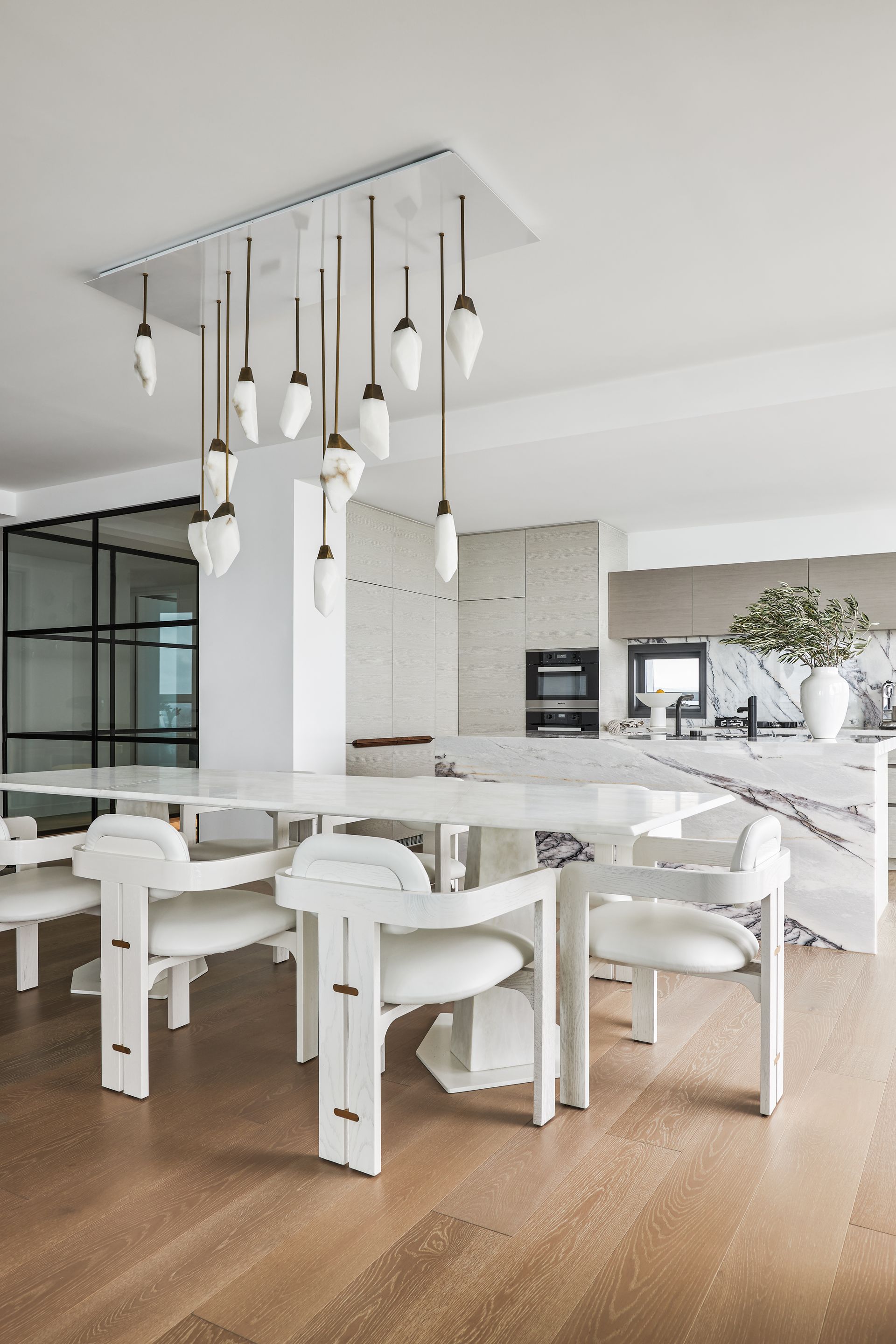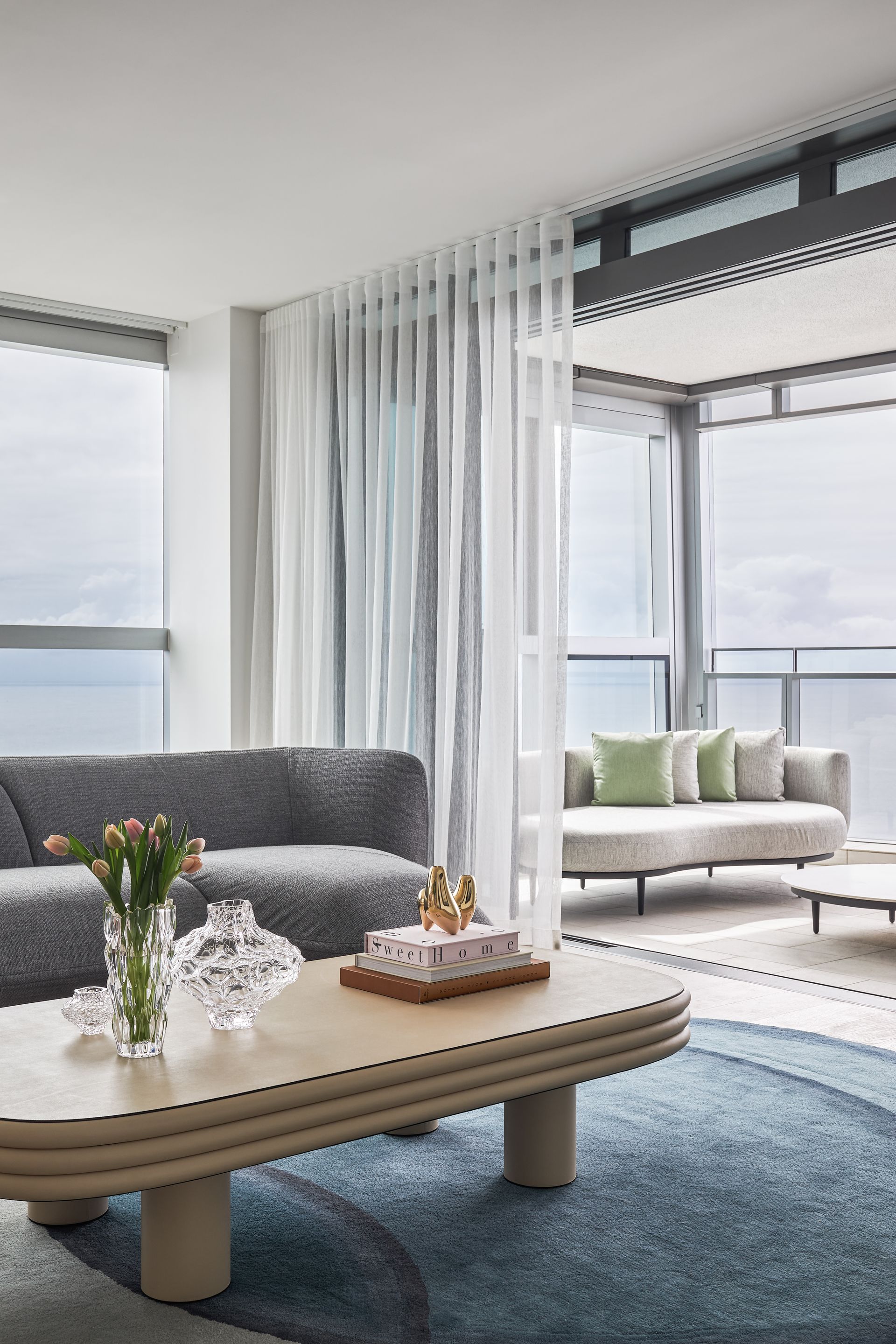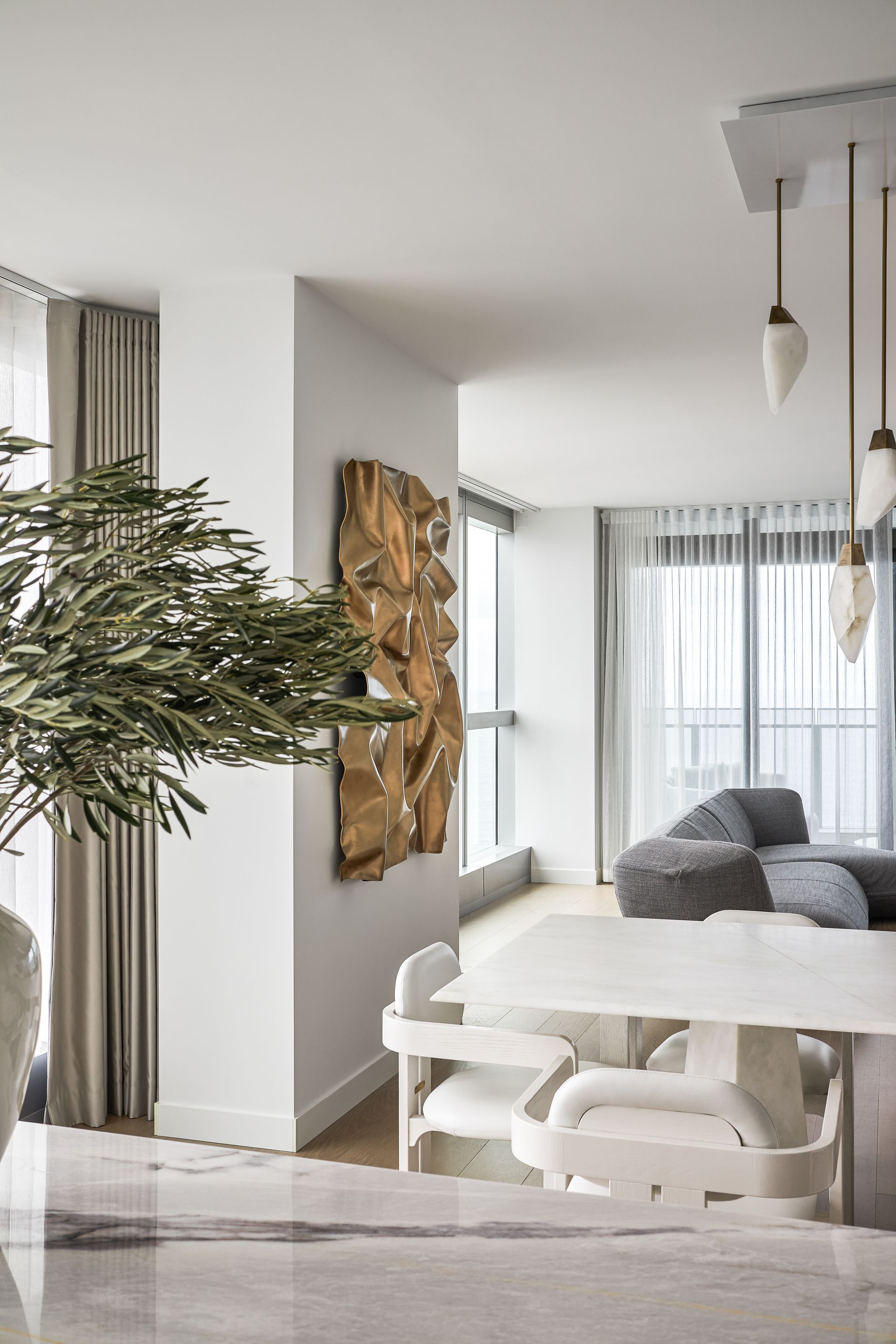 The open-plan living and dining area is furnished with intention, curved sofas in warm blush and charcoal, a sculptural coffee table, and a bold copper wall installation that commands attention against the floor-to-ceiling windows. The views from here are simply hard to overstate: the Pacific Ocean stretches across the entire northern and eastern horizon, with the Surfers Paradise skyline framing the city to the north and the Nerang River winding through the suburbs below. The kitchen is fitted with premium appliances, stone benchtops, and a large island bench ideal for casual dining. A dedicated study with a green marble desk and a steel-framed glass partition adds a functional layer that rarely appears at this level of holiday accommodation.