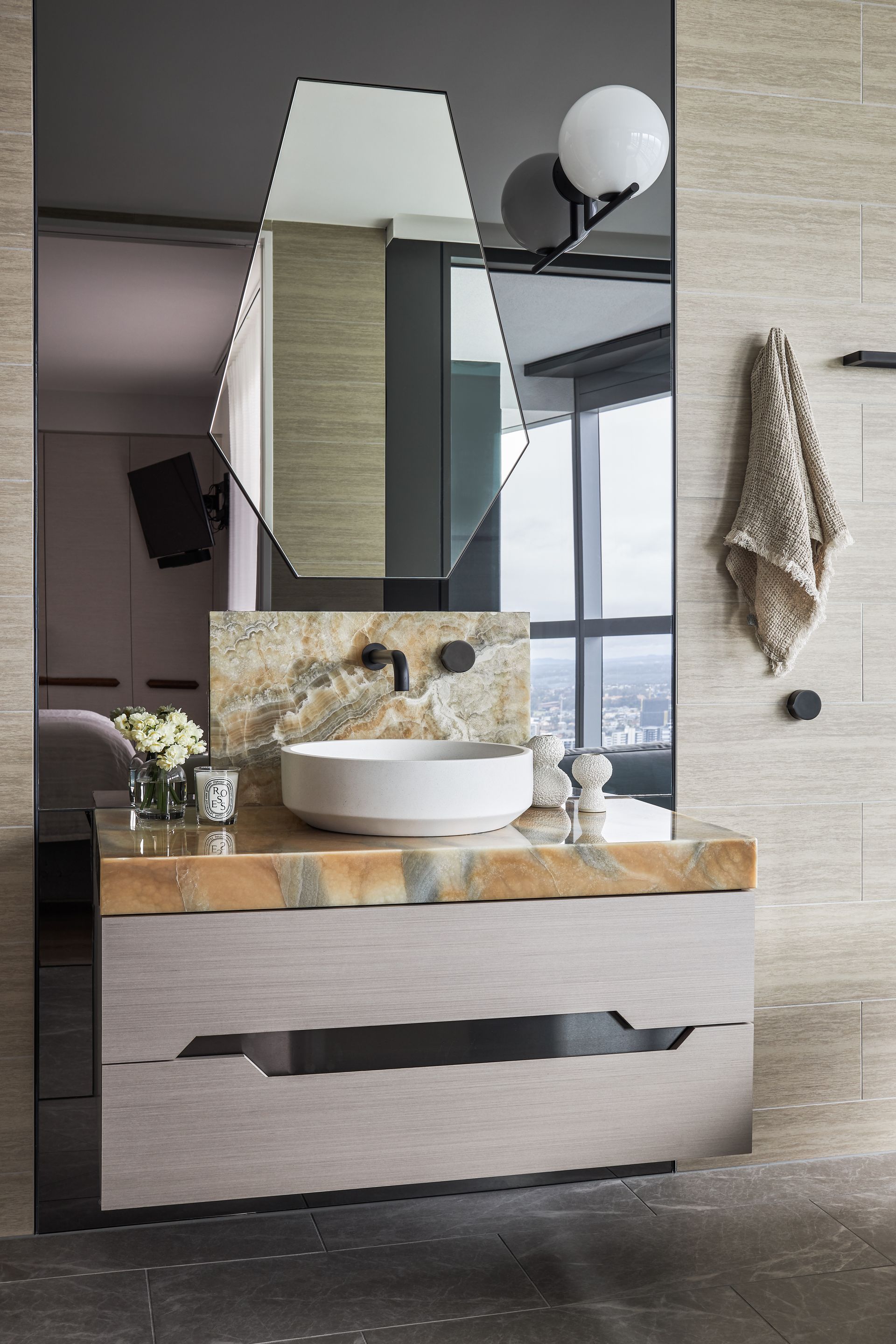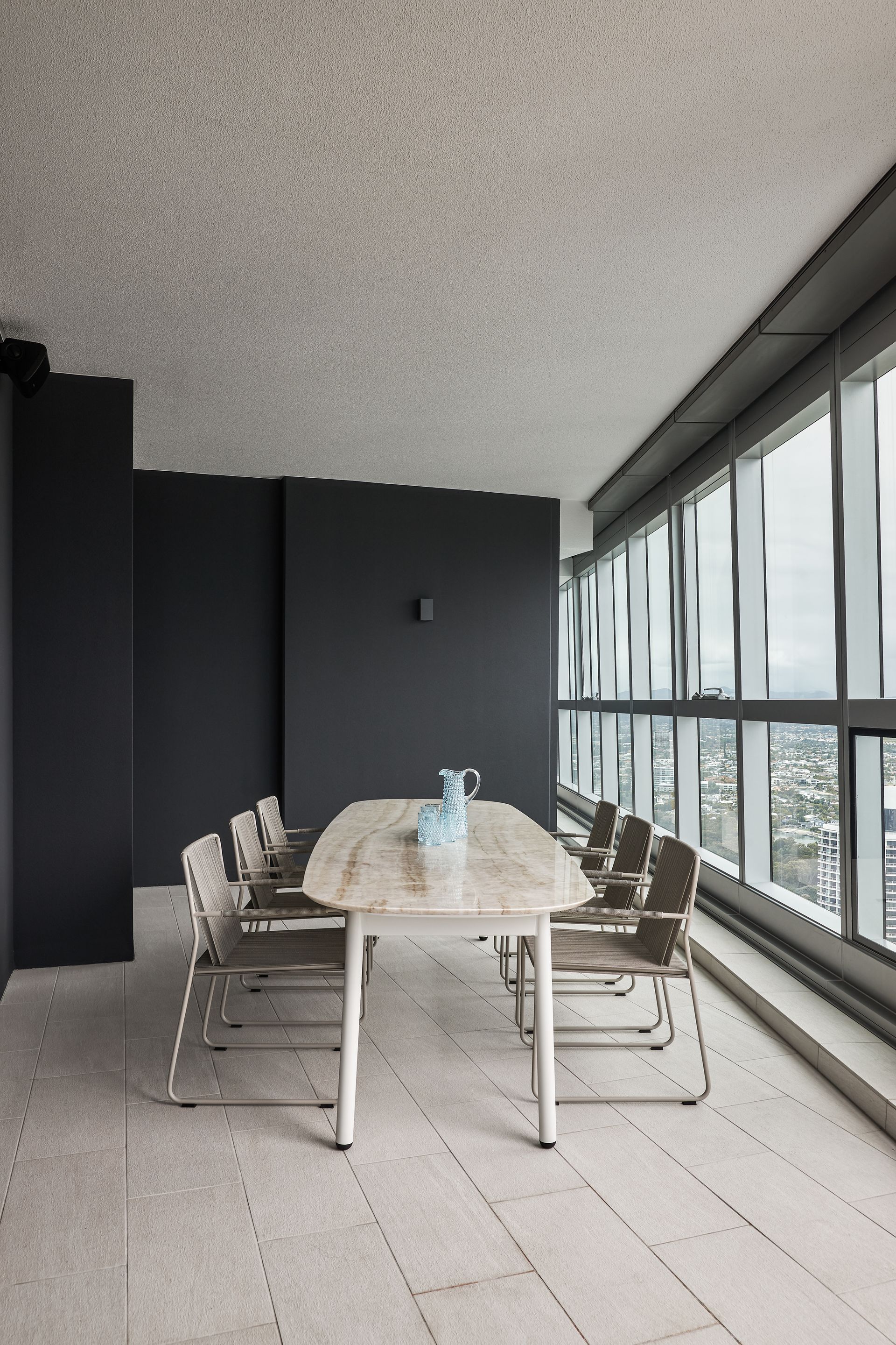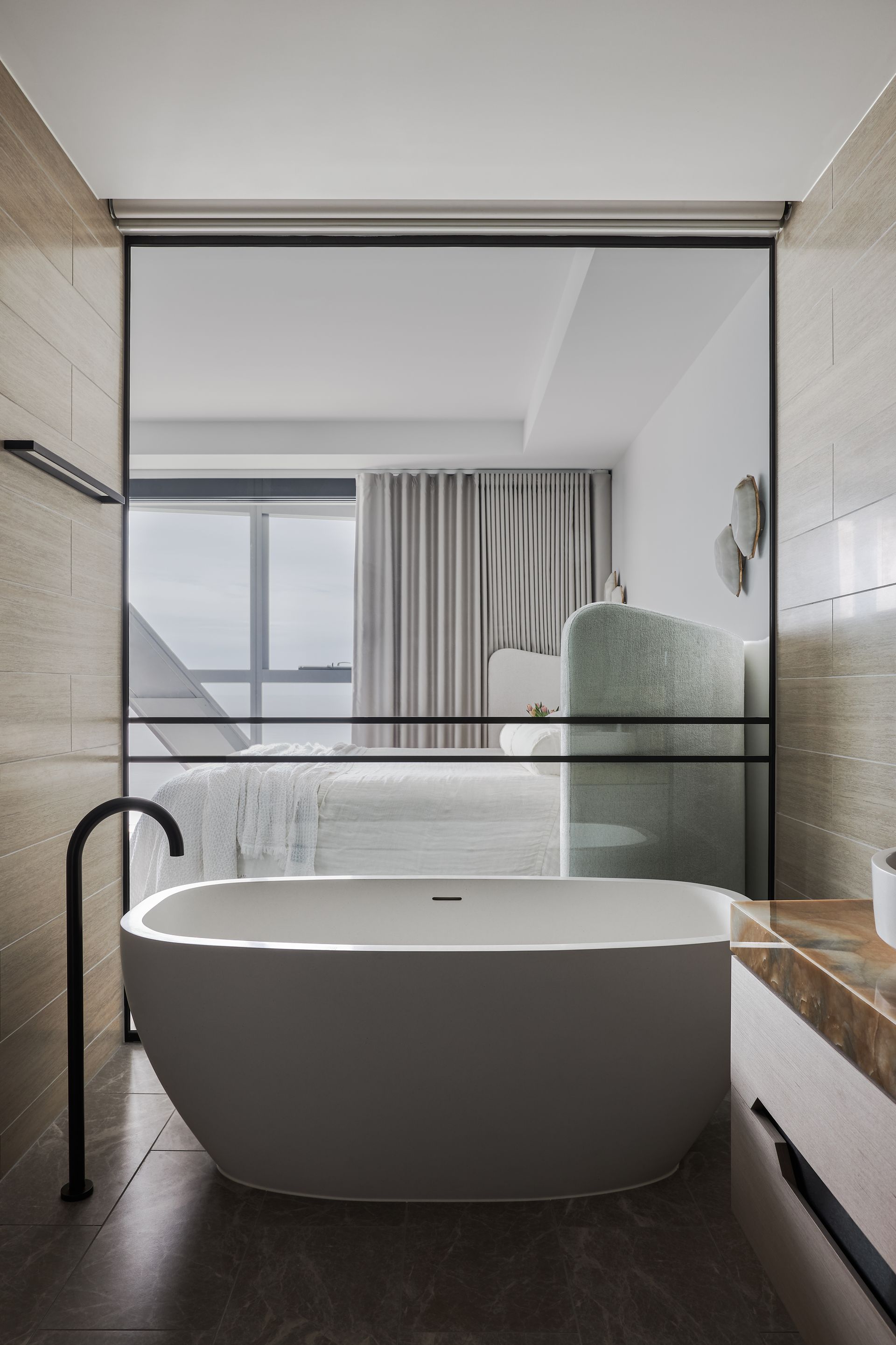 Step out onto the furnished balcony and the scale of the outlook truly hits. Whether it is morning coffee with the sun climbing over the ocean or evening drinks with the city lights reflected in the water below, the terrace earns its place as the heart of the apartment. Inside, the three bedrooms are each well-curated and quietly styled. The master suite features a king bed with an architectural upholstered bedhead, integrated bedside tables, egg-shaped wall sconces, and a luxurious ensuite complete with a freestanding soaking tub, double vessel sinks set on a rich onyx stone vanity, and a walk-in rainfall shower behind a glass-pannelled partition, with a direct view back to the bedroom and beyond. The second bedroom offers a queen bed and the third accommodates two singles, which can be converted to a king on request. The bathrooms throughout maintain the same elevated material palette, dark stone floors, matte black fixtures, and warm timber cabinetry. Two secure undercover car spaces are included, a genuine convenience in this part of Surfers Paradise.