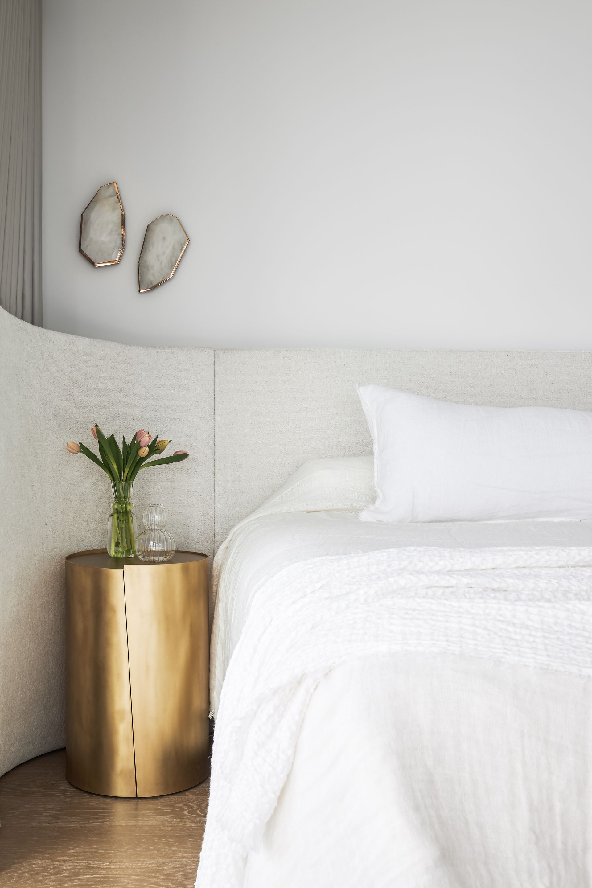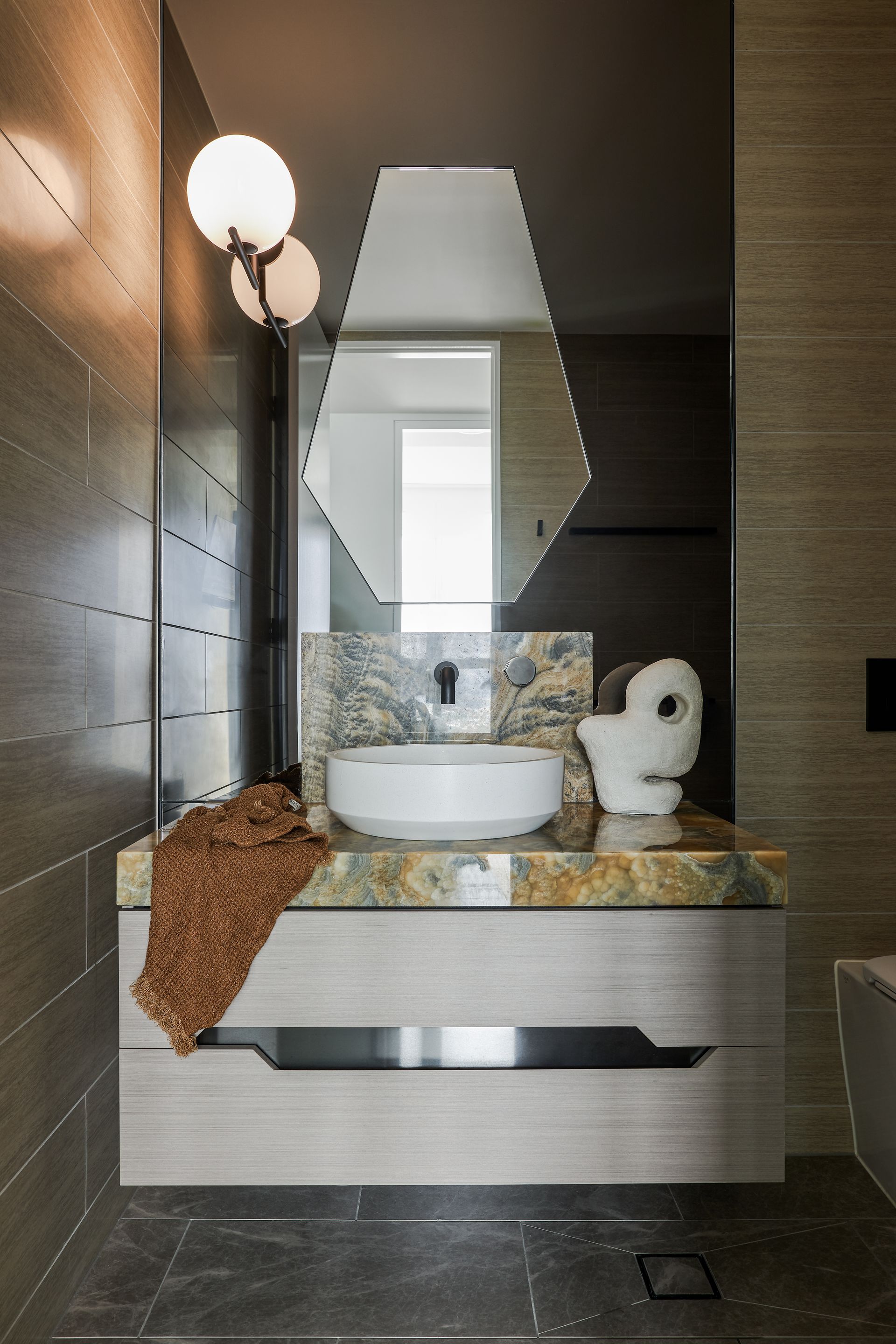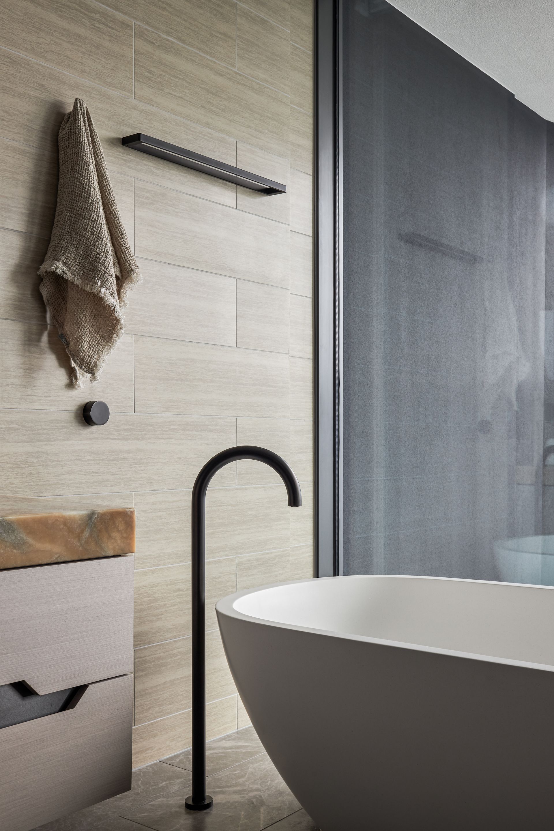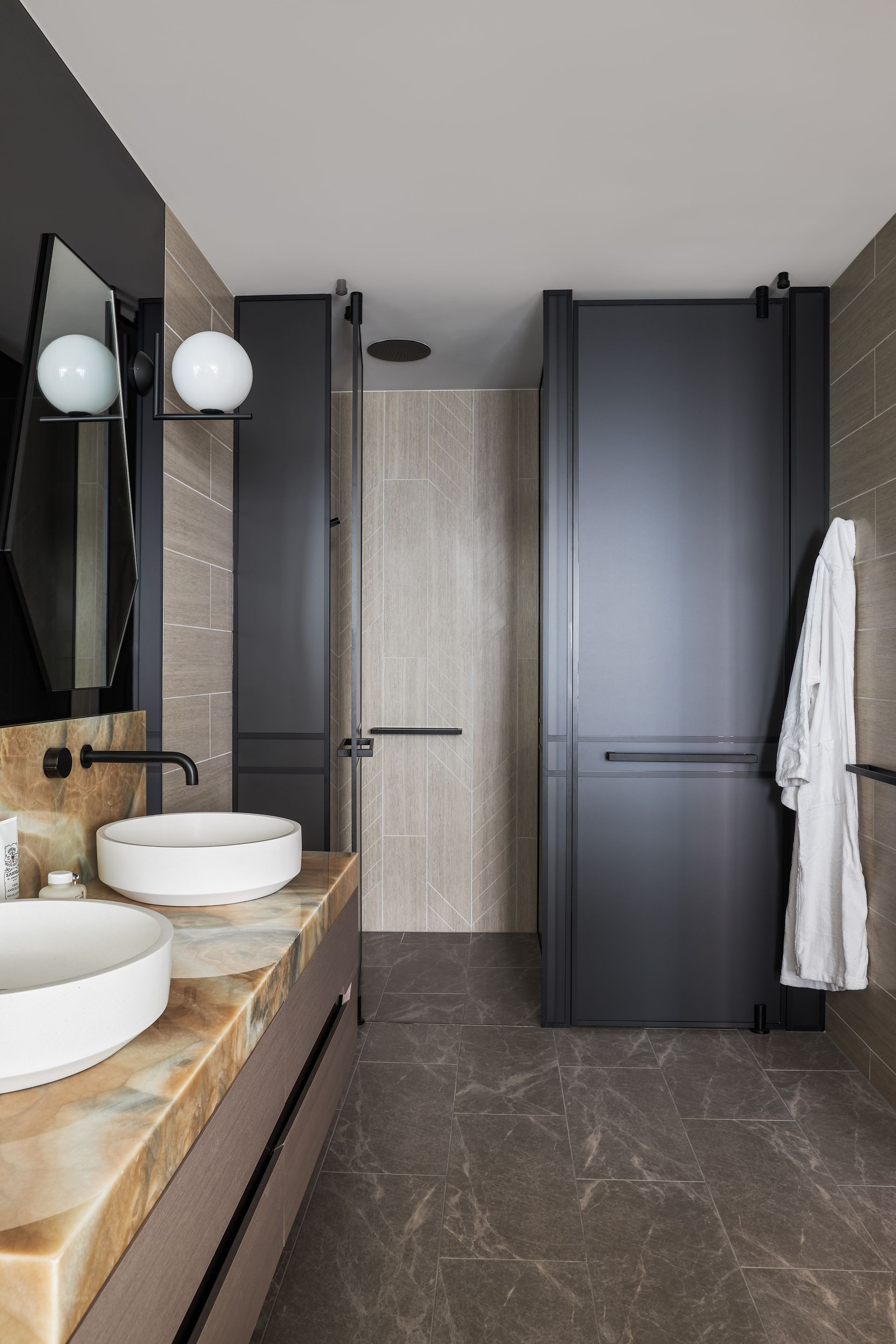 Step out onto the furnished balcony and the scale of the outlook truly hits. Whether it is morning coffee with the sun climbing over the ocean or evening drinks with the city lights reflected in the water below, the terrace earns its place as the heart of the apartment. Inside, the three bedrooms are each well-curated and quietly styled. The master suite features a king bed with an architectural upholstered bedhead, integrated bedside tables, egg-shaped wall sconces, and a luxurious ensuite complete with a freestanding soaking tub, double vessel sinks set on a rich onyx stone vanity, and a walk-in rainfall shower behind a glass-pannelled partition, with a direct view back to the bedroom and beyond. The second bedroom offers a queen bed and the third accommodates two singles, which can be converted to a king on request. The bathrooms throughout maintain the same elevated material palette, dark stone floors, matte black fixtures, and warm timber cabinetry. Two secure undercover car spaces are included, a genuine convenience in this part of Surfers Paradise.