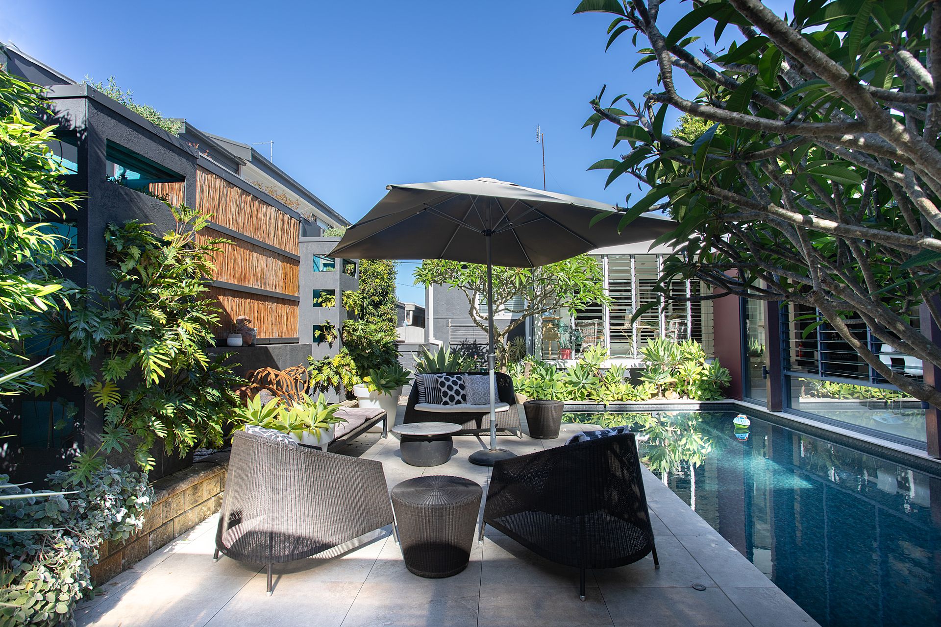 Wander through the home to the welcoming open-plan living and dining area, which flows seamlessly into a modern chef’s kitchen featuring sleek cabinetry, stone bench tops and quality appliances, including a dishwasher. Sliding doors open to a private outdoor sanctuary: an enchanting garden with a sparkling pool, including a private outdoor hot/cold shower in lush surrounds and an undercover alfresco dining area with a BBQ, perfect for long summer lunches or evening entertaining.