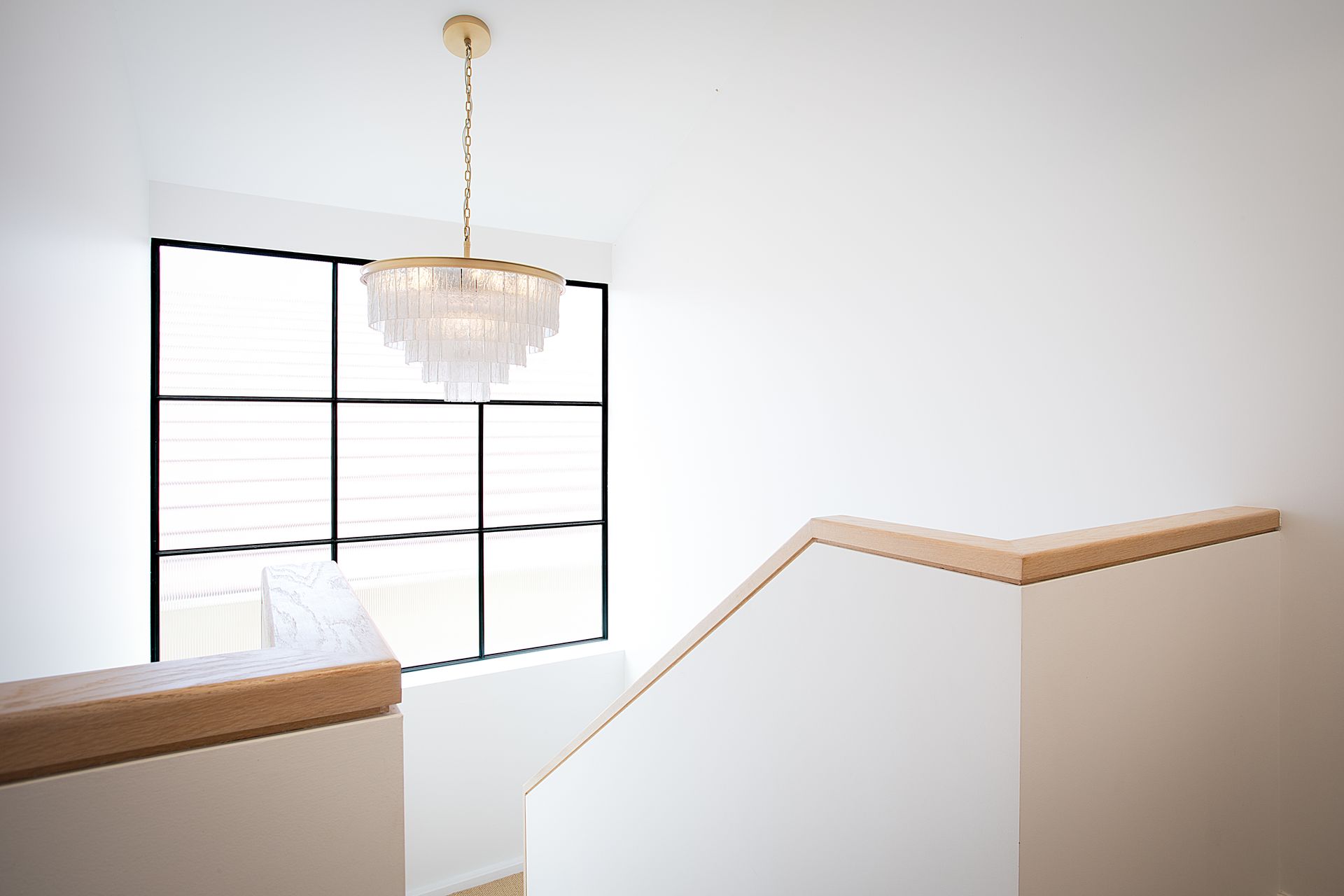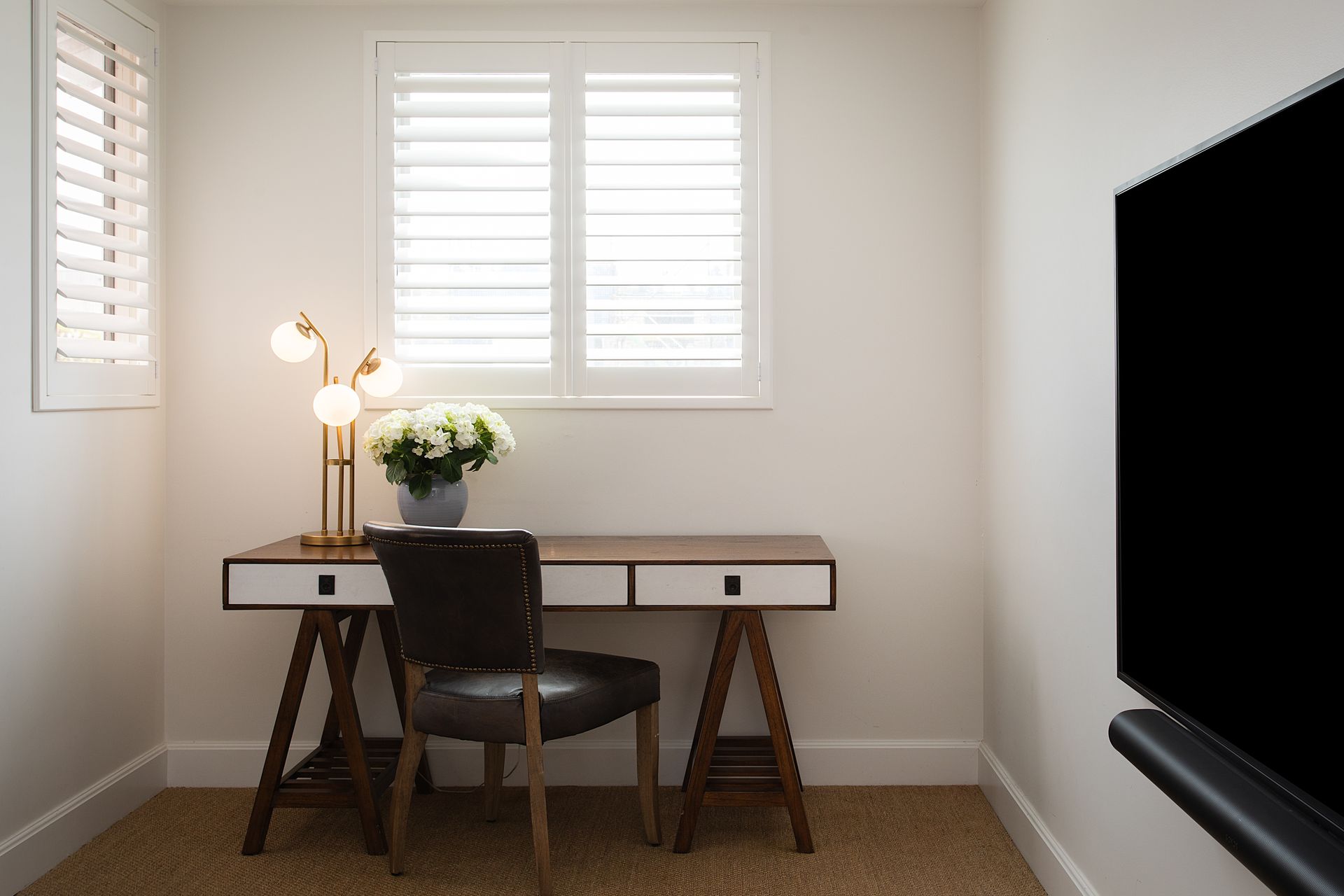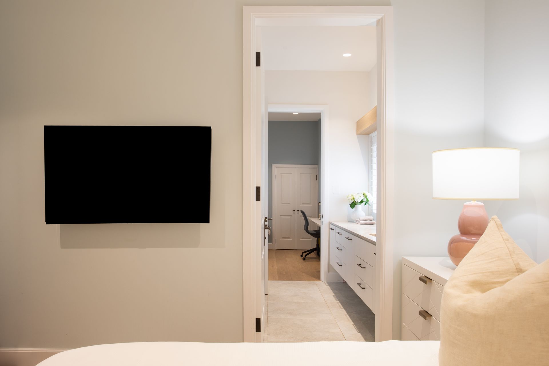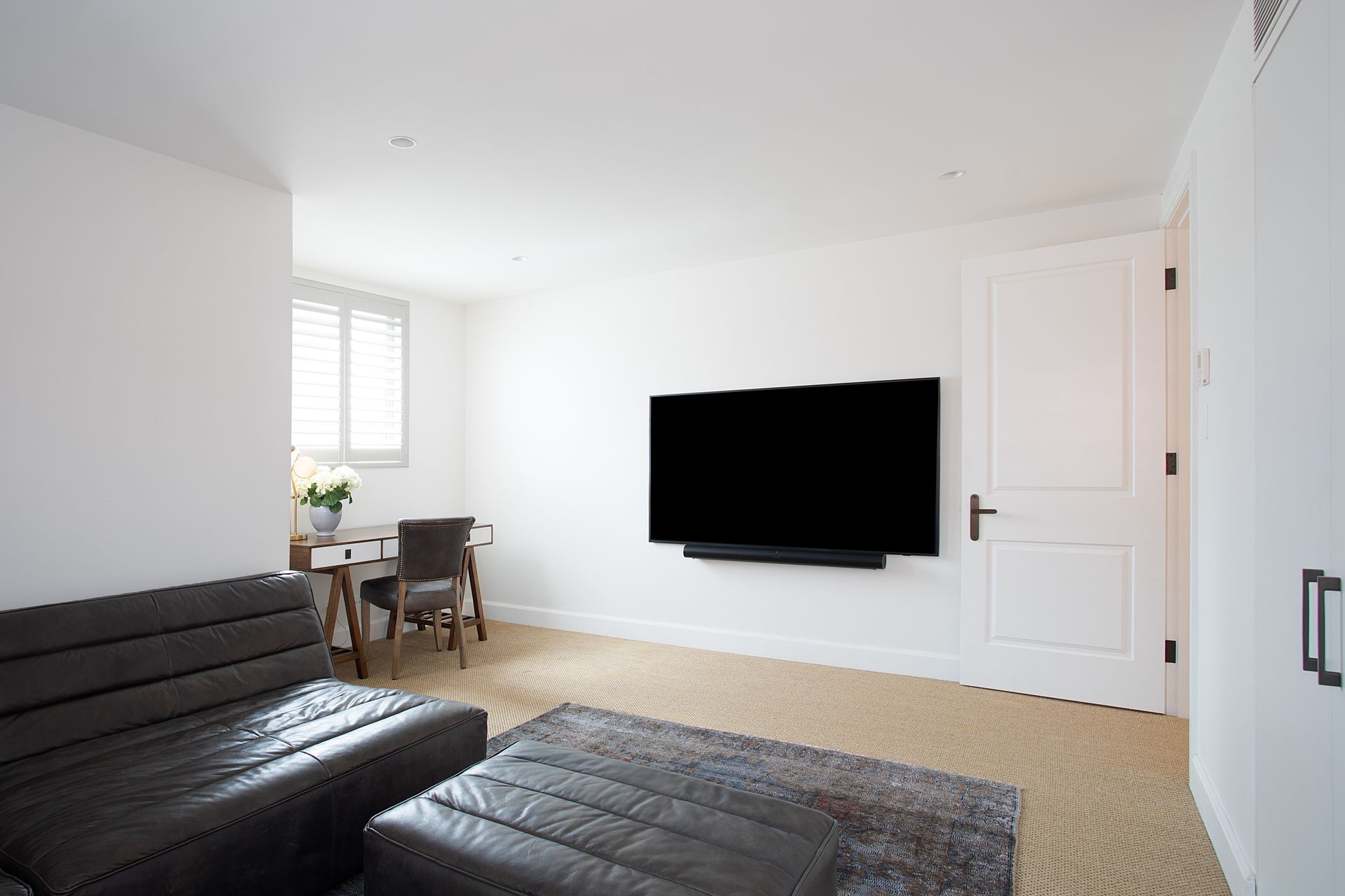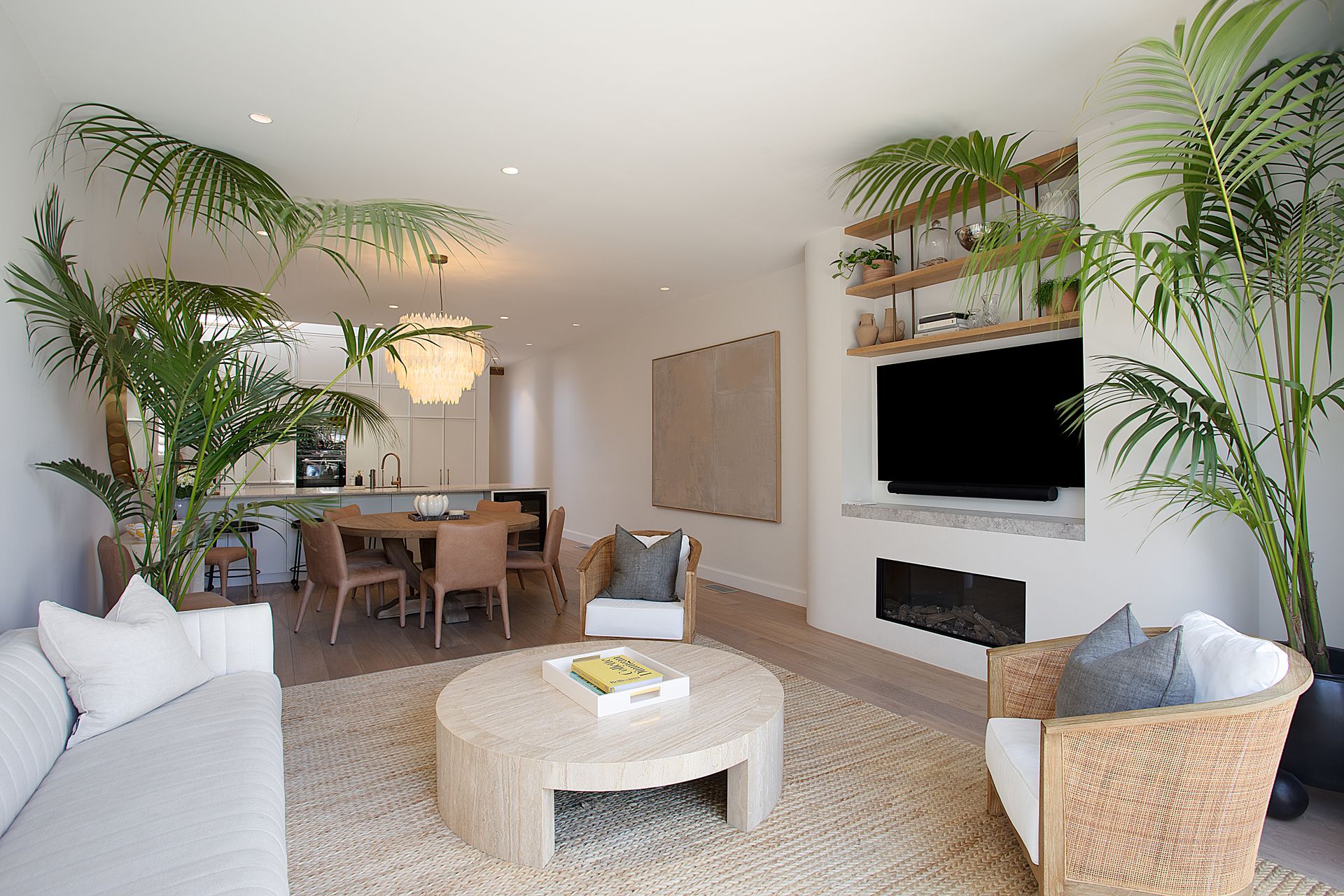 Open plan living flows seamlessly from the gourmet kitchen through to the dining zone, where a statement chandelier crowns the space and lush palms bring tropical warmth. The living area centres around a feature fireplace with built-in media wall and timber shelving, opening directly to a private garden courtyard, perfect for long lunches or evening drinks under softly lit greenery. A dedicated media room on the first level offers a quiet retreat with sofa and desk for remote work or evening movie sessions. The internal laundry features a premium washer, dryer, and dedicated storage. Central heating and cooling maintain perfect temperatures year round.