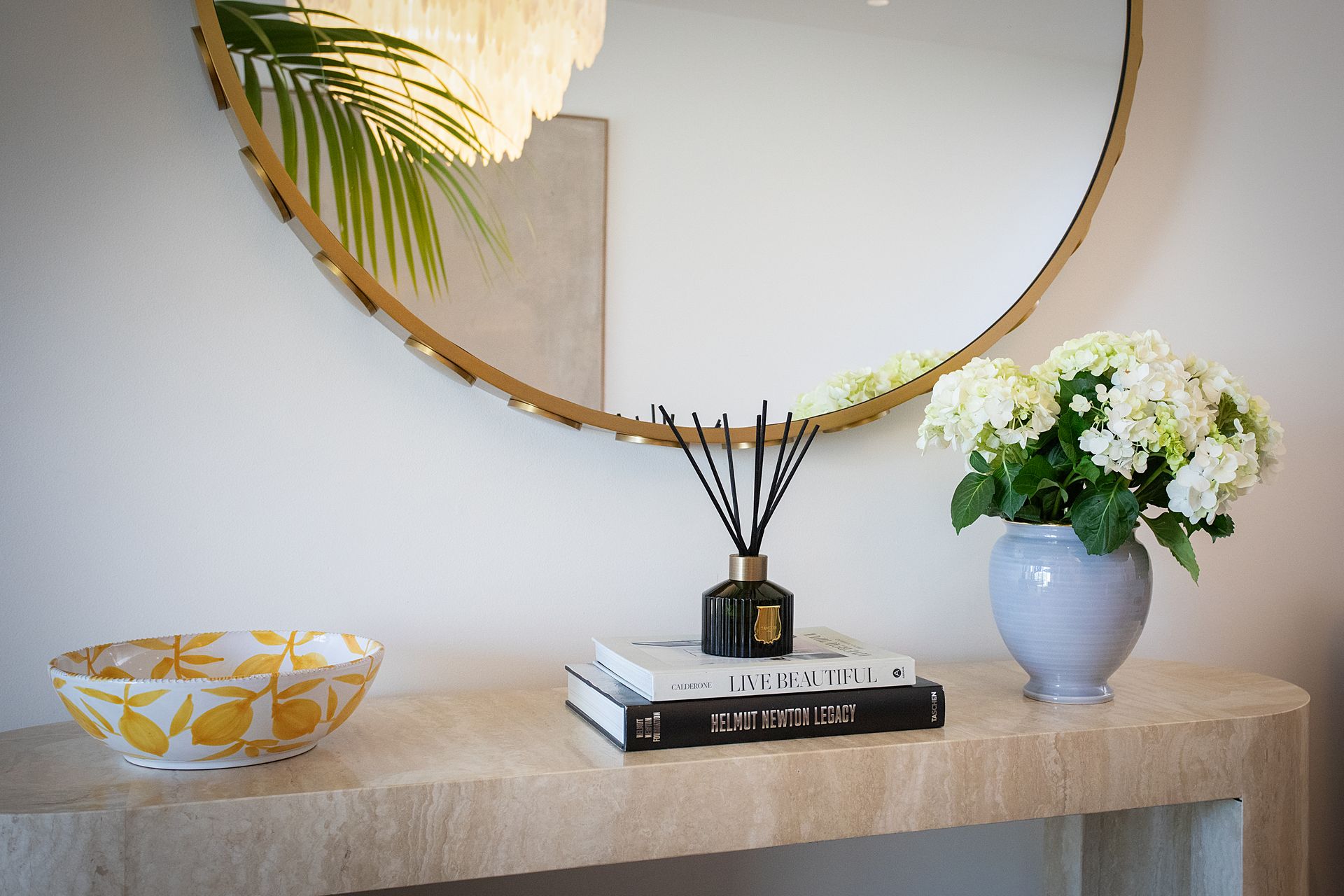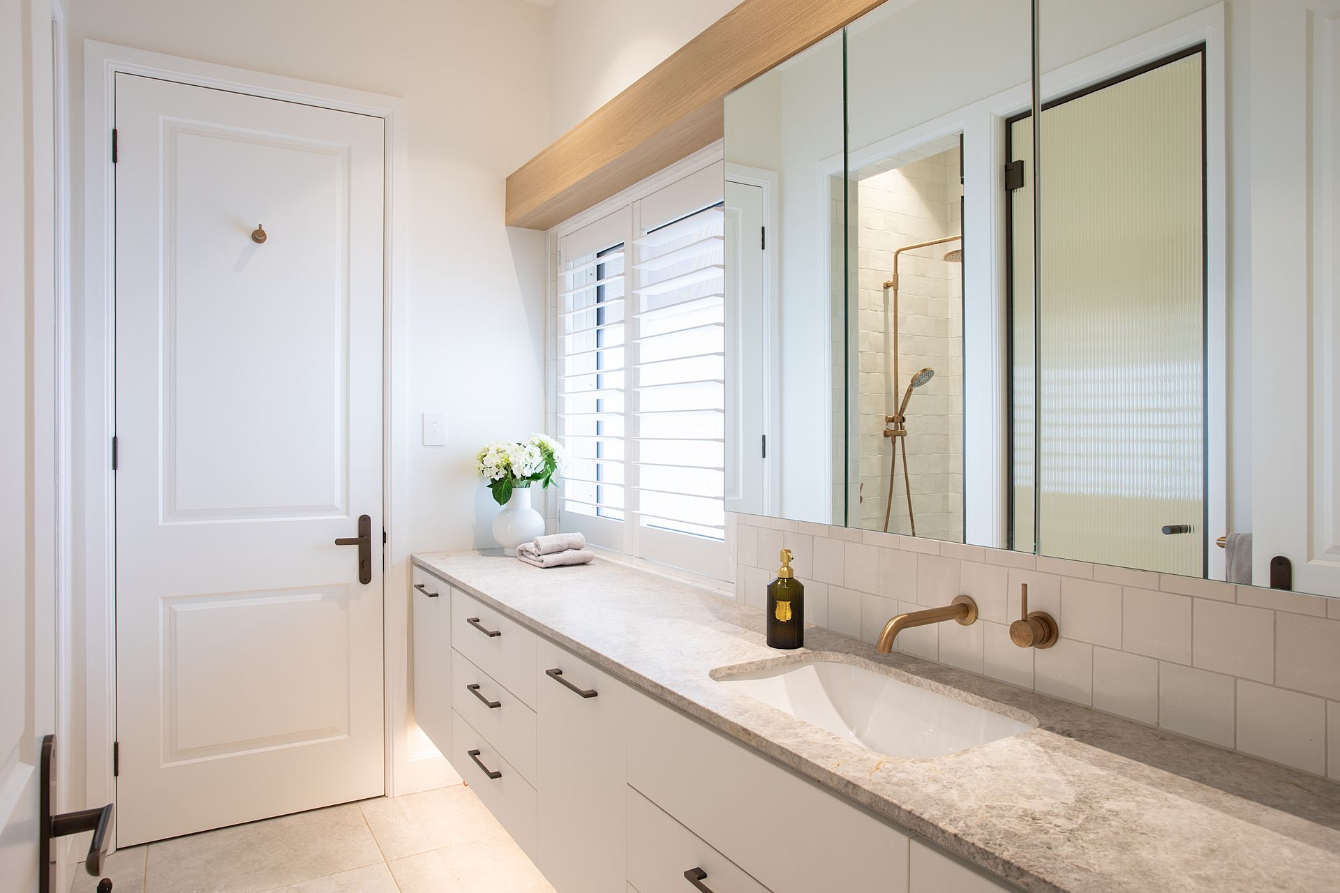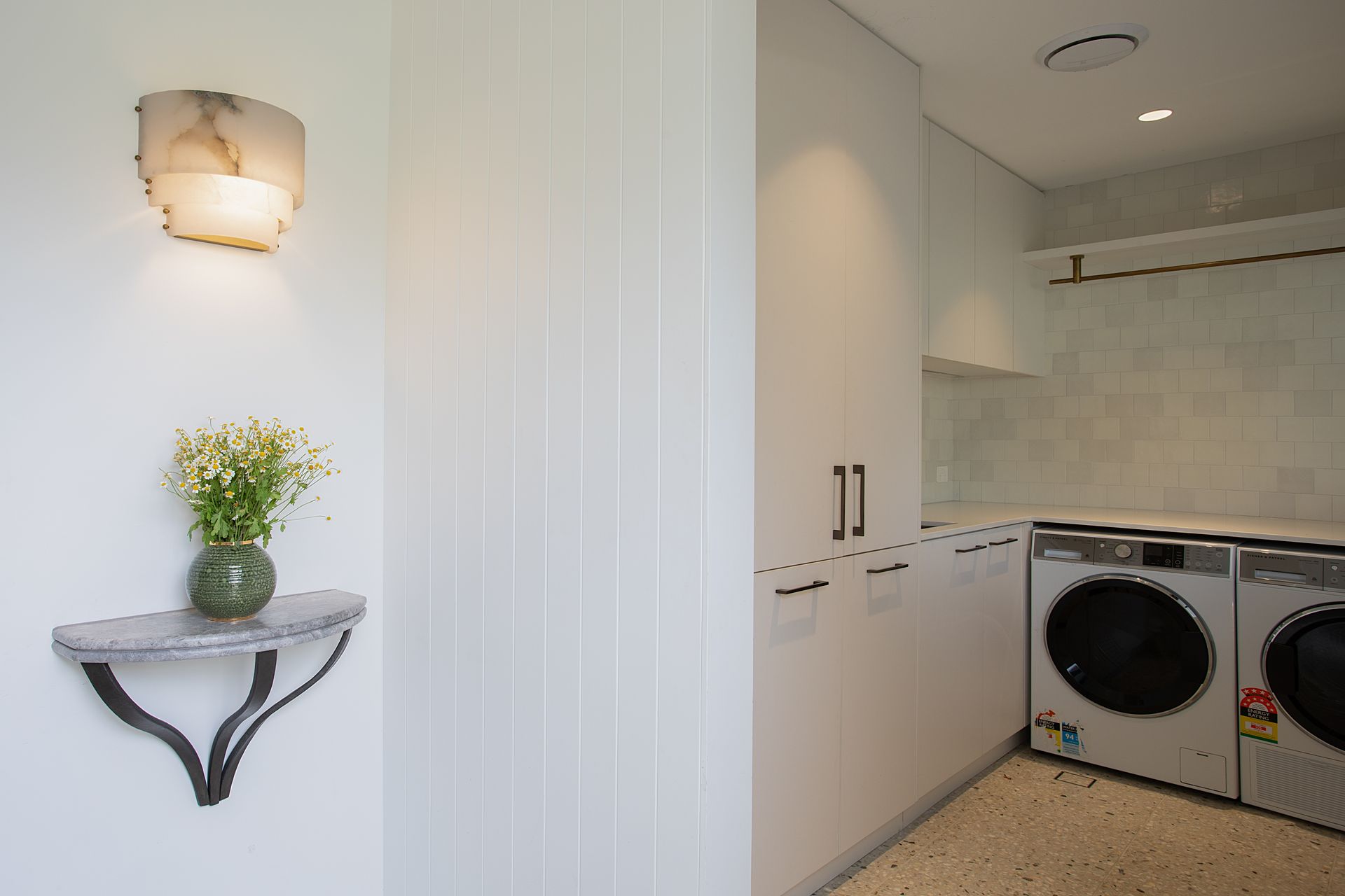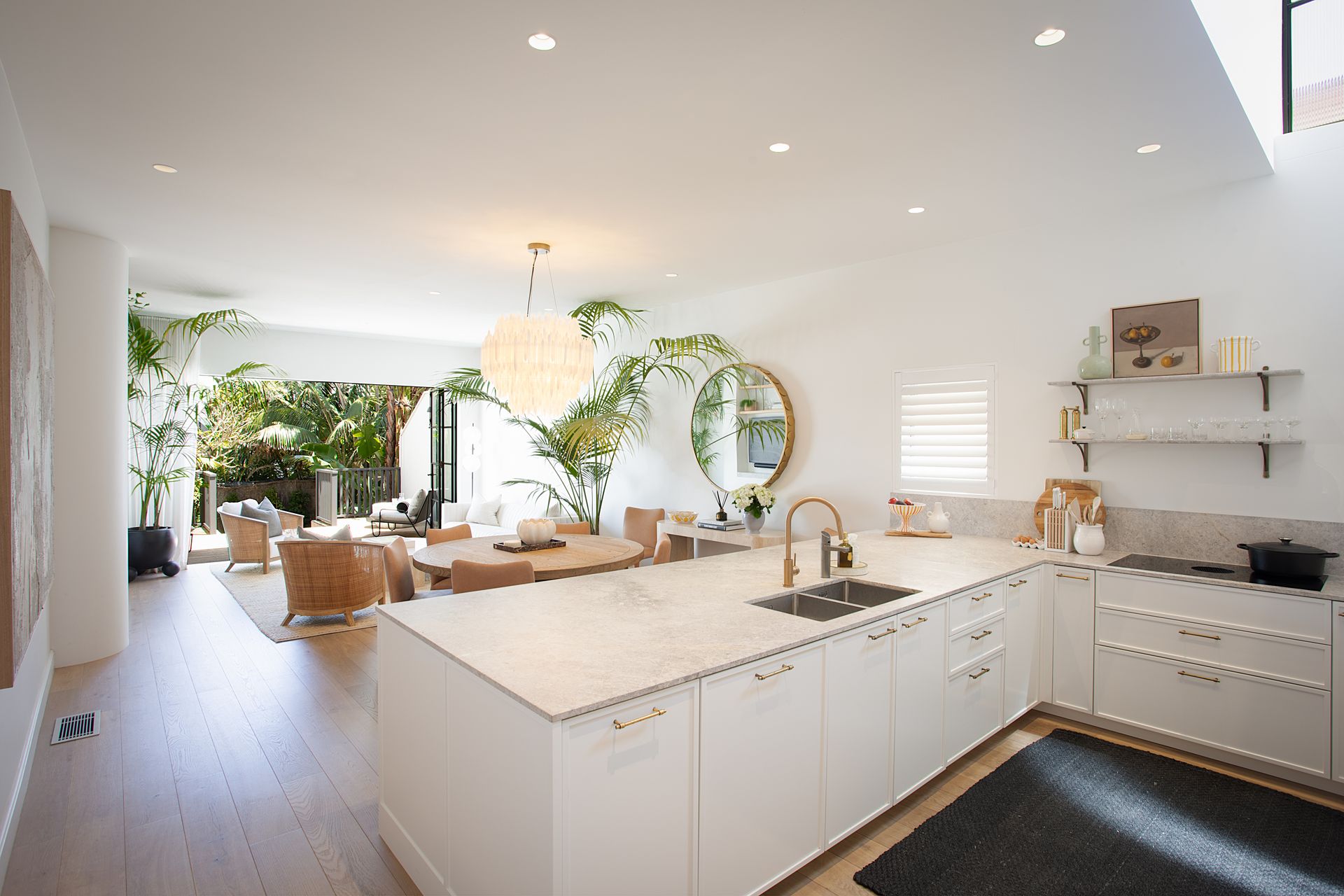 The kitchen delivers refined luxury with its raw marble waterfall benchtop, bespoke cabinetry, and gold fixtures. A Hydro Zip tap dispenses sparkling, still, and hot water on demand. Premium appliances include combi steam and pyro-clean oven, induction cooktop with downdraft ventilation, and two dishwashers. A round timber dining table seats eight beneath sculptural pendant lighting, while the kitchen flows through to the living area to the outdoor entertaining through bifold doors.