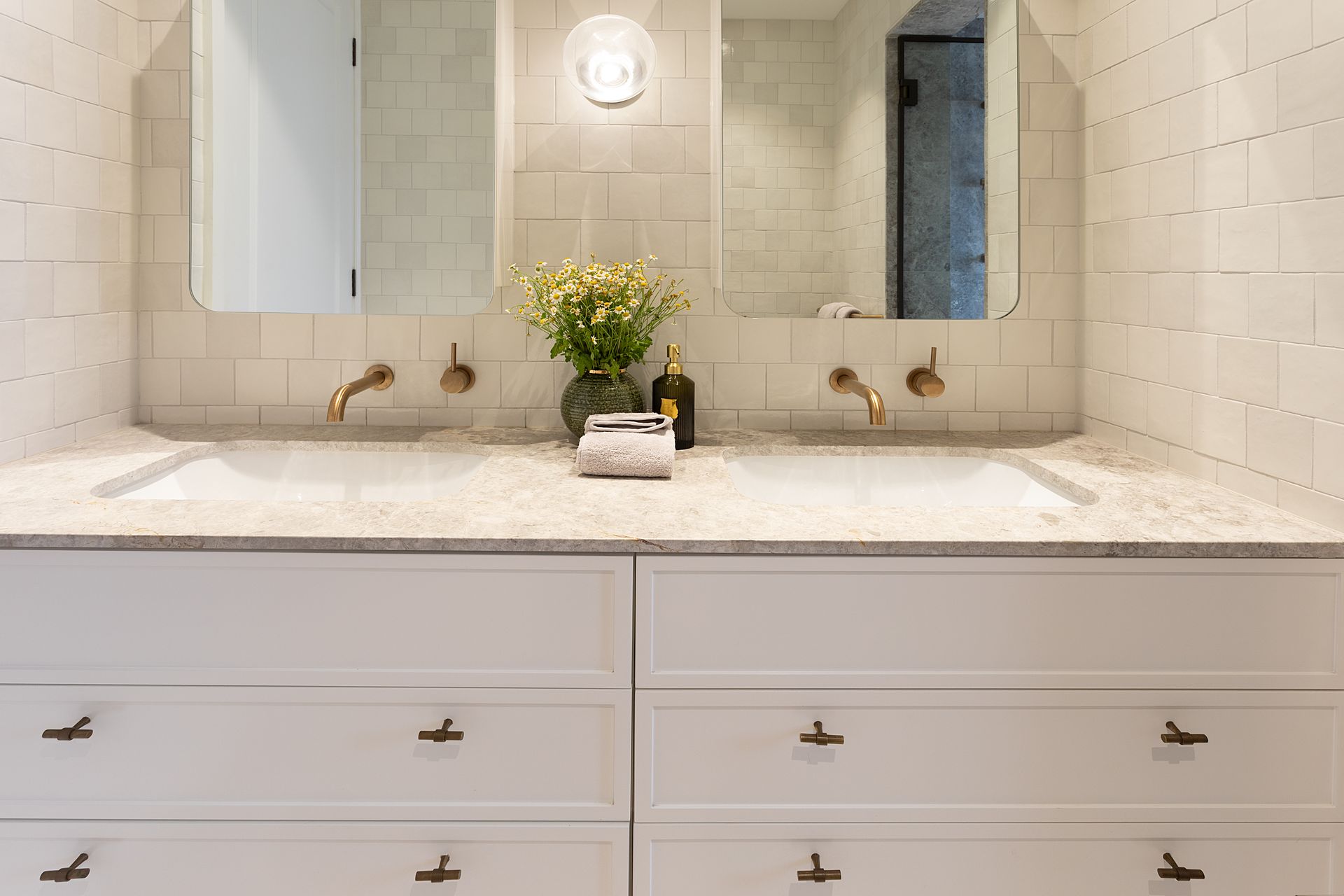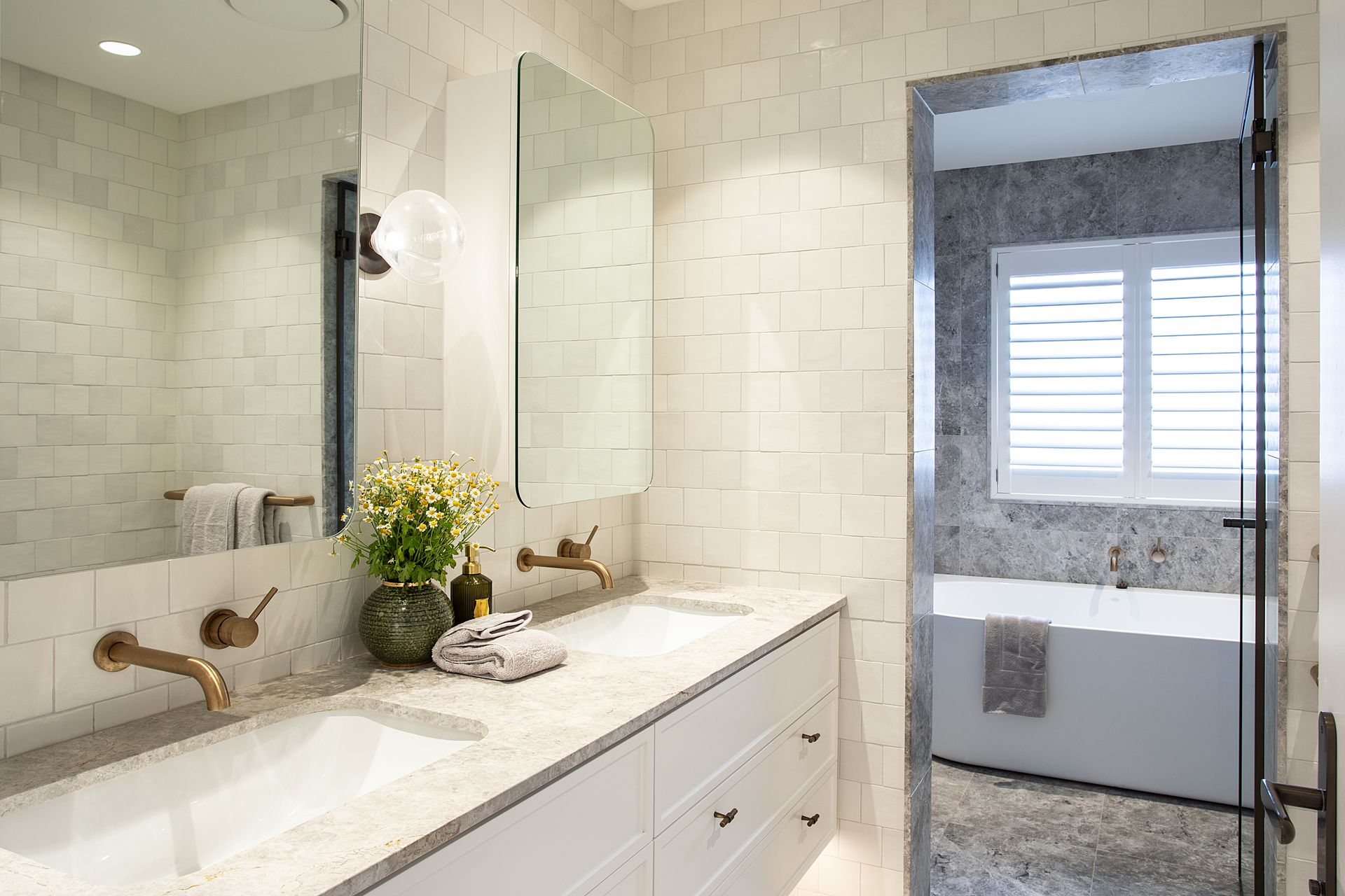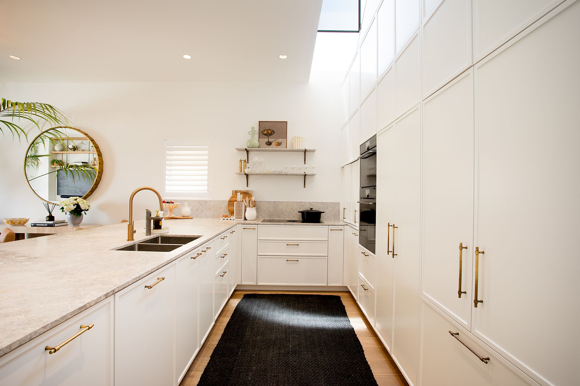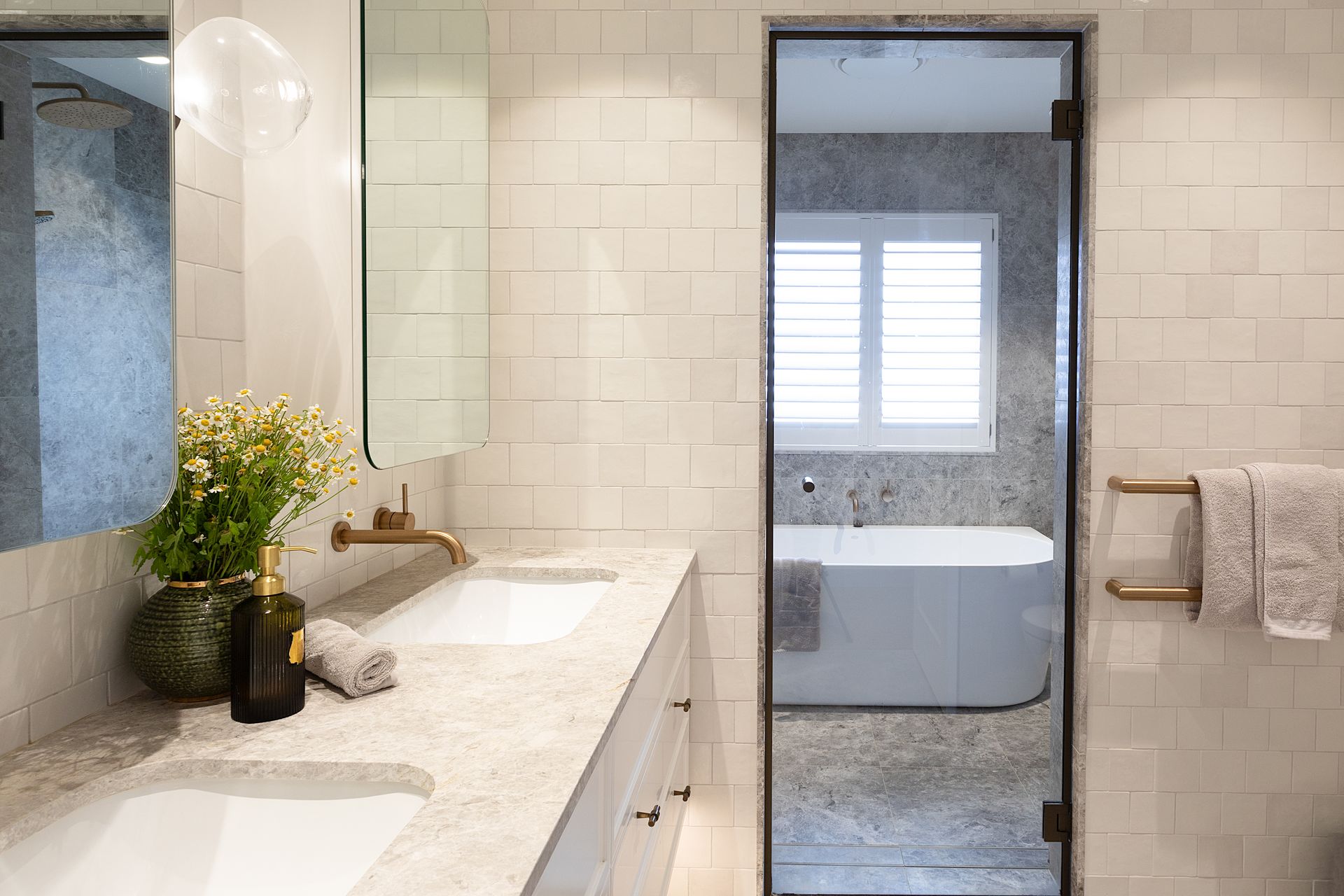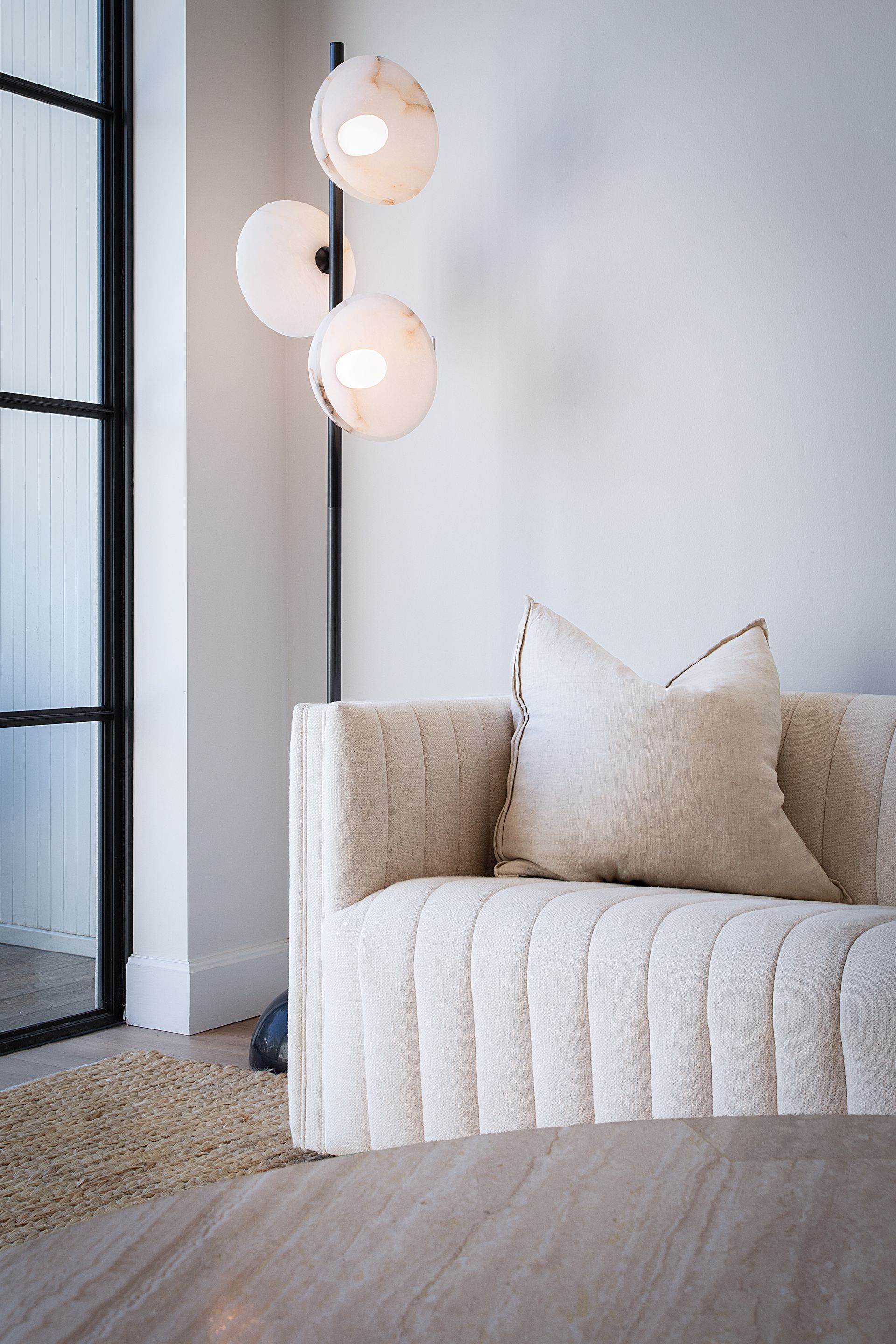 The kitchen delivers refined luxury with its raw marble waterfall benchtop, bespoke cabinetry, and gold fixtures. A Hydro Zip tap dispenses sparkling, still, and hot water on demand. Premium appliances include combi steam and pyro-clean oven, induction cooktop with downdraft ventilation, and two dishwashers. A round timber dining table seats eight beneath sculptural pendant lighting, while the kitchen flows through to the living area to the outdoor entertaining through bifold doors.