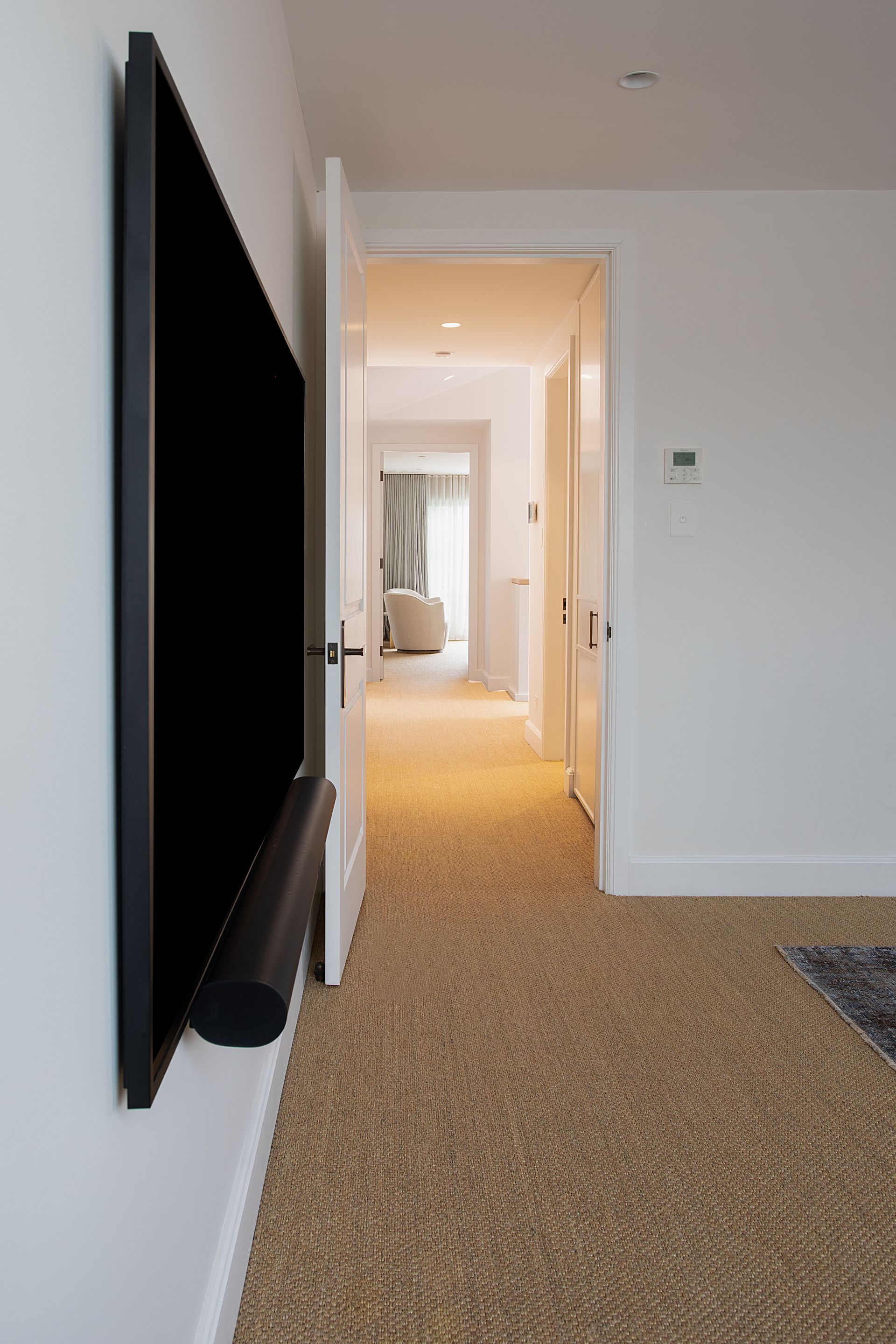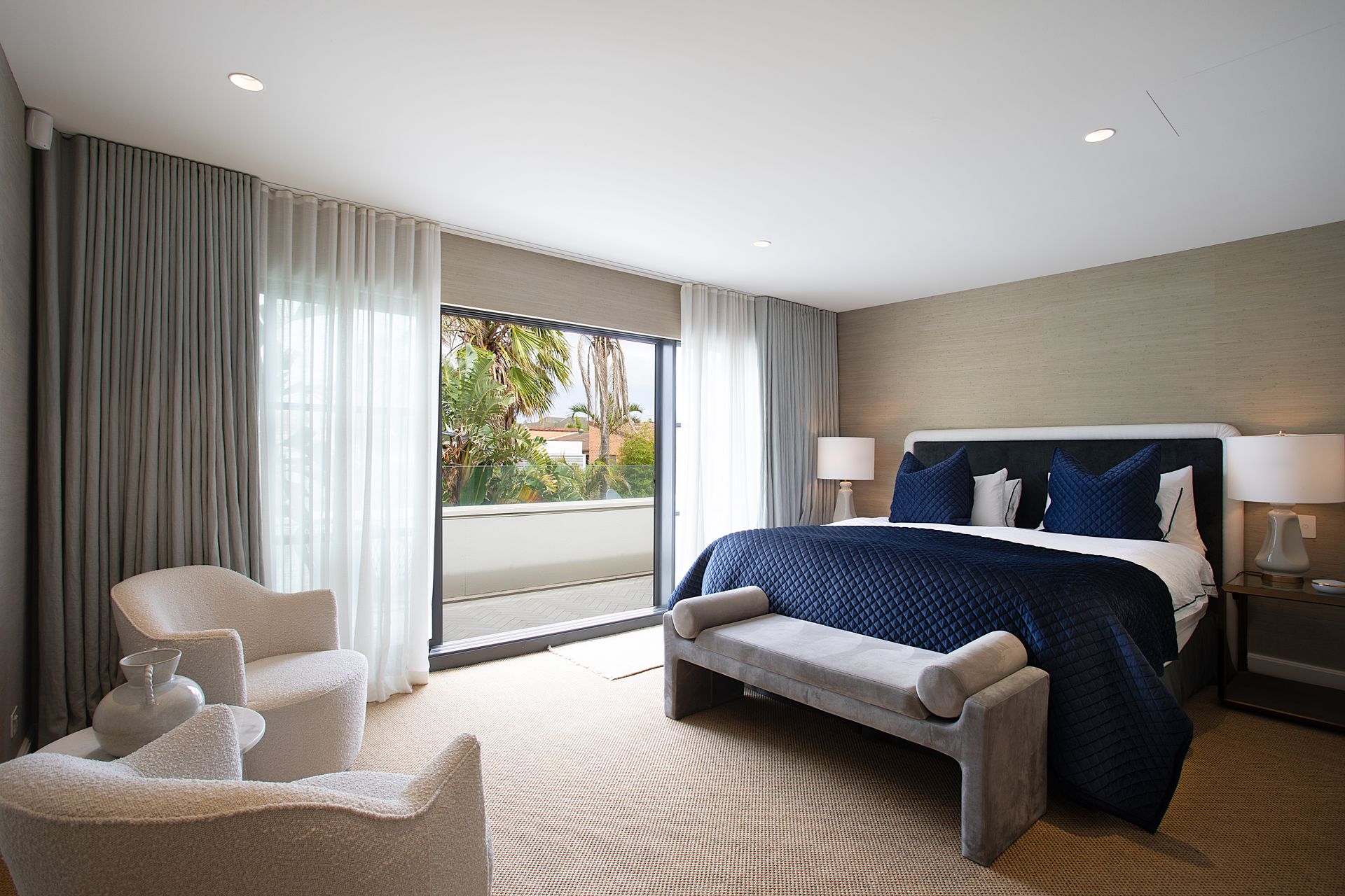 Two ground floor bedrooms share a jack and jill ensuite: one queen, one king single. Upstairs, the master suite commands the best position with king bed, plush carpets, walk-in robe, and a private balcony capturing Bondi Beach glimpses. Navy accent bedding against sea grass wallpaper walls creates hotel resort-level sophistication. Built-in wardrobes complete each bedroom.