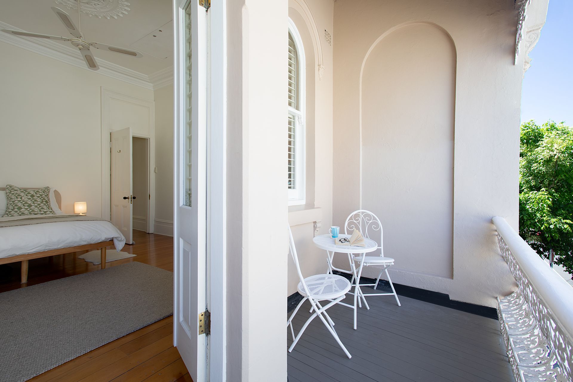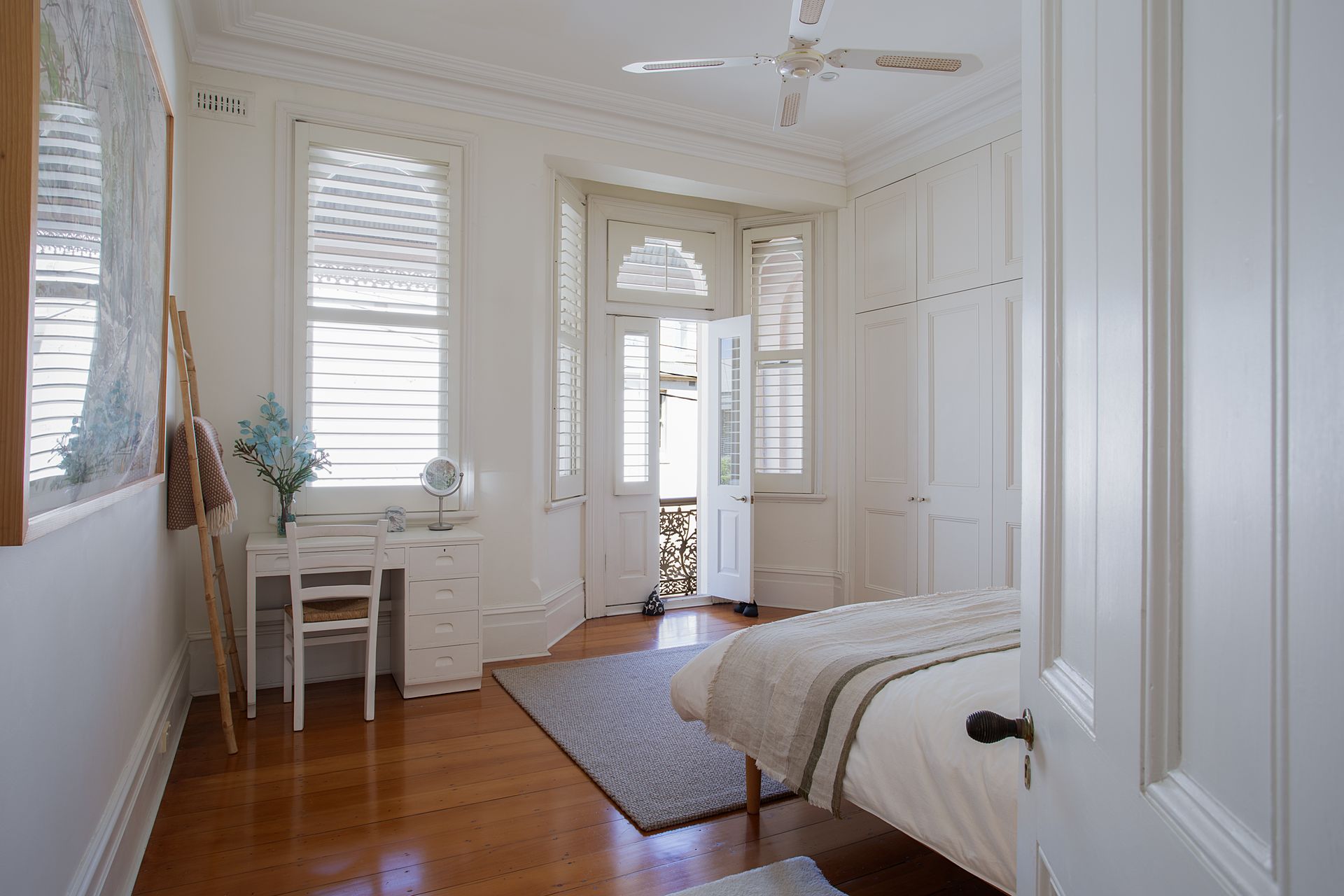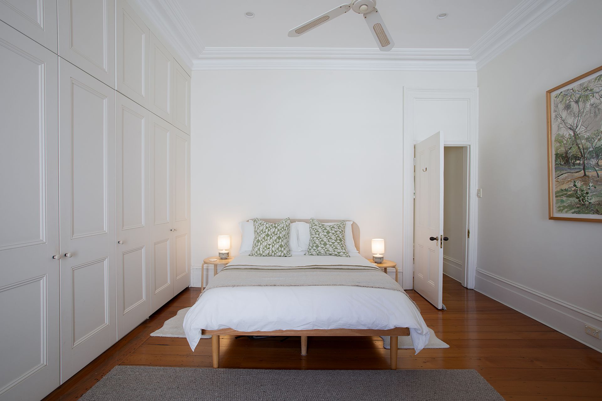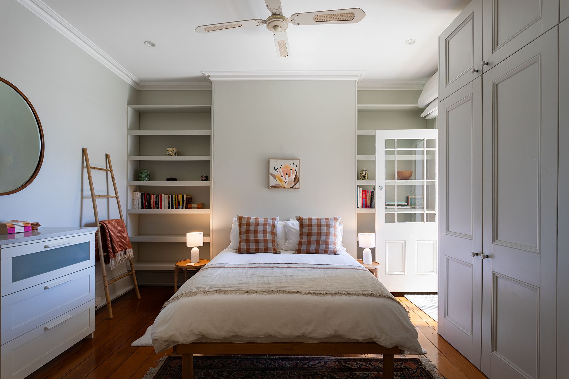 Three bedrooms occupy the upper level, each with ceiling fans and blinds for comfortable rest. The main bedroom features a queen bed with built-in storage opening to a juliet balcony, while the second and third bedrooms each offer double beds in bright, peaceful spaces. Period details including high ceilings and timber floors run throughout. The elevated position ensures quiet nights in this leafy street, the second bedroom also leads to a private balcony, perfect for reading in the afternoon sun.