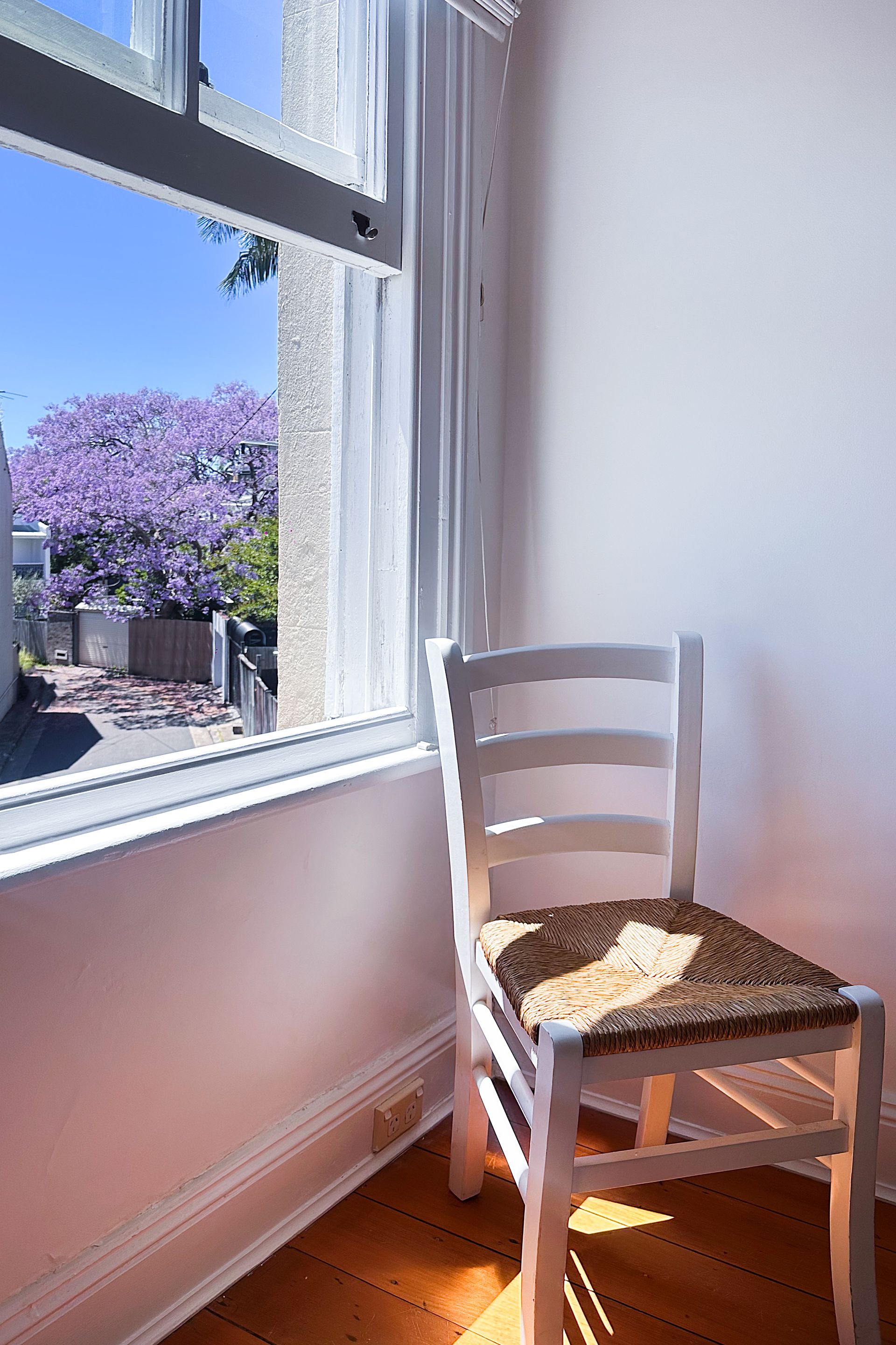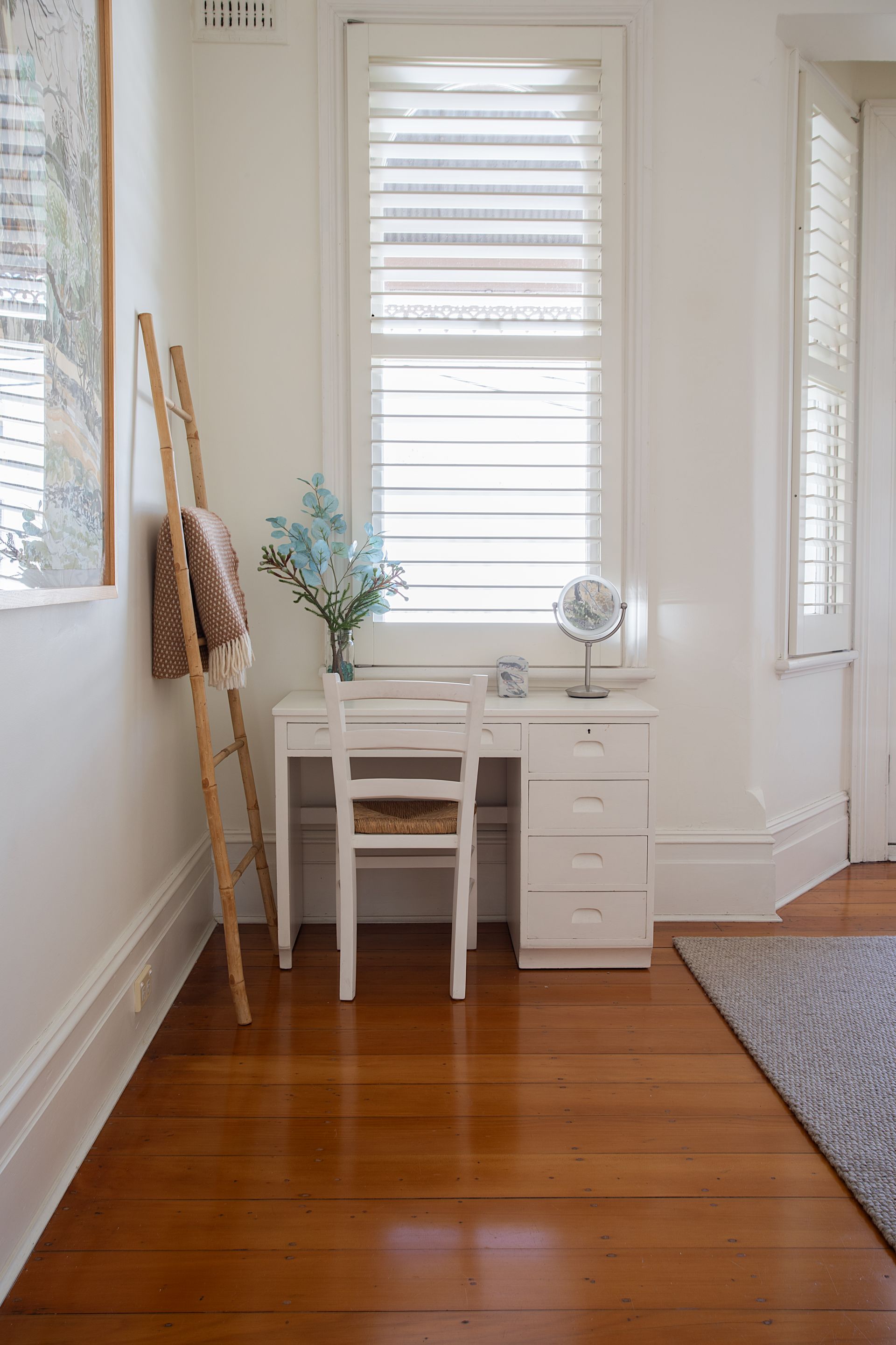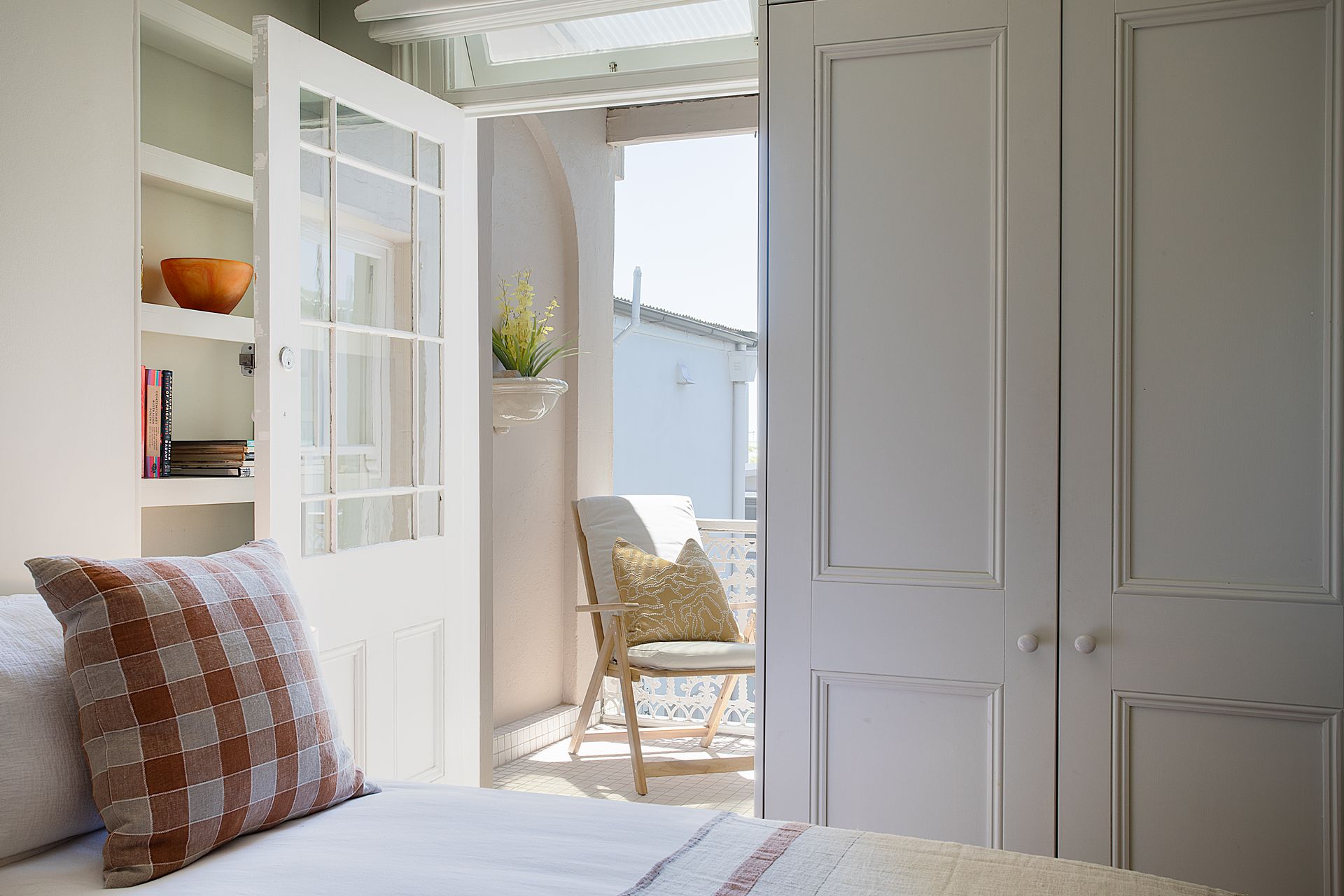 Three bedrooms occupy the upper level, each with ceiling fans and blinds for comfortable rest. The main bedroom features a queen bed with built-in storage opening to a juliet balcony, while the second and third bedrooms each offer double beds in bright, peaceful spaces. Period details including high ceilings and timber floors run throughout. The elevated position ensures quiet nights in this leafy street, the second bedroom also leads to a private balcony, perfect for reading in the afternoon sun.
