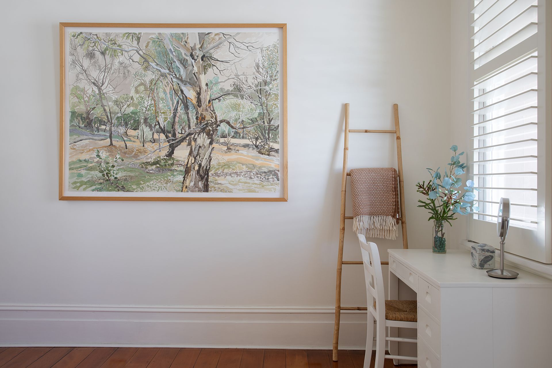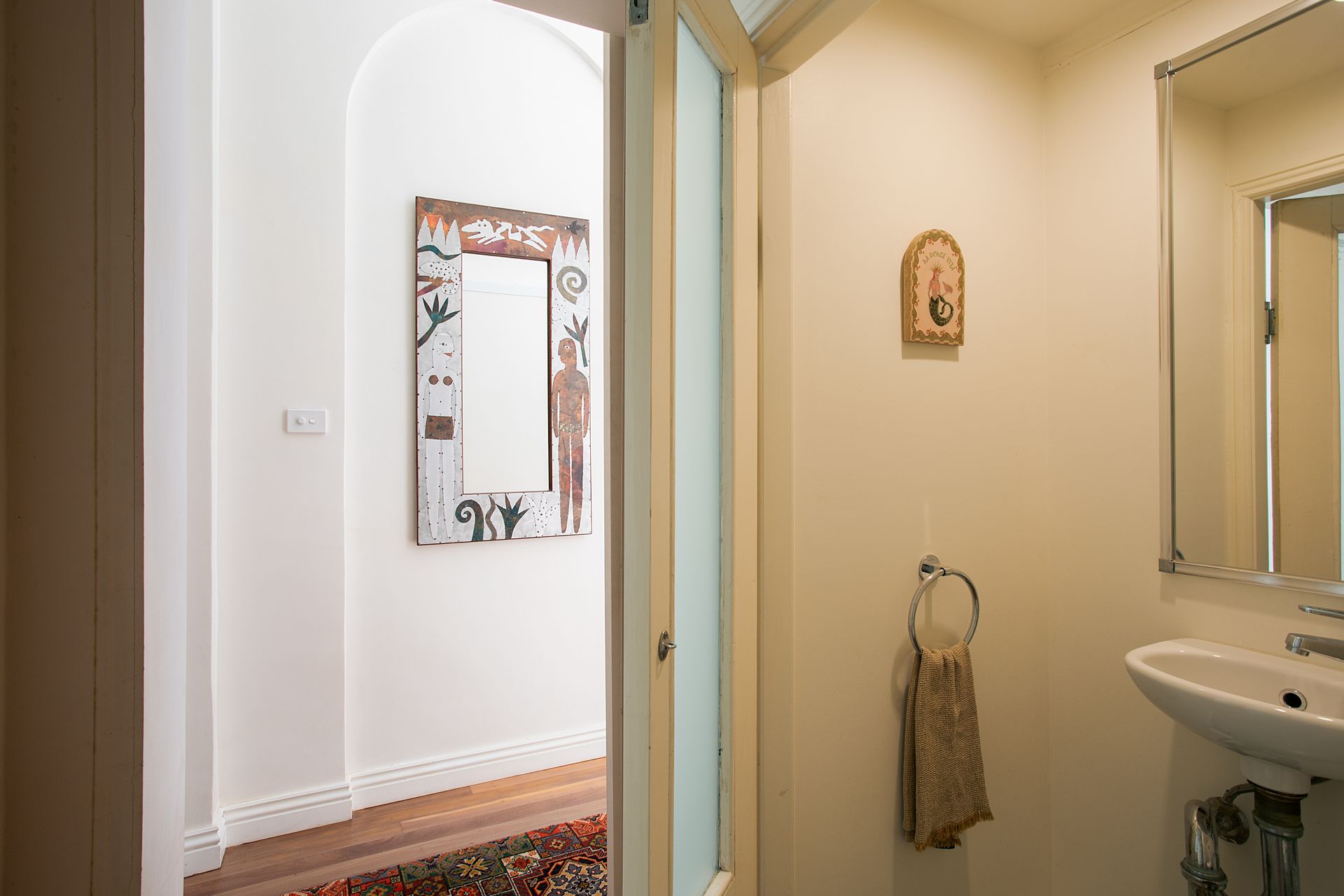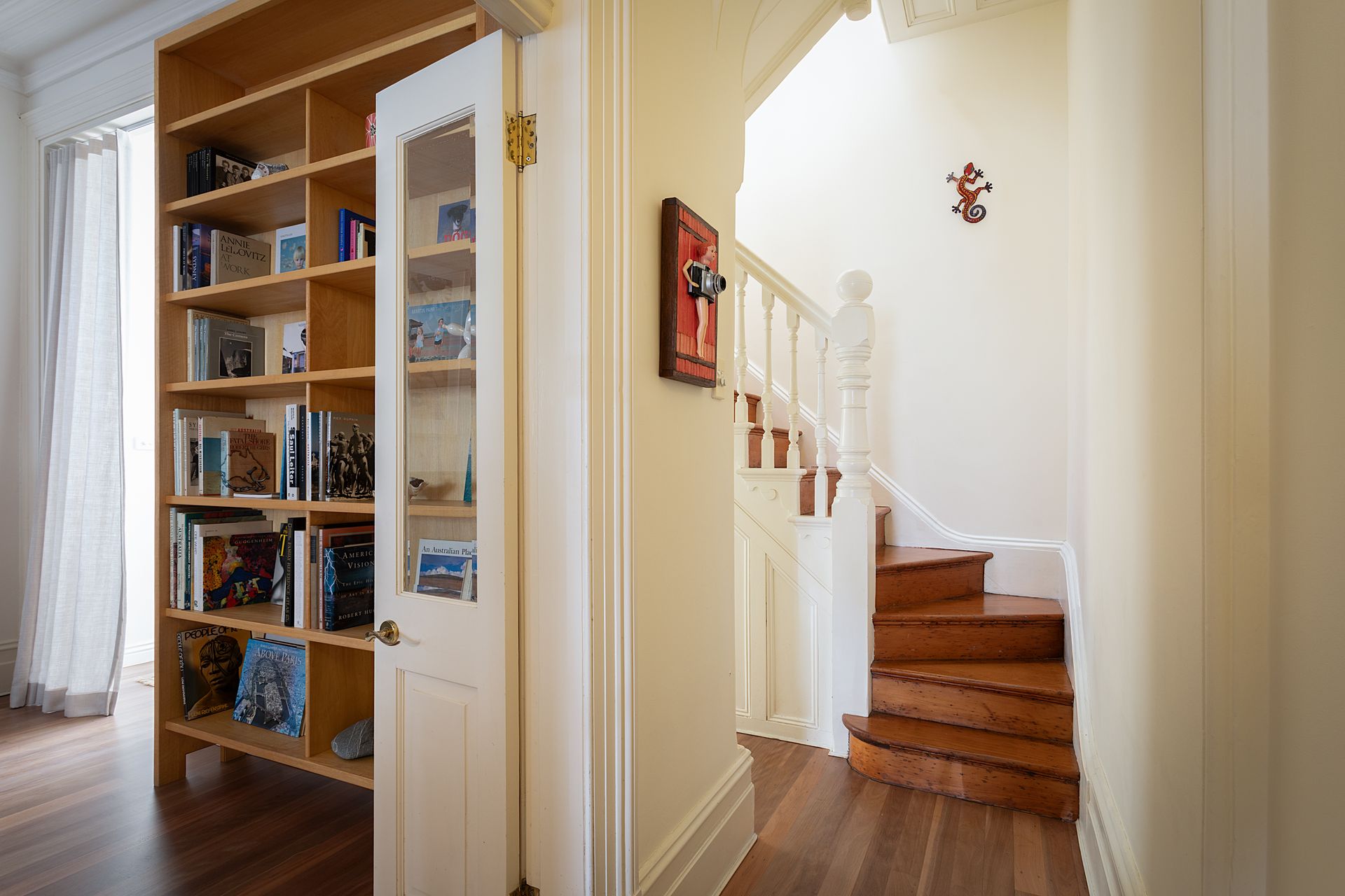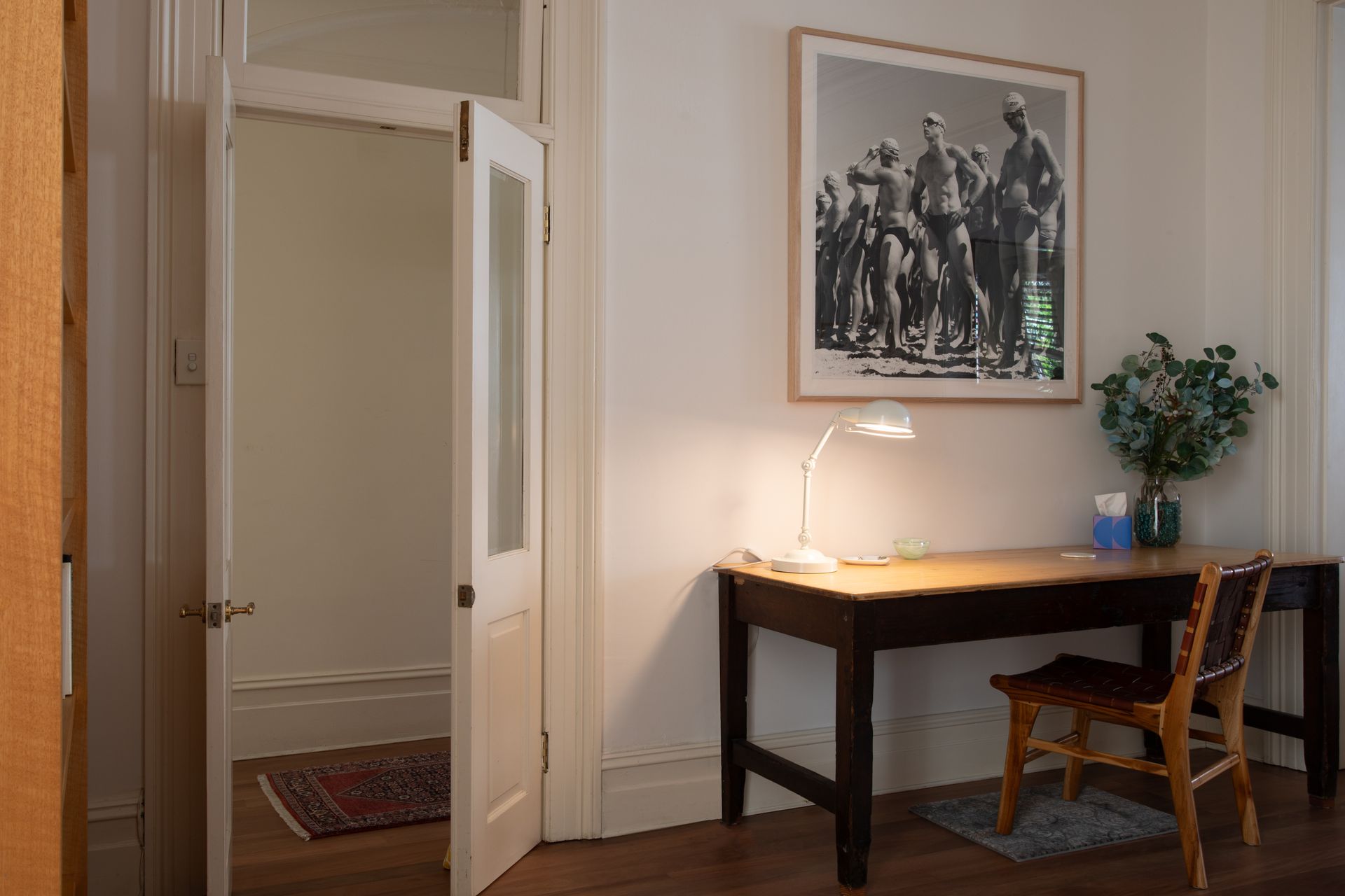 Three bedrooms occupy the upper level, each with ceiling fans and blinds for comfortable rest. The main bedroom features a queen bed with built-in storage opening to a juliet balcony, while the second and third bedrooms each offer double beds in bright, peaceful spaces. Period details including high ceilings and timber floors run throughout. The elevated position ensures quiet nights in this leafy street, the second bedroom also leads to a private balcony, perfect for reading in the afternoon sun.