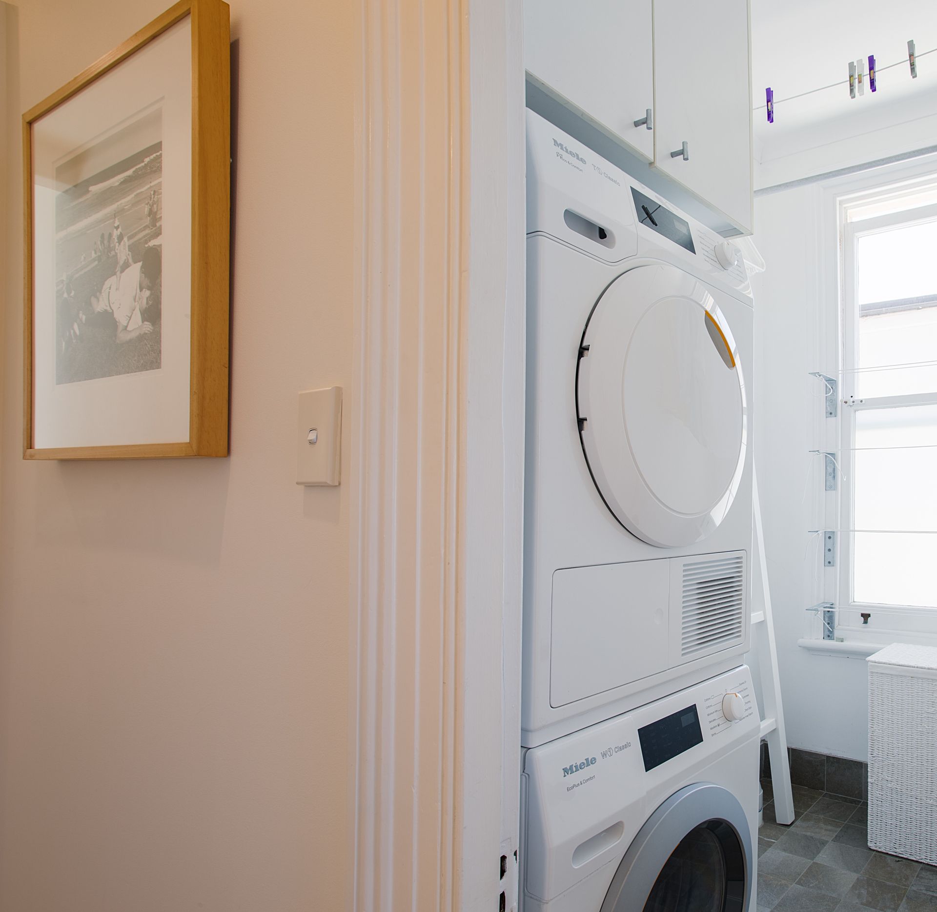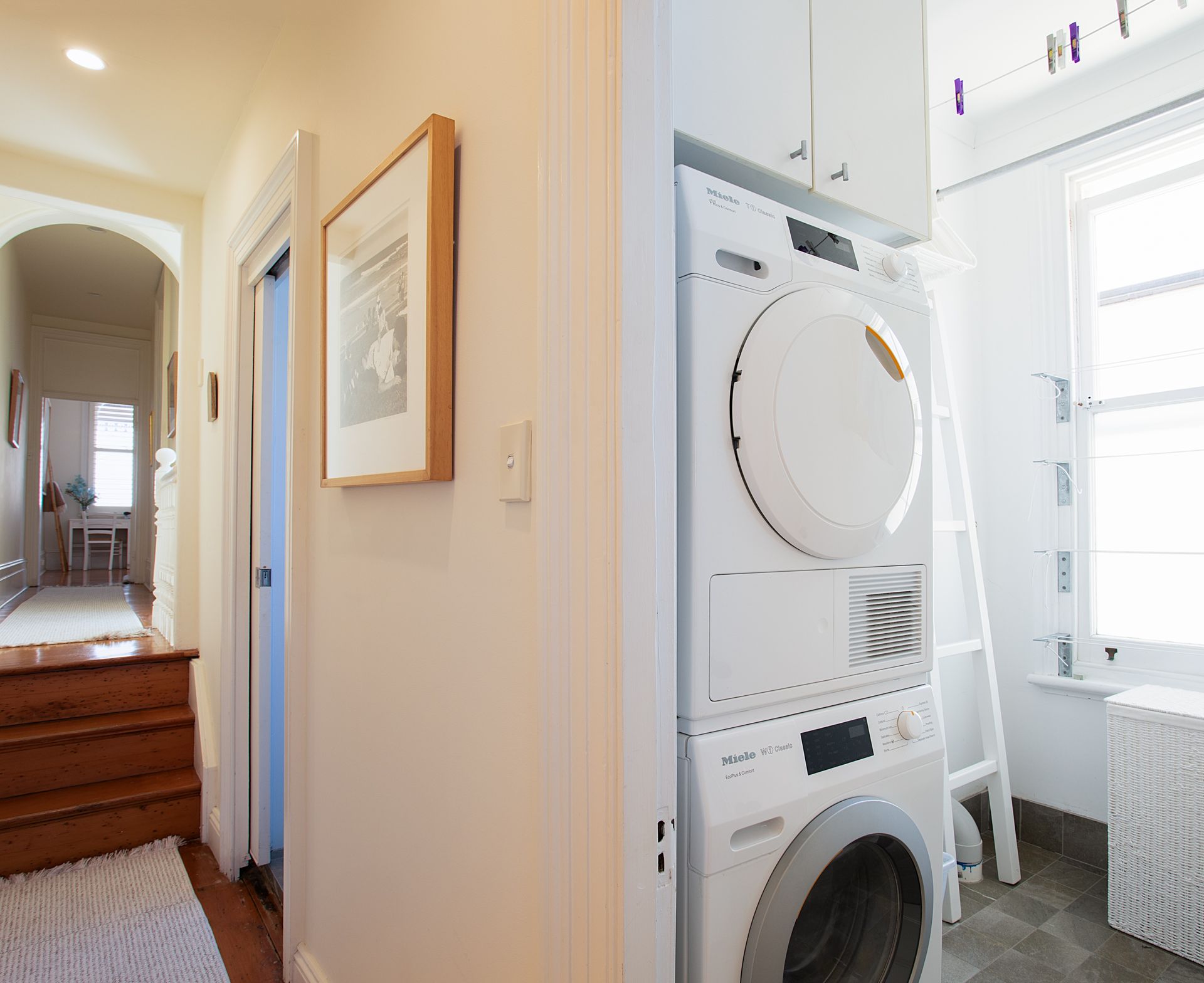 The full bathroom upstairs serves the bedrooms with bath, shower, toilet and vanity. Downstairs, a separate toilet adds convenience for guests and daily living. A washing machine and dryer are discreetly located on the first level to handle laundry throughout your stay.