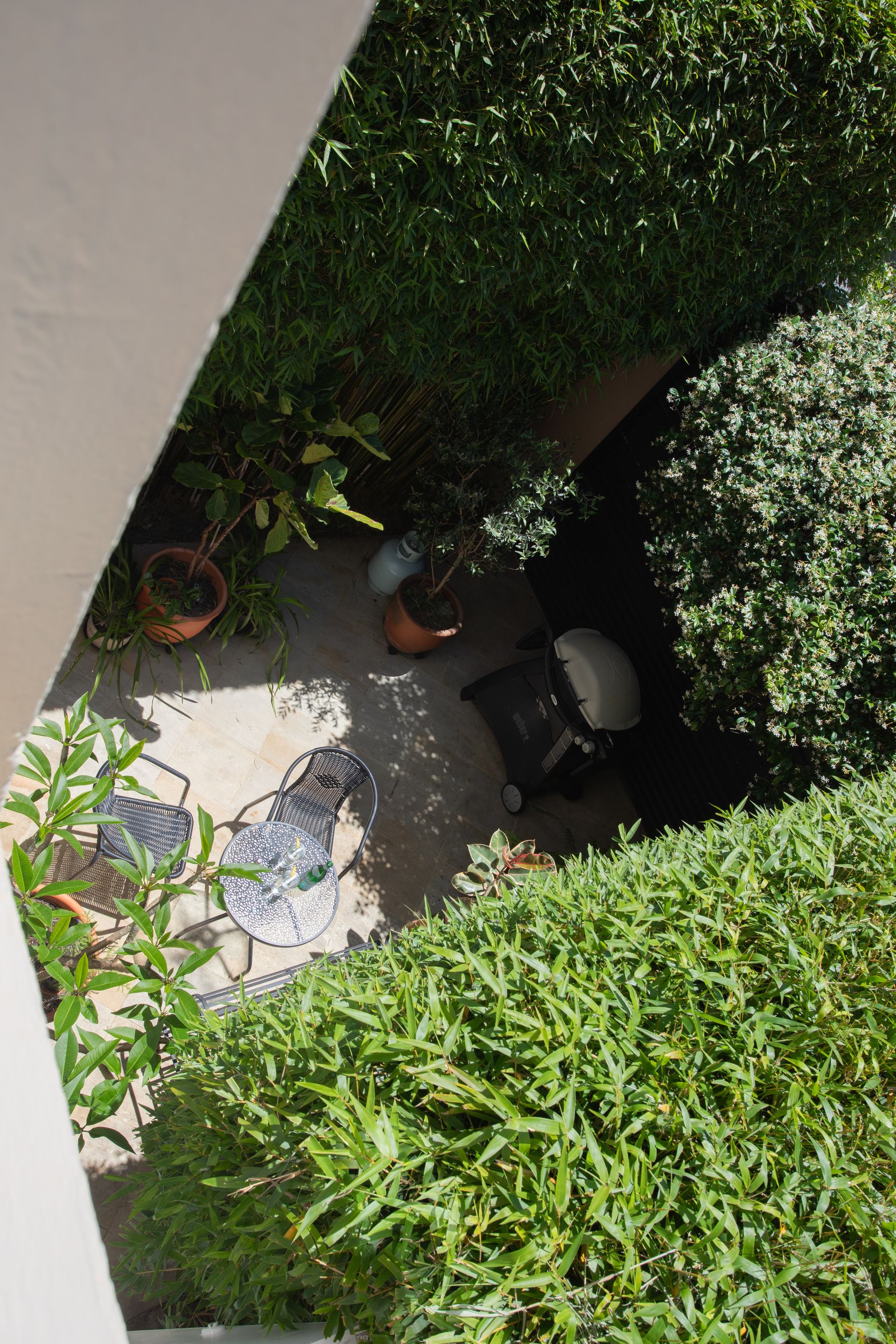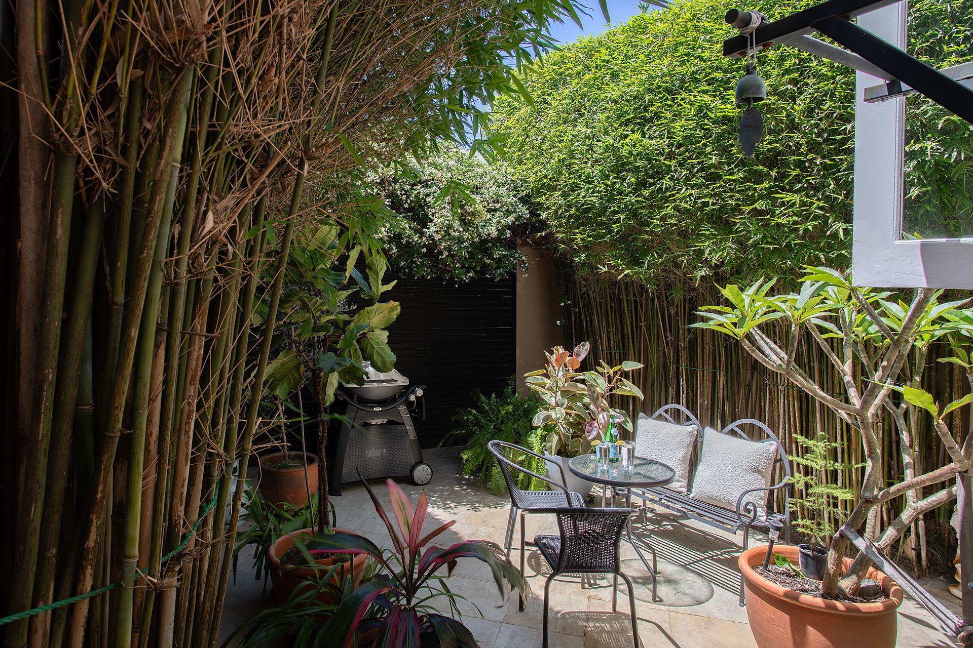 The kitchen sits at the heart of the home, opening to the dining area and courtyard where meals flow naturally between indoor and outdoor spaces. White cabinetry and marble surfaces provide clean work areas, while modern appliances including gas oven, dishwasher, microwave and full size refrigerator cover all cooking needs. The dining space frames views of the bamboo lined courtyard, creating a serene backdrop for meals. Step outside to the BBQ area surrounded by tropical planting for alfresco entertaining.