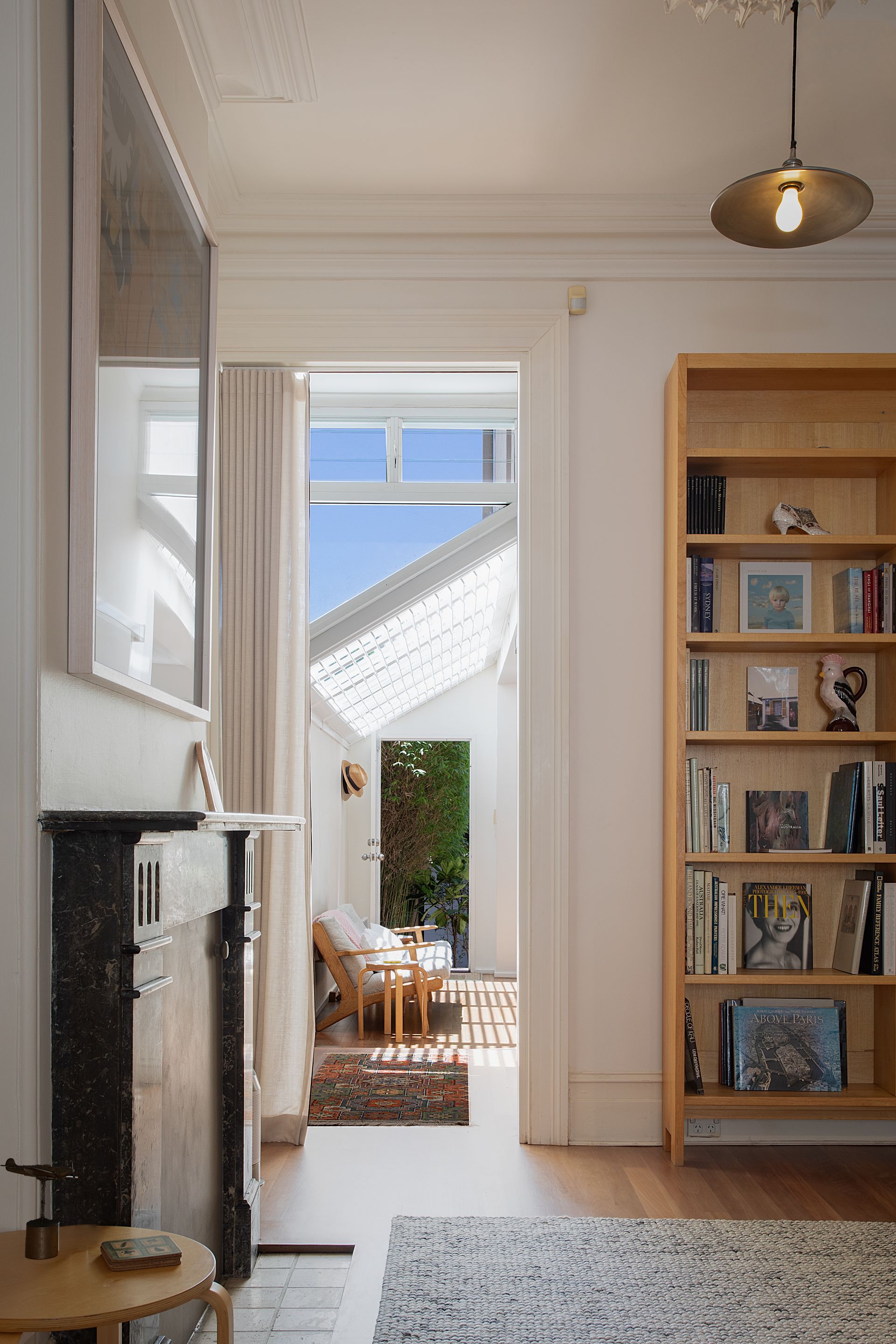 The front living room retains its Victorian character with original fireplace and period details, flowing through to a second living space that connects to the kitchen and courtyard beyond. Natural light streams through tall windows throughout the day, illuminating the polished timber floors and white walls. The rear opens directly to the private courtyard, where bamboo screening and lush planting create a secluded garden retreat perfect for outdoor meals and relaxed gatherings.