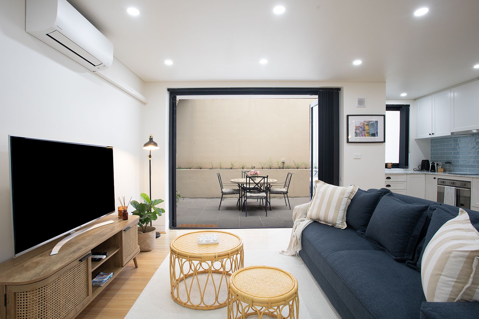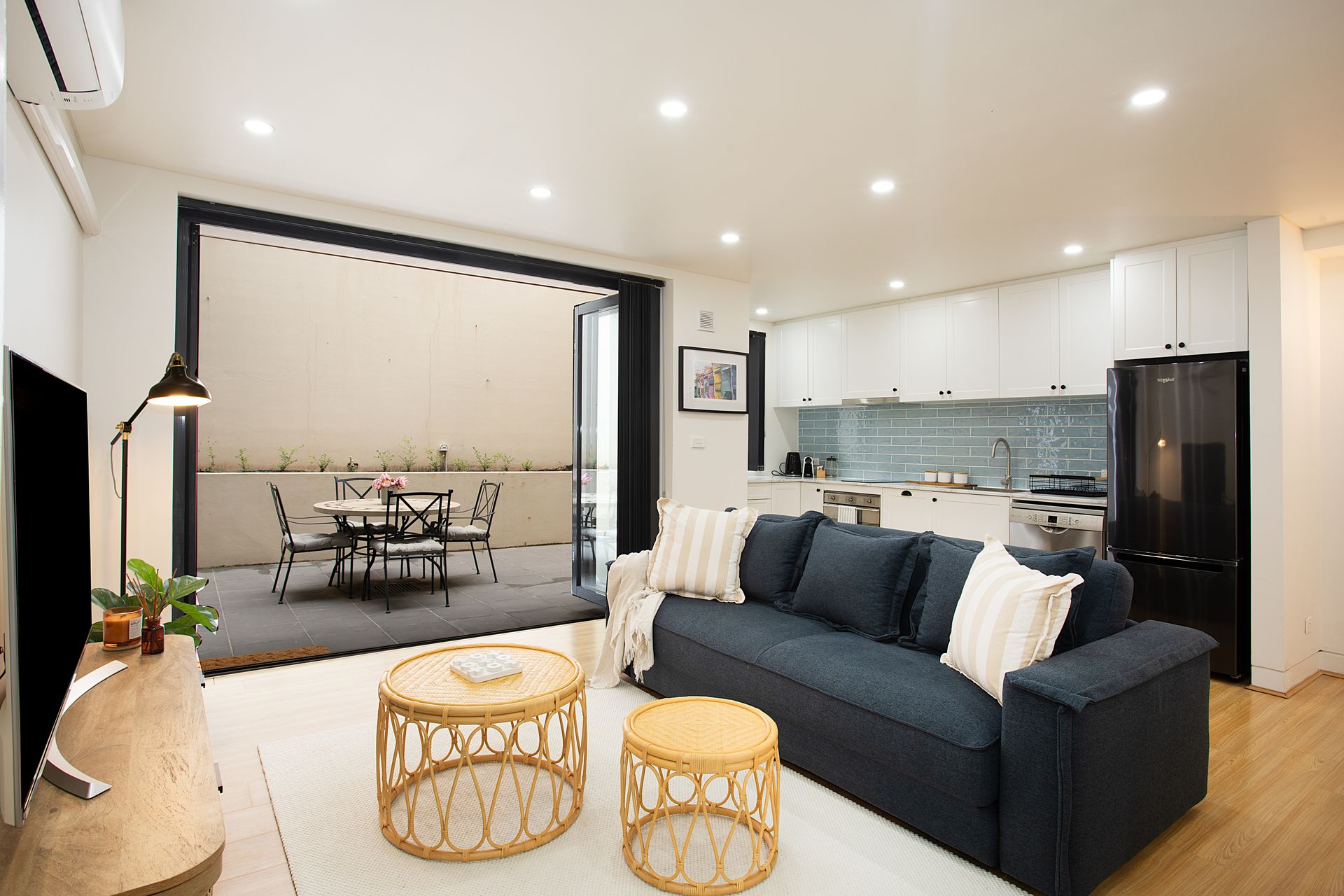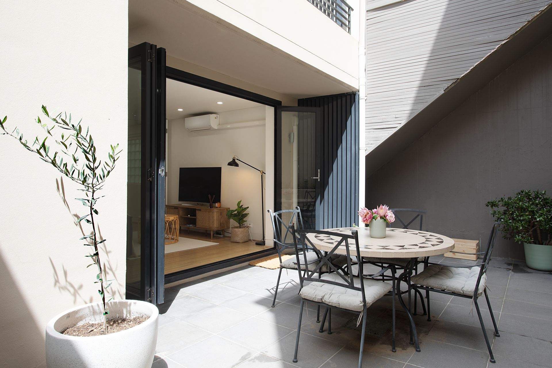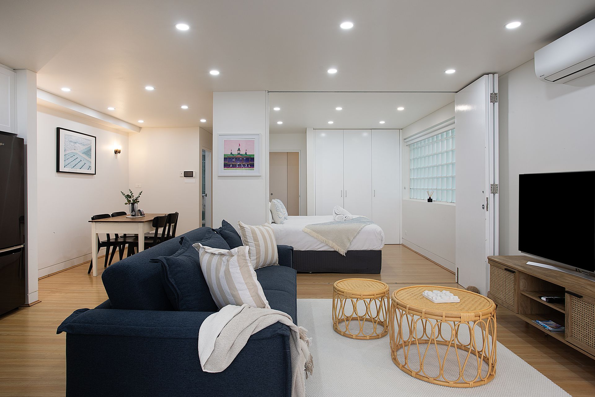 Positioned on the ground floor of a boutique Paddington building, this one bedroom residence demonstrates how considered design transforms compact living into something far more refined. The open plan flows from kitchen to living to sleeping quarters in a single uninterrupted sweep, where timber floors anchor a palette of whites, soft blues and natural textures. Floor to ceiling glazed doors dissolve the boundary between interior and courtyard, extending the living space into the protected outdoor zone.