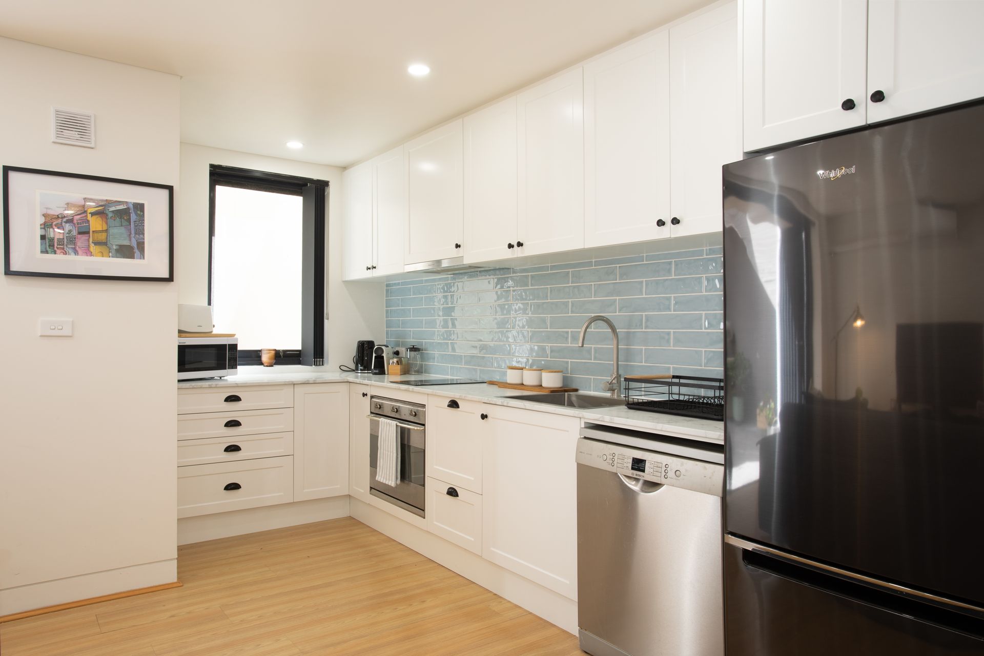 The kitchen runs along the interior wall with white shaker style cabinets extending floor to ceiling, their black cup handles providing subtle contrast. Blue subway tiles cover the backsplash in a running bond pattern, adding the only strong colour note in the kitchen. Stone benchtops in soft grey flank the integrated stainless steel sink, while a stainless steel oven, cooktop and integrated dishwasher handle all cooking requirements. A small round dining table in pale timber sits between kitchen and living zones, with the courtyard table taking over for proper meals when weather permits.