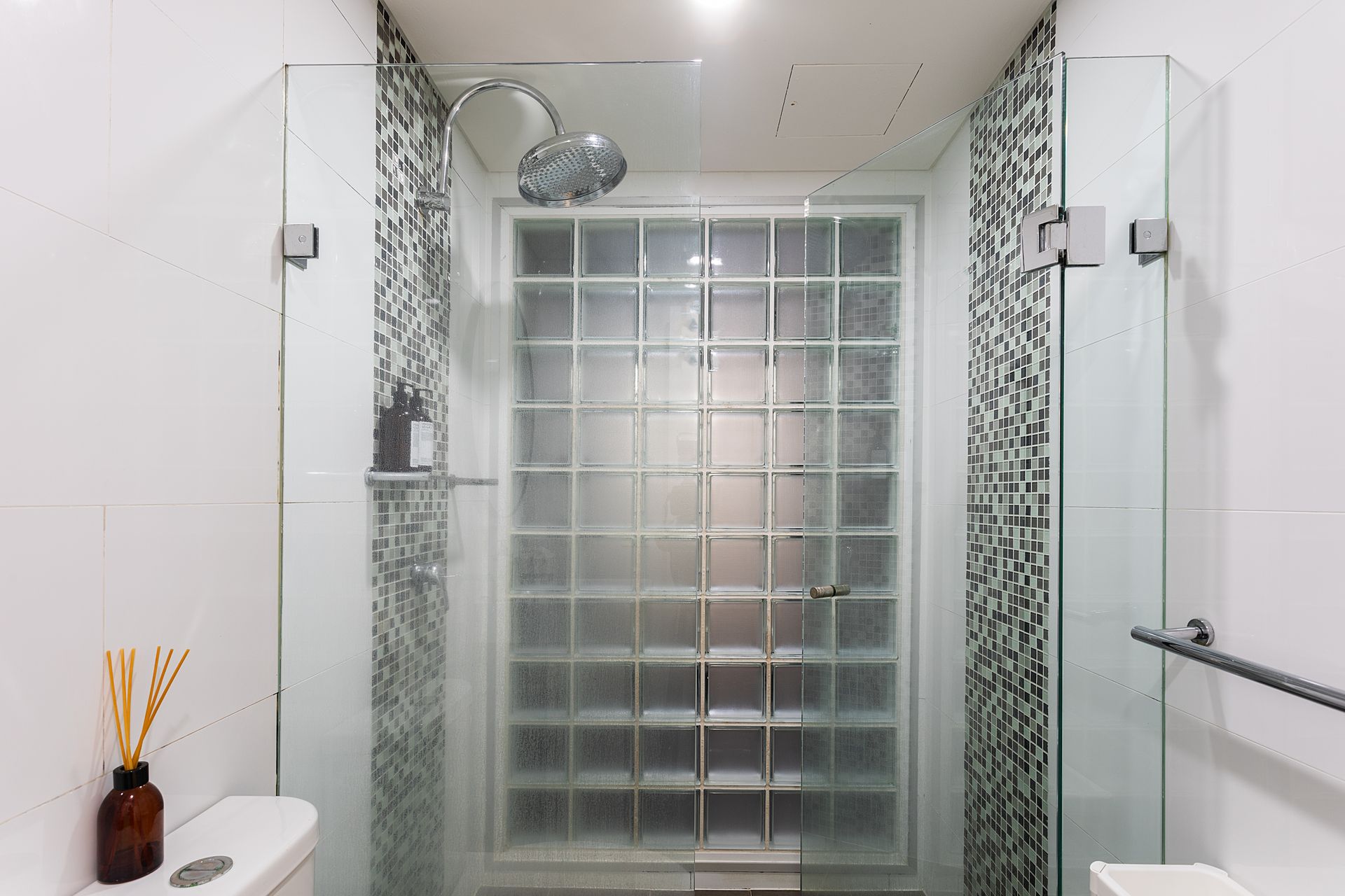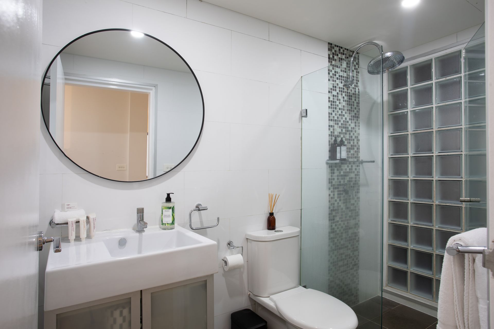 The bathroom features large format white tiles in matte finish, with a glass brick panel filtering natural light beside the shower. A circular mirror with black frame hangs above a white wall mounted basin, while chrome tapware and a frameless glass shower screen maintain clean lines throughout. The European laundry houses washer and dryer behind closed doors, and ducted air conditioning maintains comfort through Sydney's seasonal shifts.